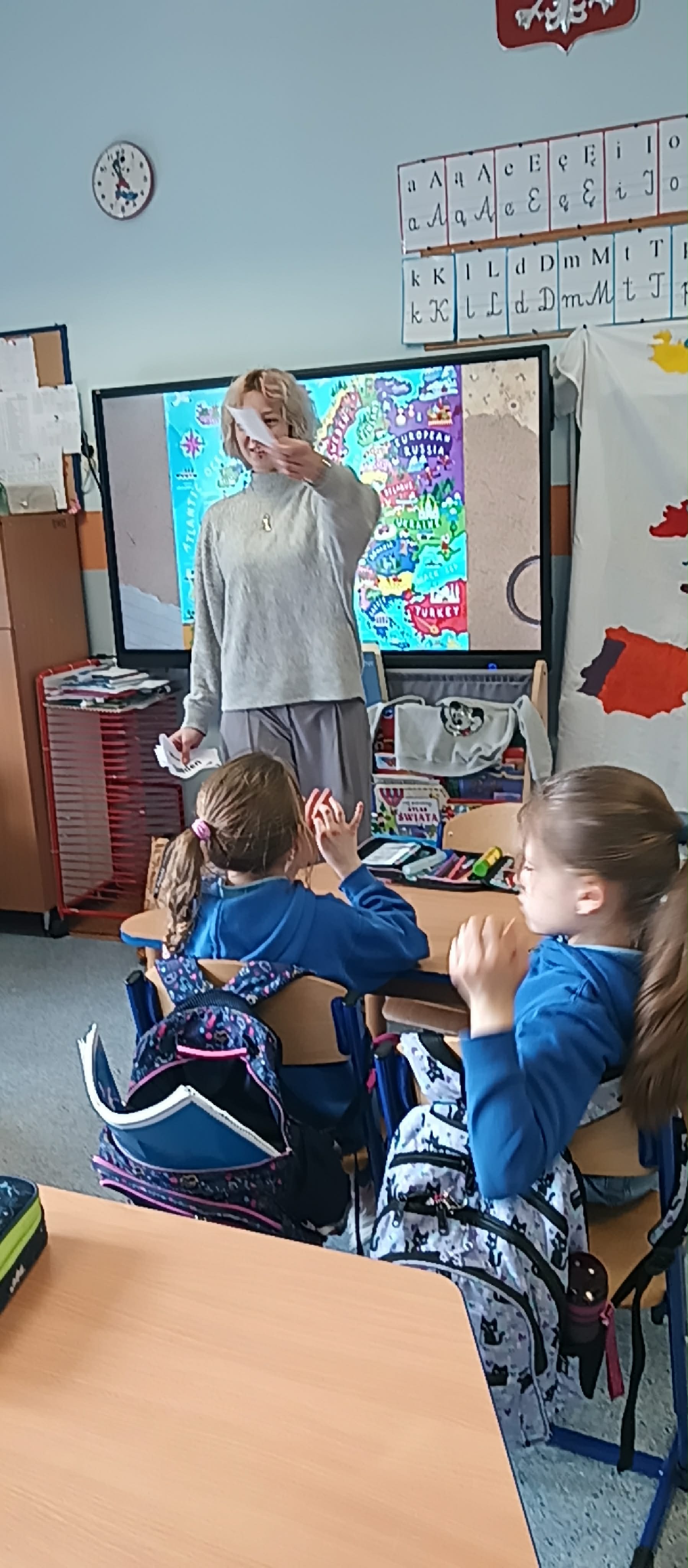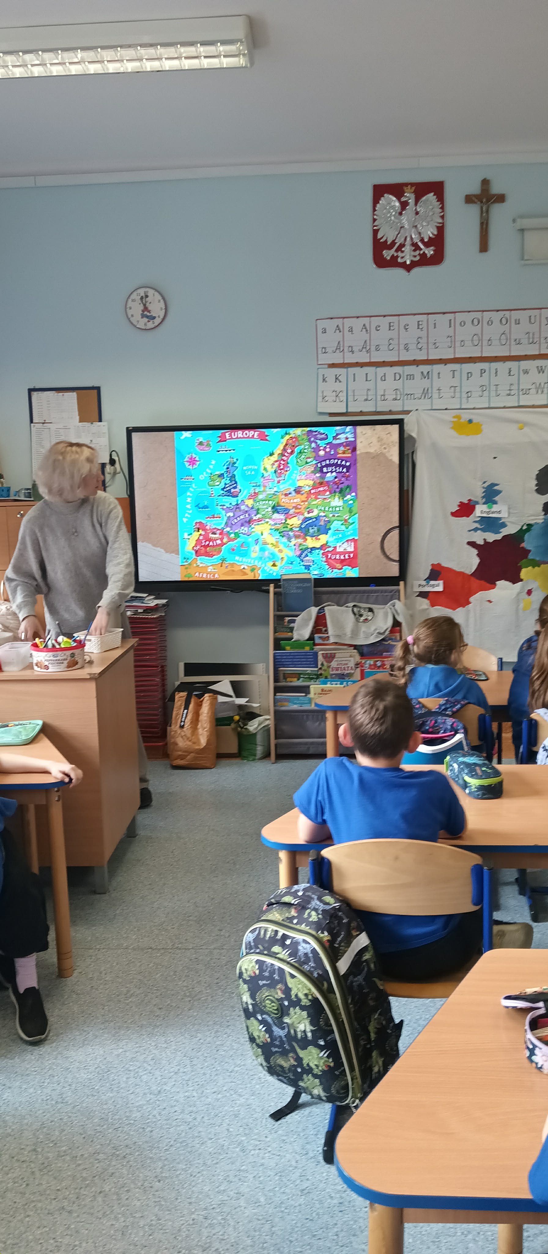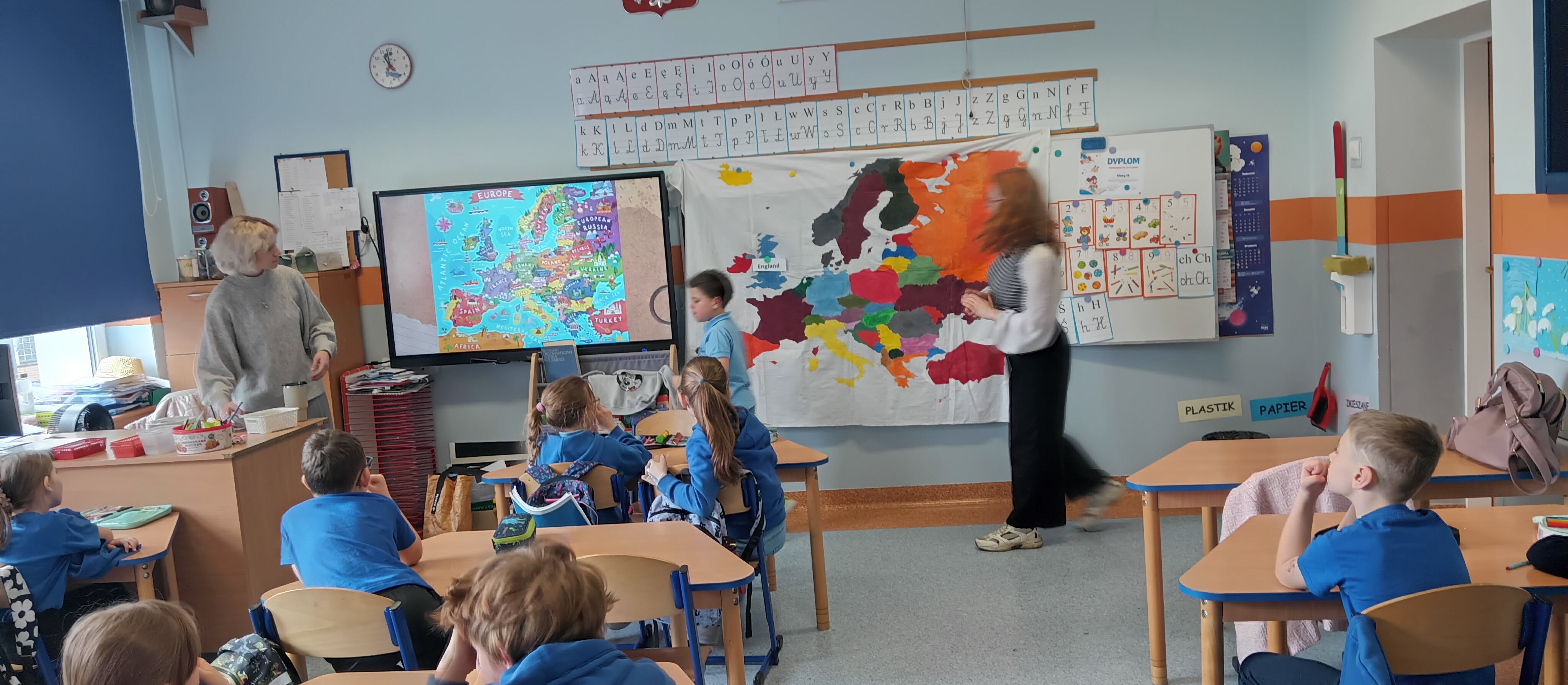 Klasa 1b także w II semestrze uczestniczy w projekcie przygotowanym przez wolontariuszki Europejskiego Korpusu Solidarności. 17 marca uczniowie poznawali stolice oraz flagi europejskich państw.