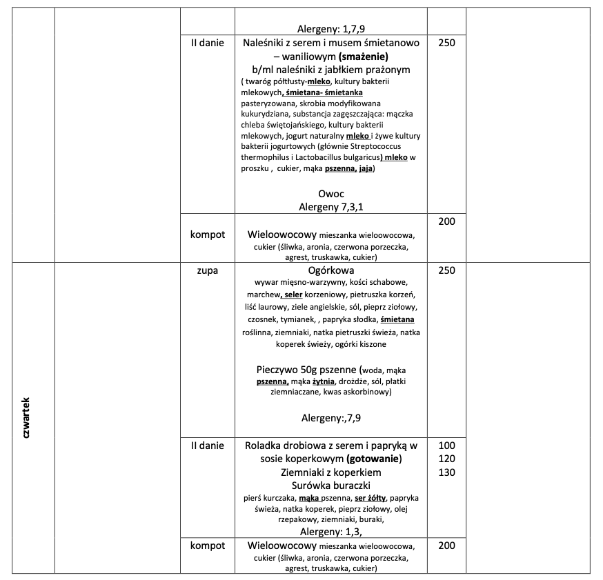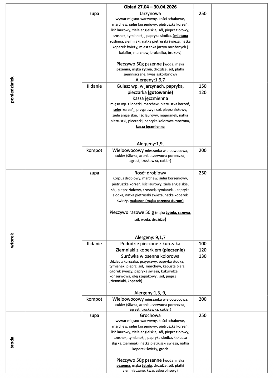 Jadłospis na tydzień 27 kwietnia - 30 kwietnia 2026