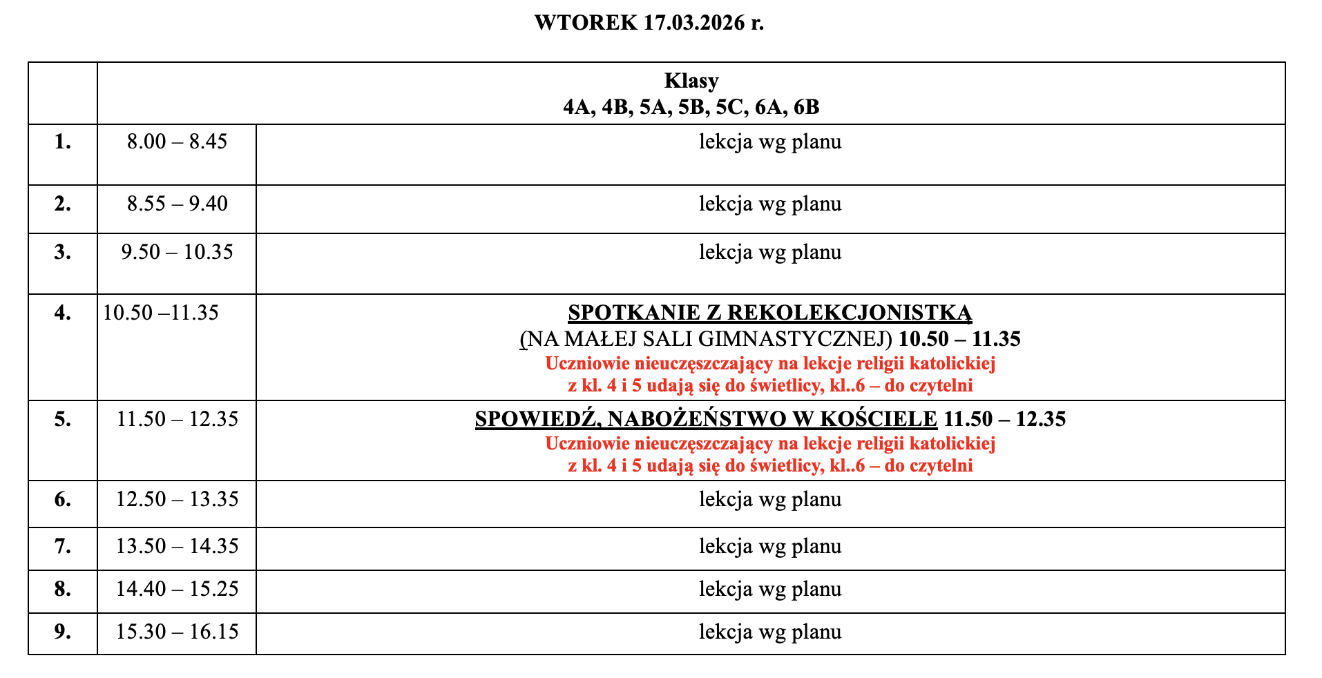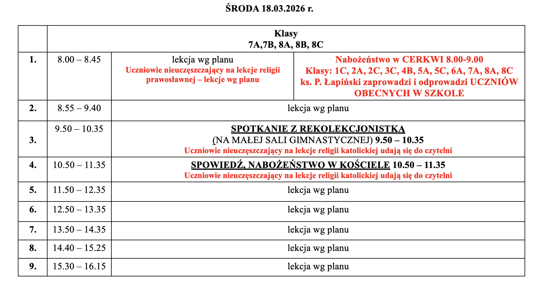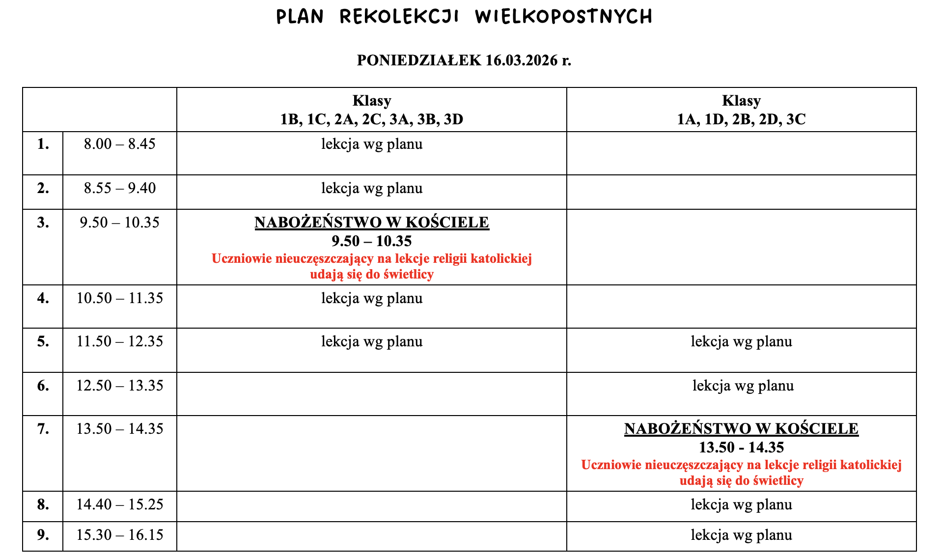 Harmonogram rekolekcji wielkopostnych 16-18.03.2026 r.
