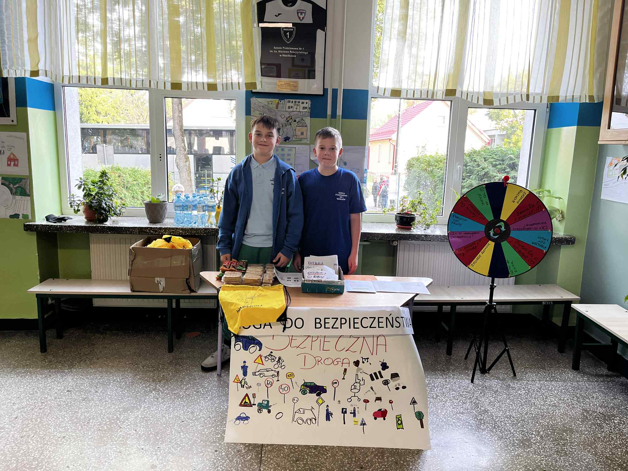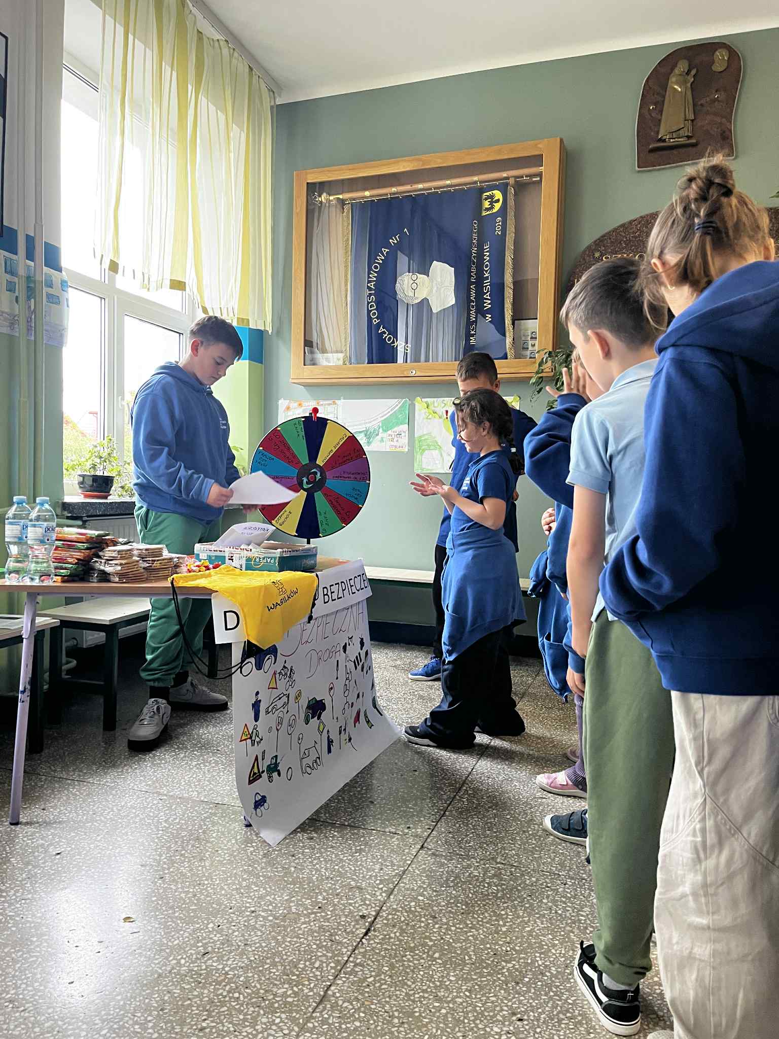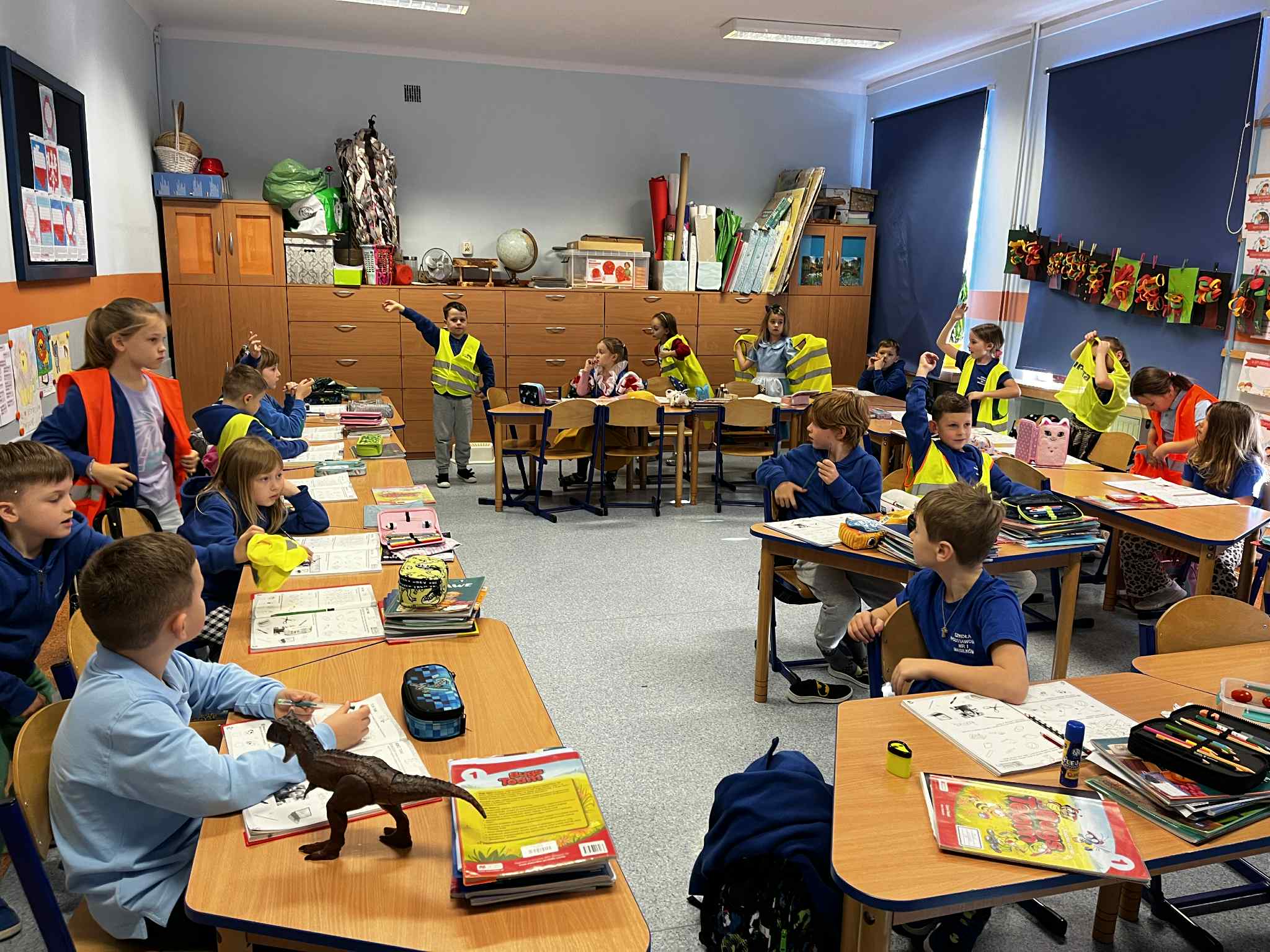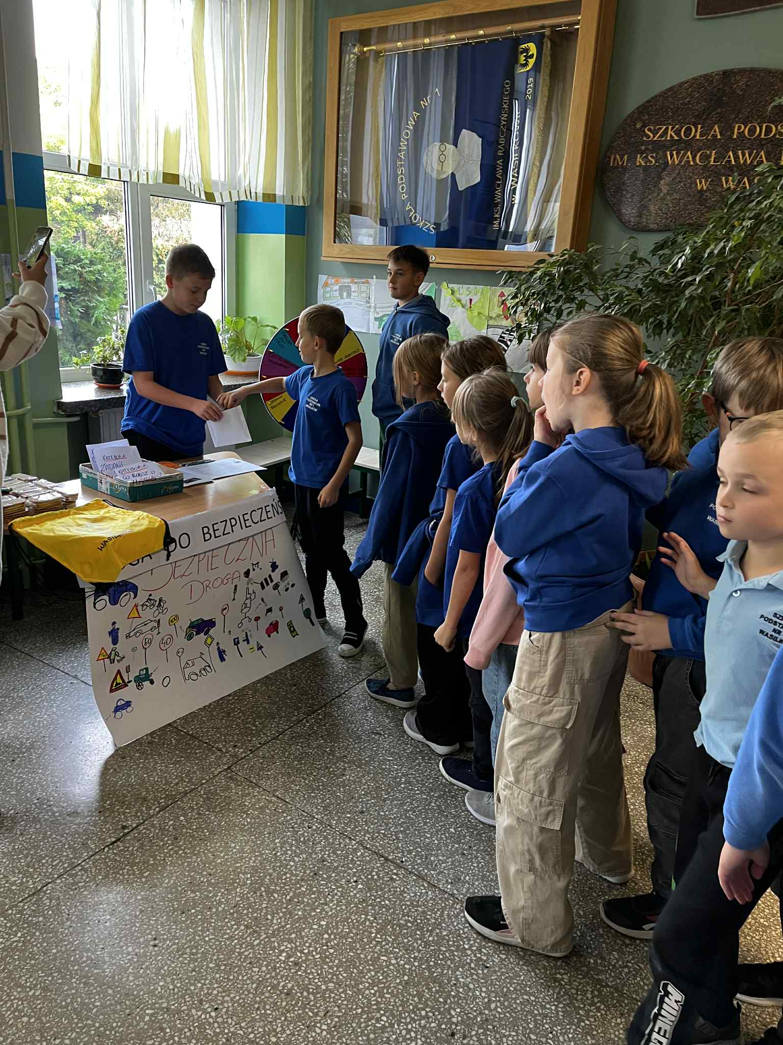 Nie zabrakło również konkursów i wydarzeń edukacyjnych. Dla najmłodszych uczniów zorganizowaliśmy konkurs plastyczny „Bezpieczna droga do szkoły”, w którym dzieci w niezwykle kreatywny sposób pokazały, jak dbają o swoje bezpieczeństwo. Starsze klasy 4–5 zmierzyły się natomiast w konkursie wiedzy o ruchu drogowym, udowadniając, że znajomość przepisów może być świetną zabawą.