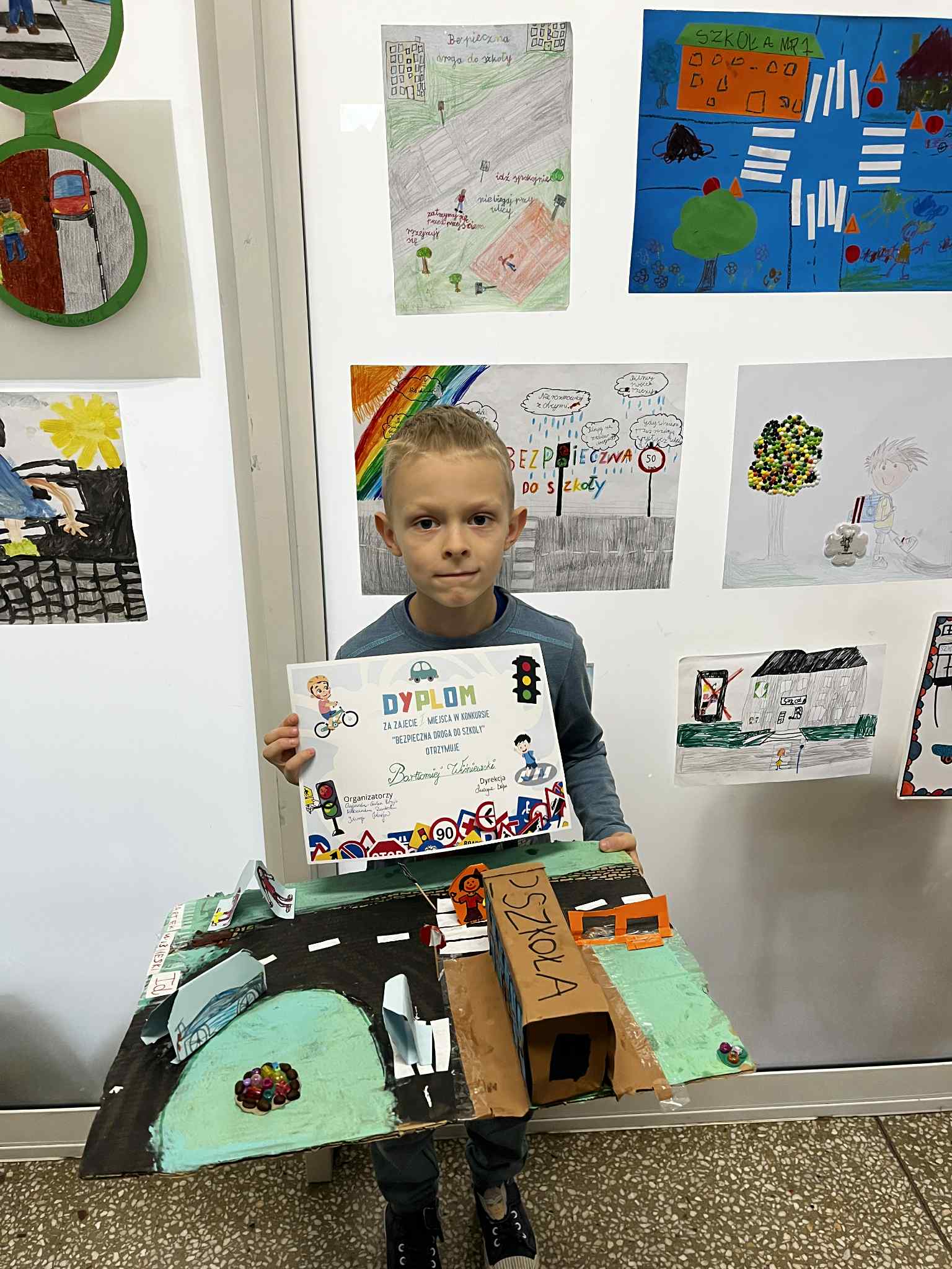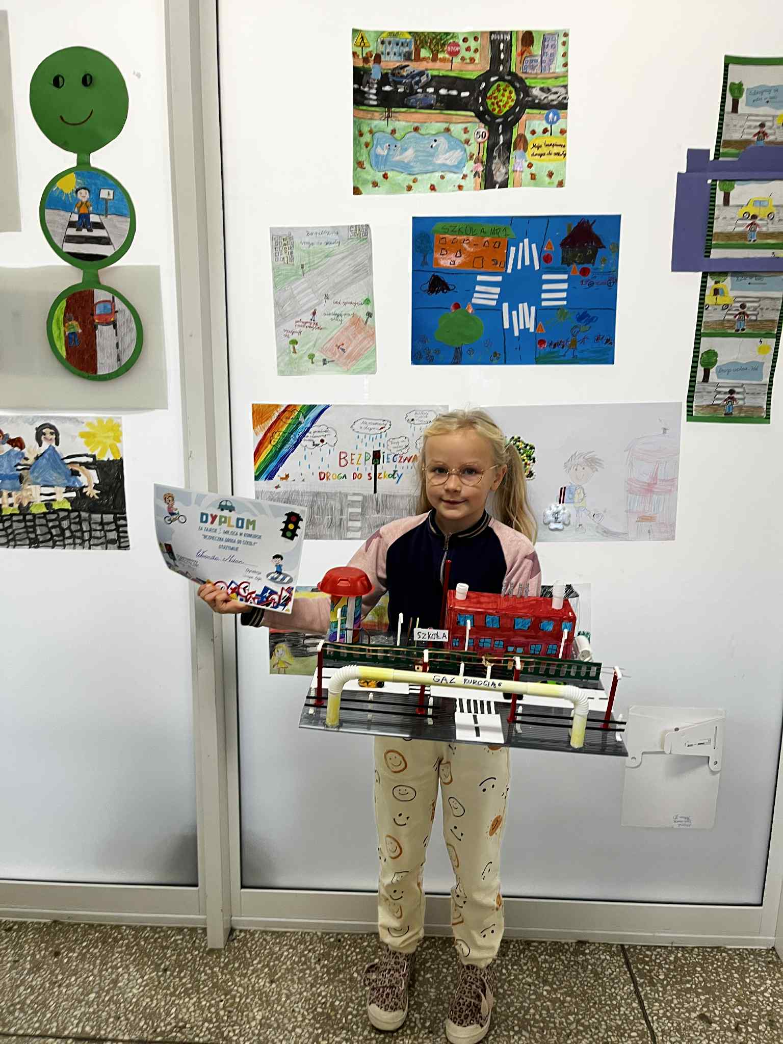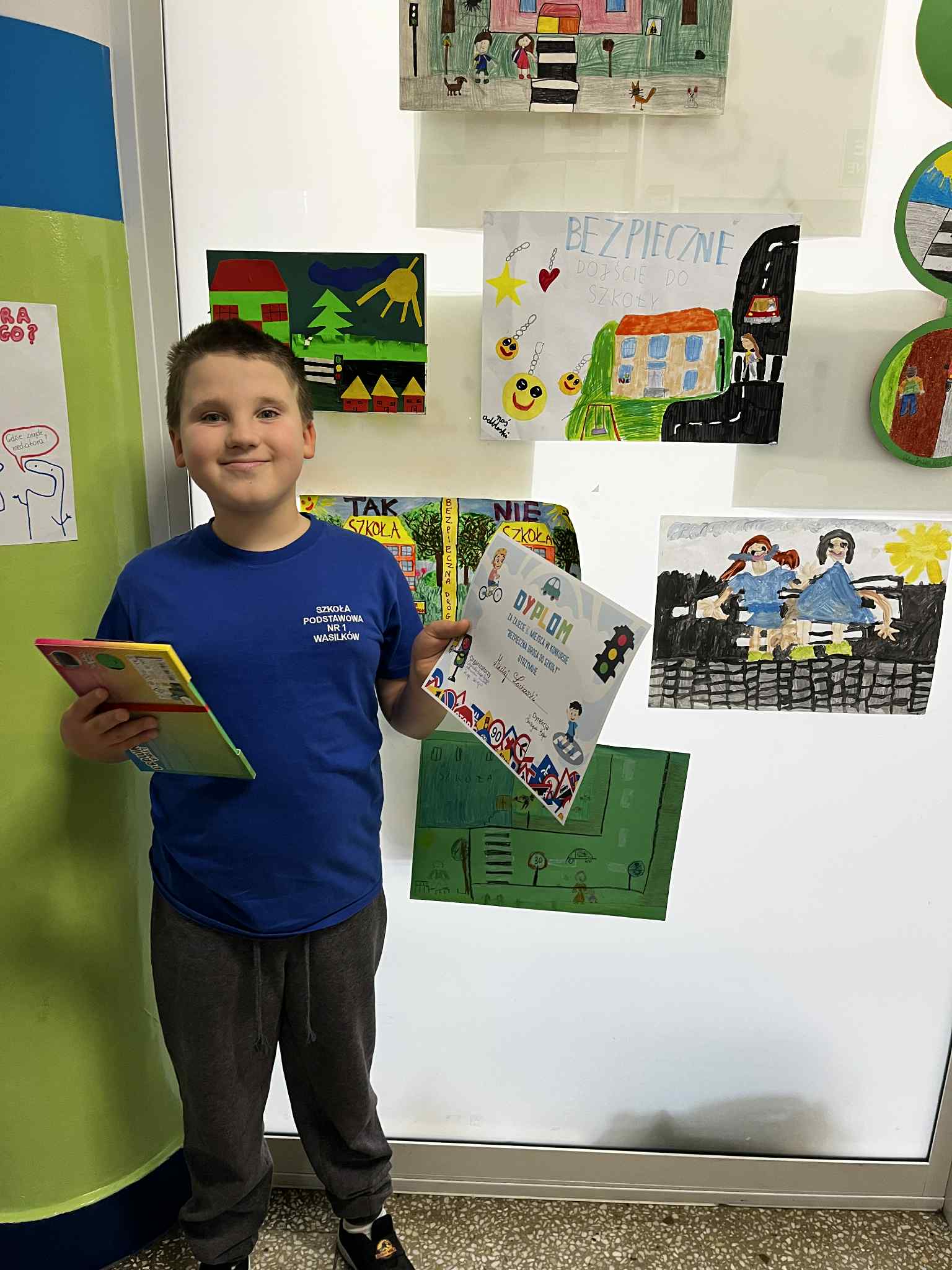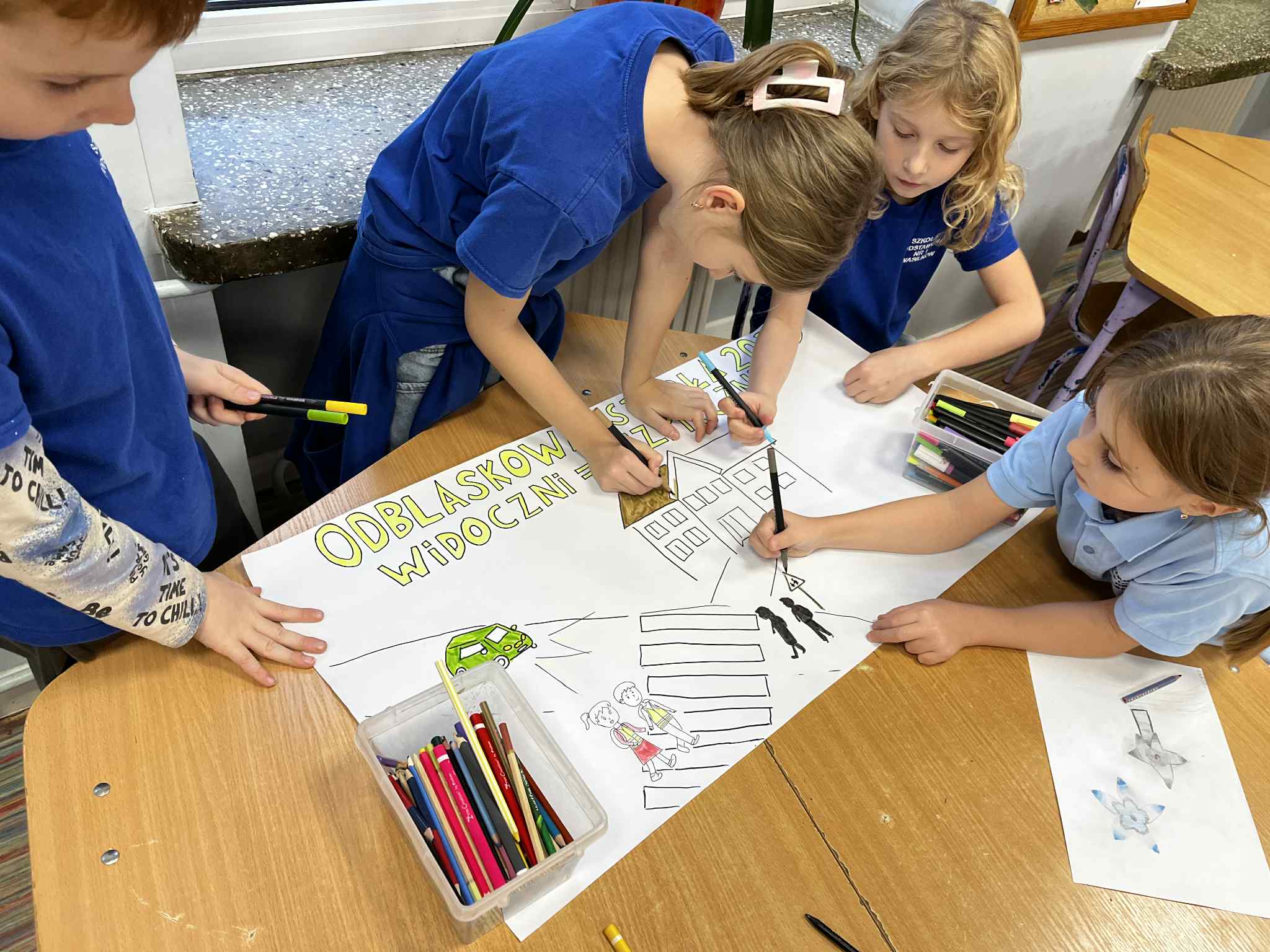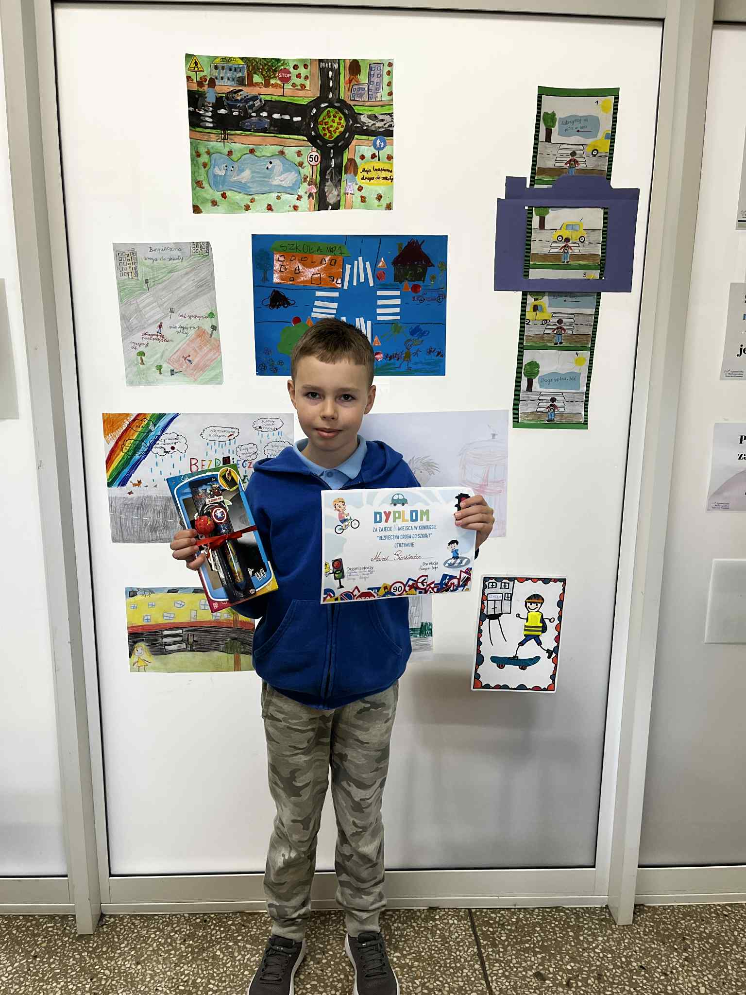 Nie zabrakło również konkursów i wydarzeń edukacyjnych. Dla najmłodszych uczniów zorganizowaliśmy konkurs plastyczny „Bezpieczna droga do szkoły”, w którym dzieci w niezwykle kreatywny sposób pokazały, jak dbają o swoje bezpieczeństwo. Starsze klasy 4–5 zmierzyły się natomiast w konkursie wiedzy o ruchu drogowym, udowadniając, że znajomość przepisów może być świetną zabawą.