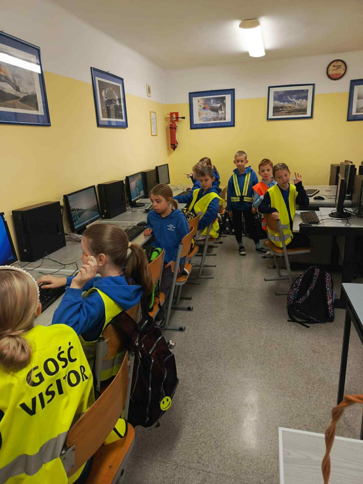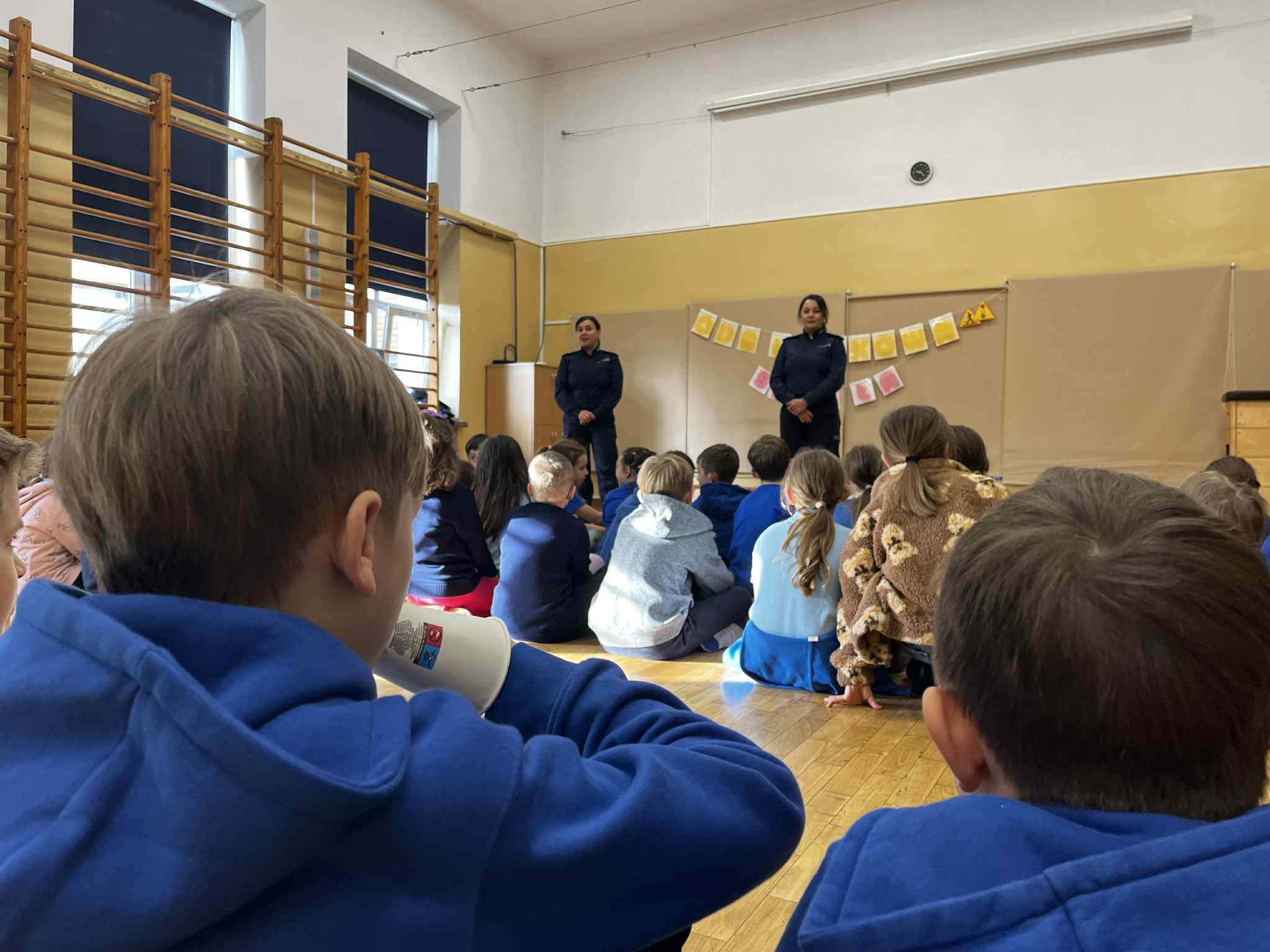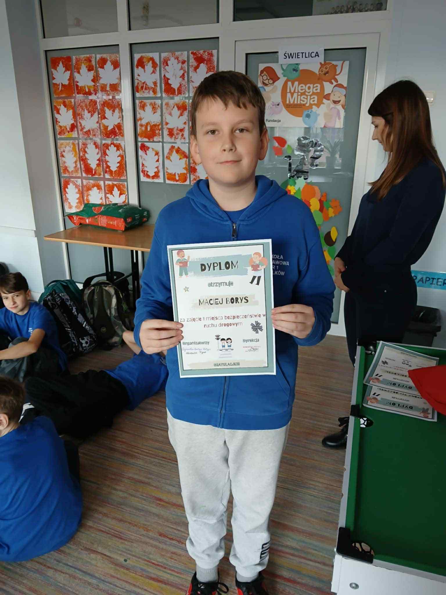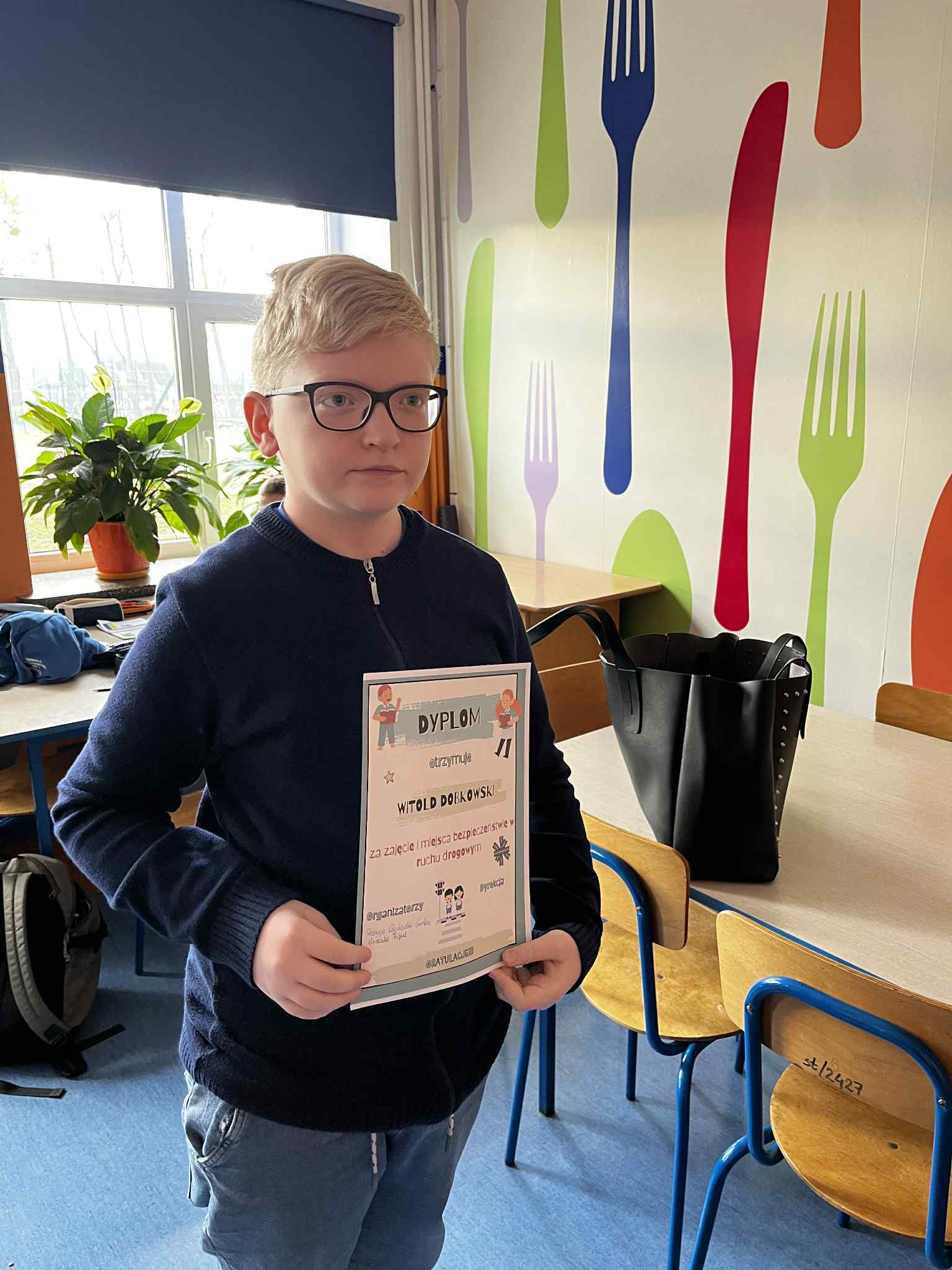 Nie zabrakło również konkursów i wydarzeń edukacyjnych. Dla najmłodszych uczniów zorganizowaliśmy konkurs plastyczny „Bezpieczna droga do szkoły”, w którym dzieci w niezwykle kreatywny sposób pokazały, jak dbają o swoje bezpieczeństwo. Starsze klasy 4–5 zmierzyły się natomiast w konkursie wiedzy o ruchu drogowym, udowadniając, że znajomość przepisów może być świetną zabawą.
