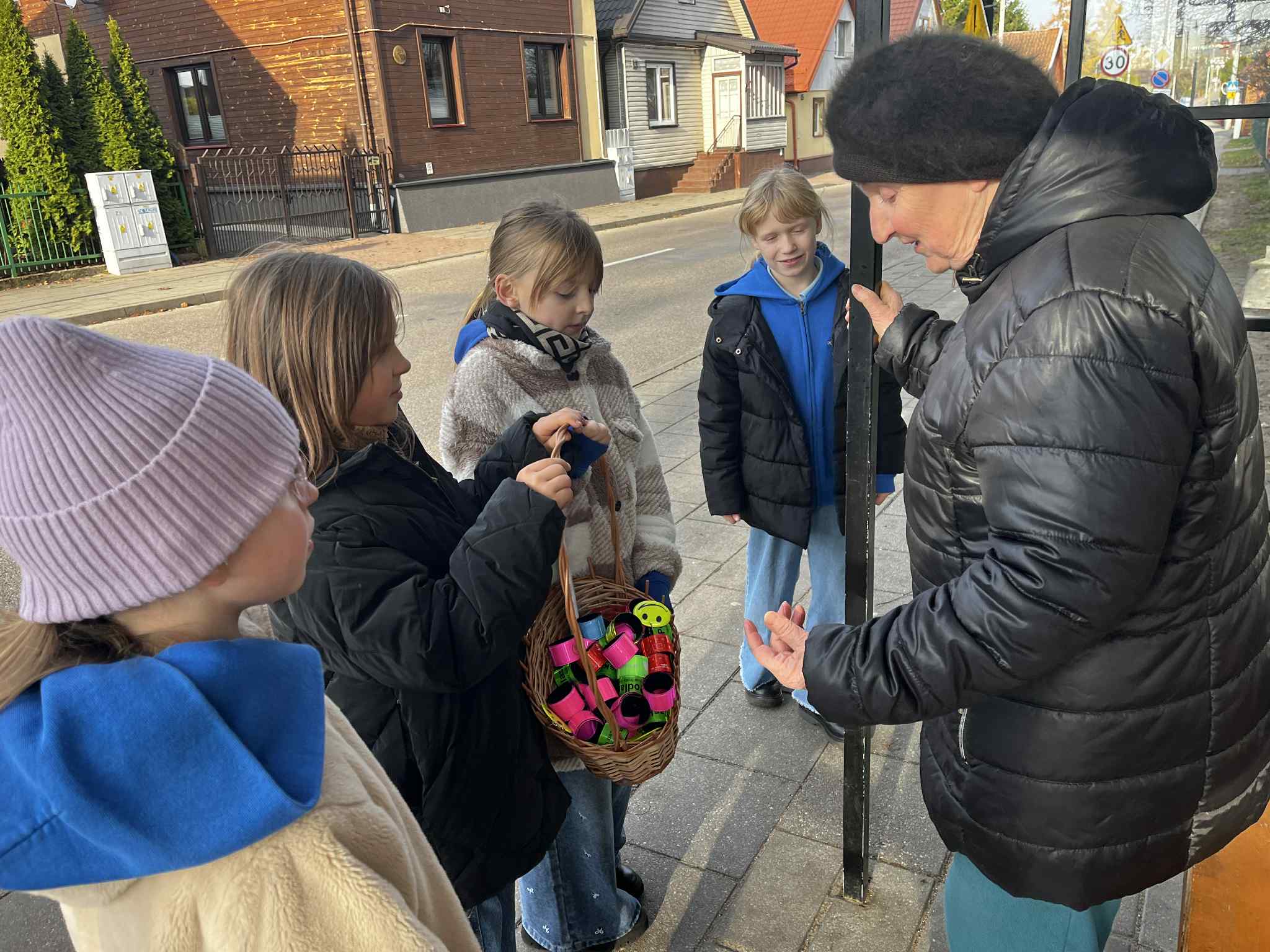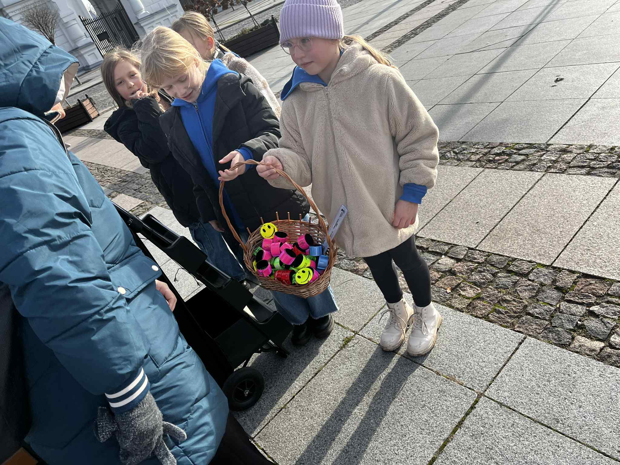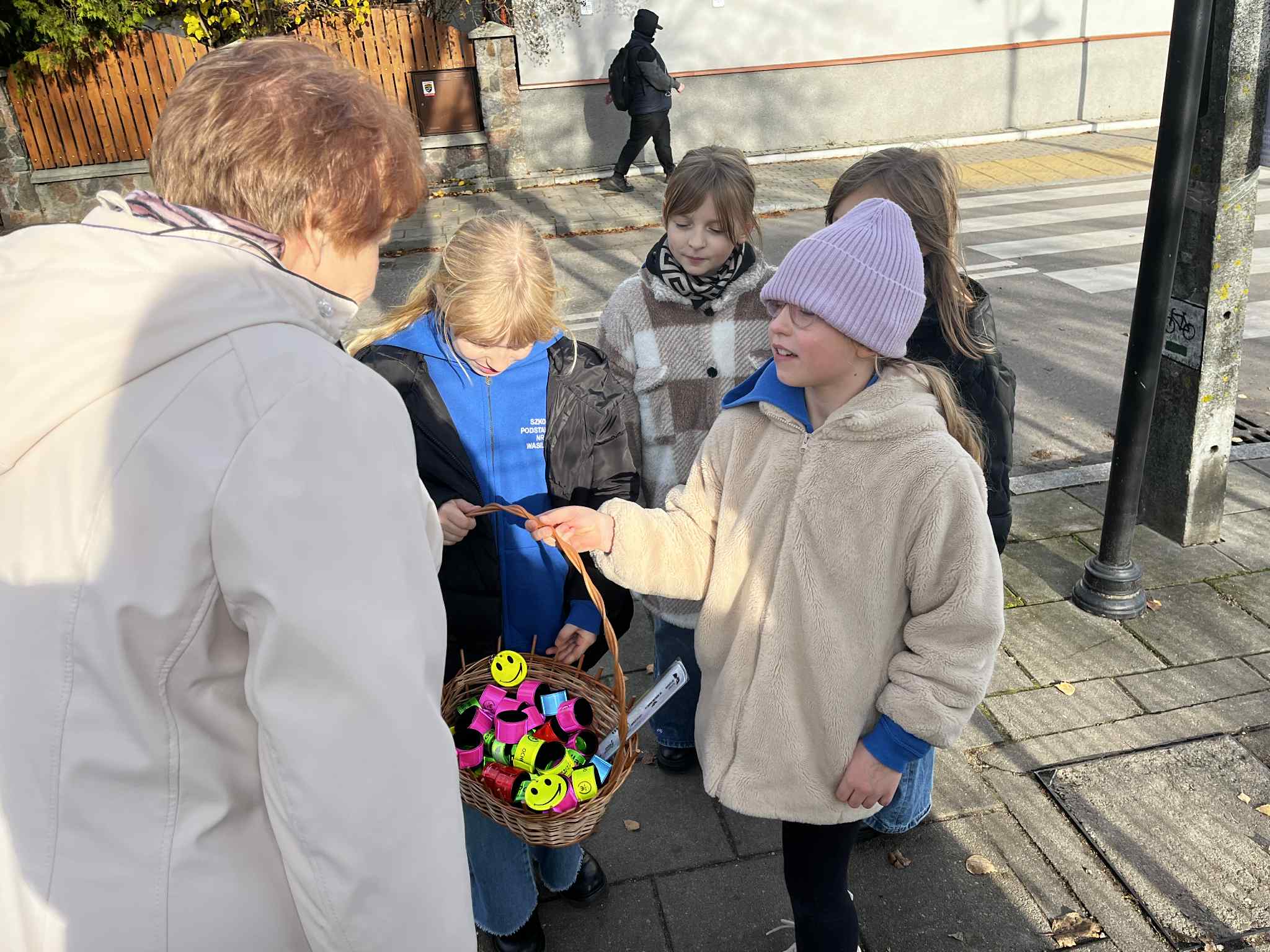 Wyruszyliśmy również na spacer po Wasilkowie, podczas którego uczniowie rozdawali odblaski seniorom i przechodniom. To była świetna okazja, by porozmawiać o bezpieczeństwie i zachęcić mieszkańców do noszenia elementów odblaskowych po zmroku.