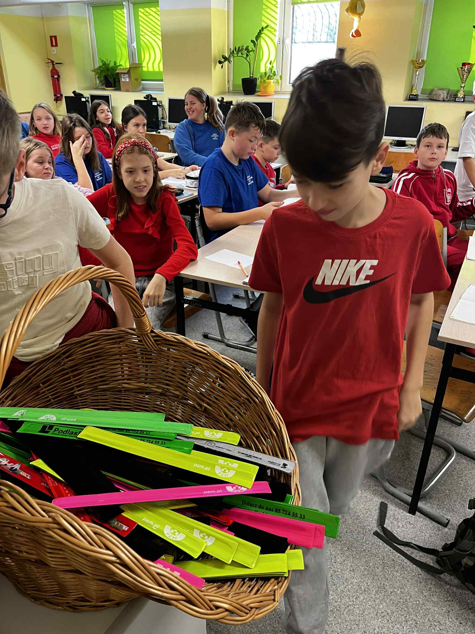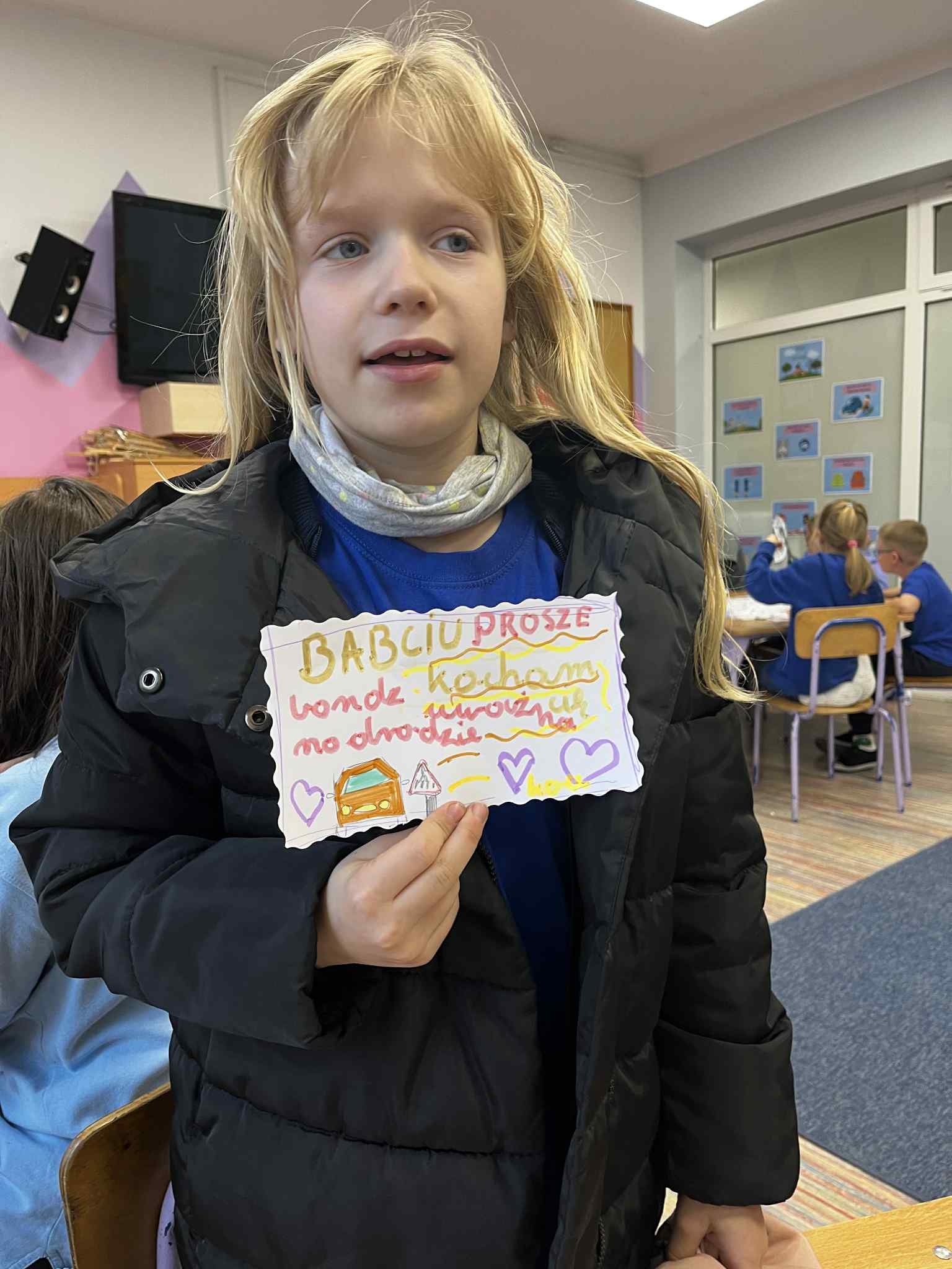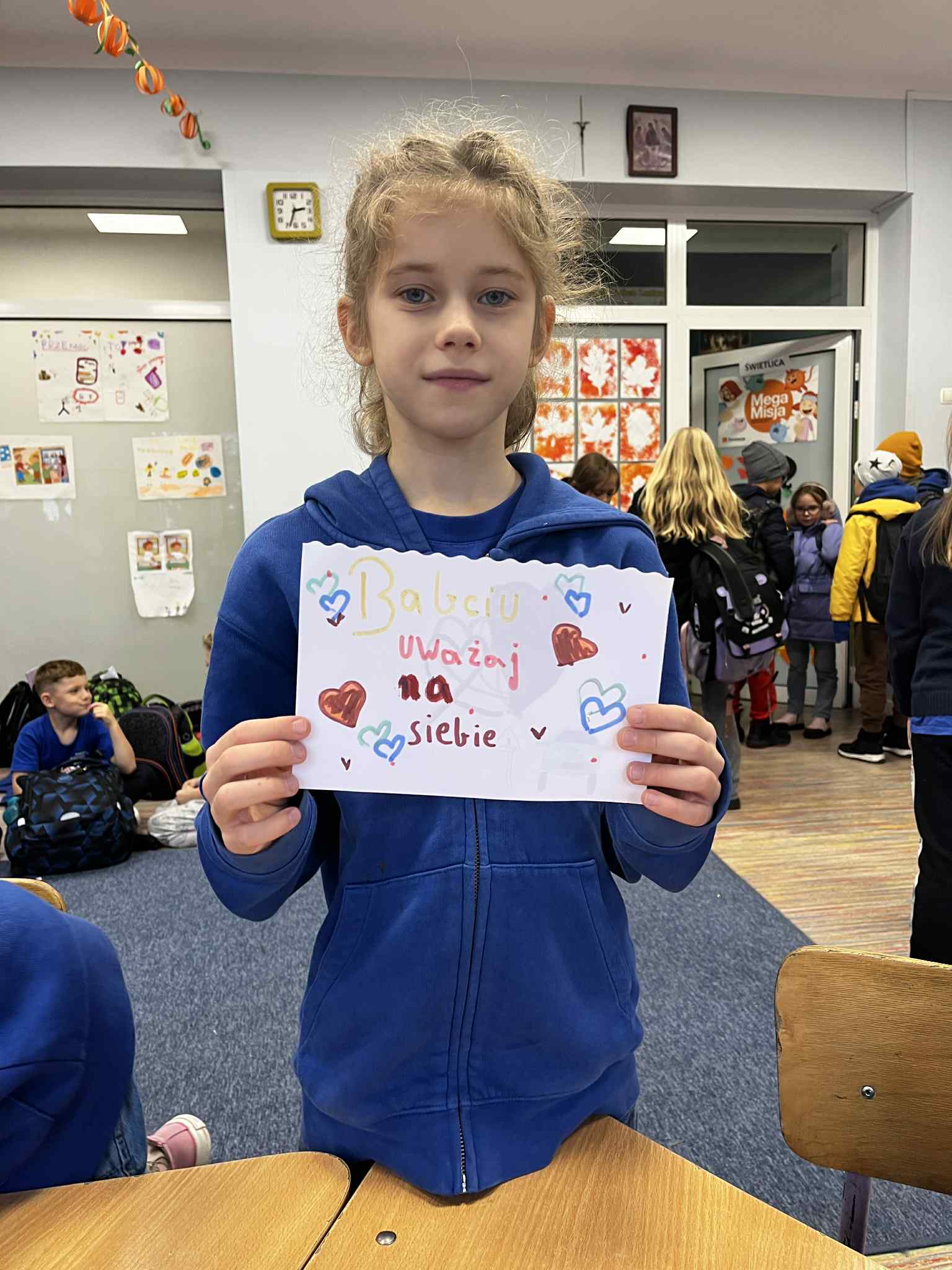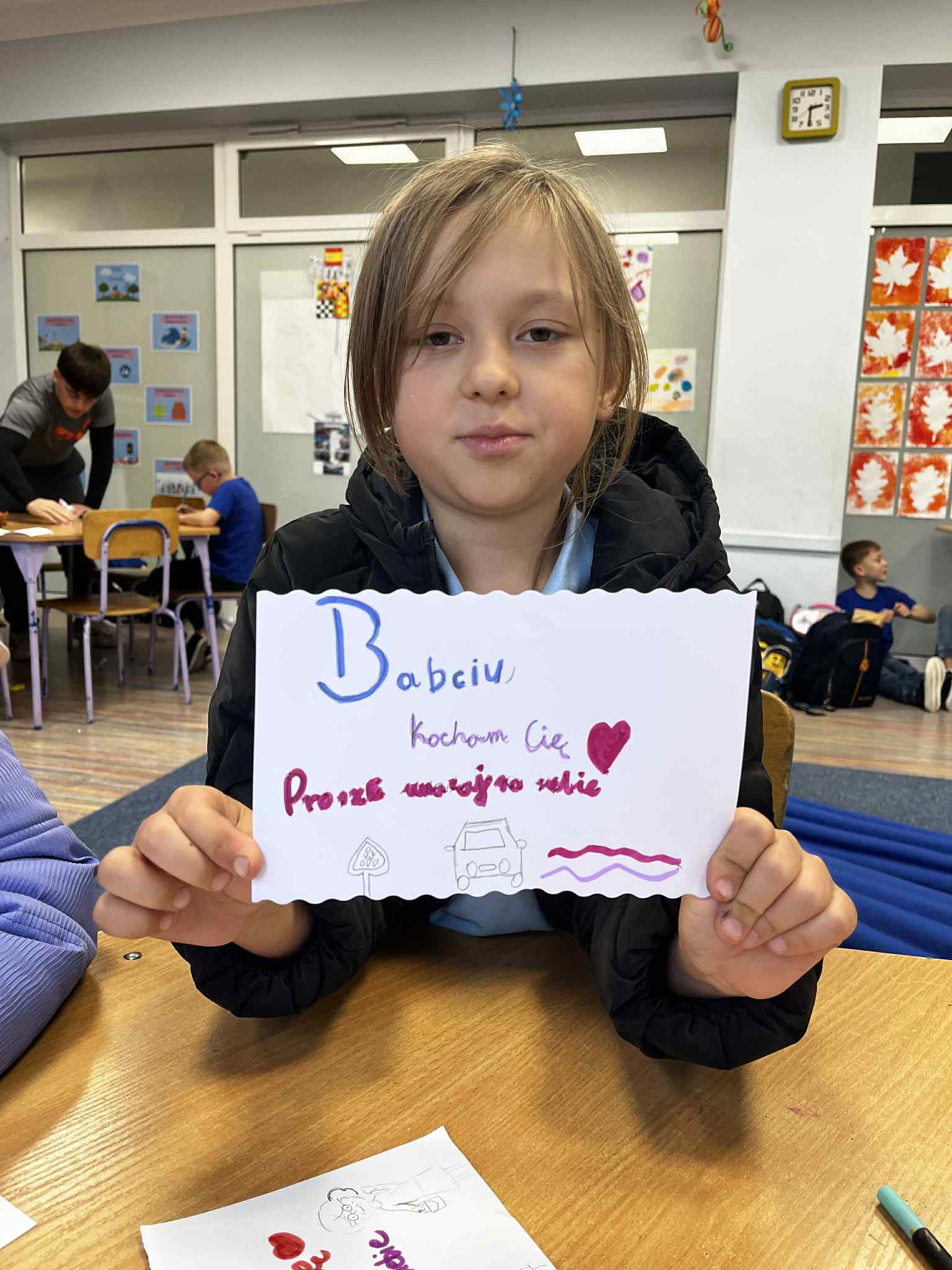 Nasze działania nie ograniczyły się tylko do terenu szkoły. Uczennice klasy 7 odwiedziły Wasilkowskie Centrum Seniora, gdzie przeprowadziły zajęcia o bezpieczeństwie pieszych i wręczyły uczestnikom odblaski. Najmłodsi uczniowie z kolei przygotowali pocztówki dla babć z przesłaniem „Babciu, kocham Cię – uważaj na drodze”, przypominając, że troska o bezpieczeństwo nie ma wieku.