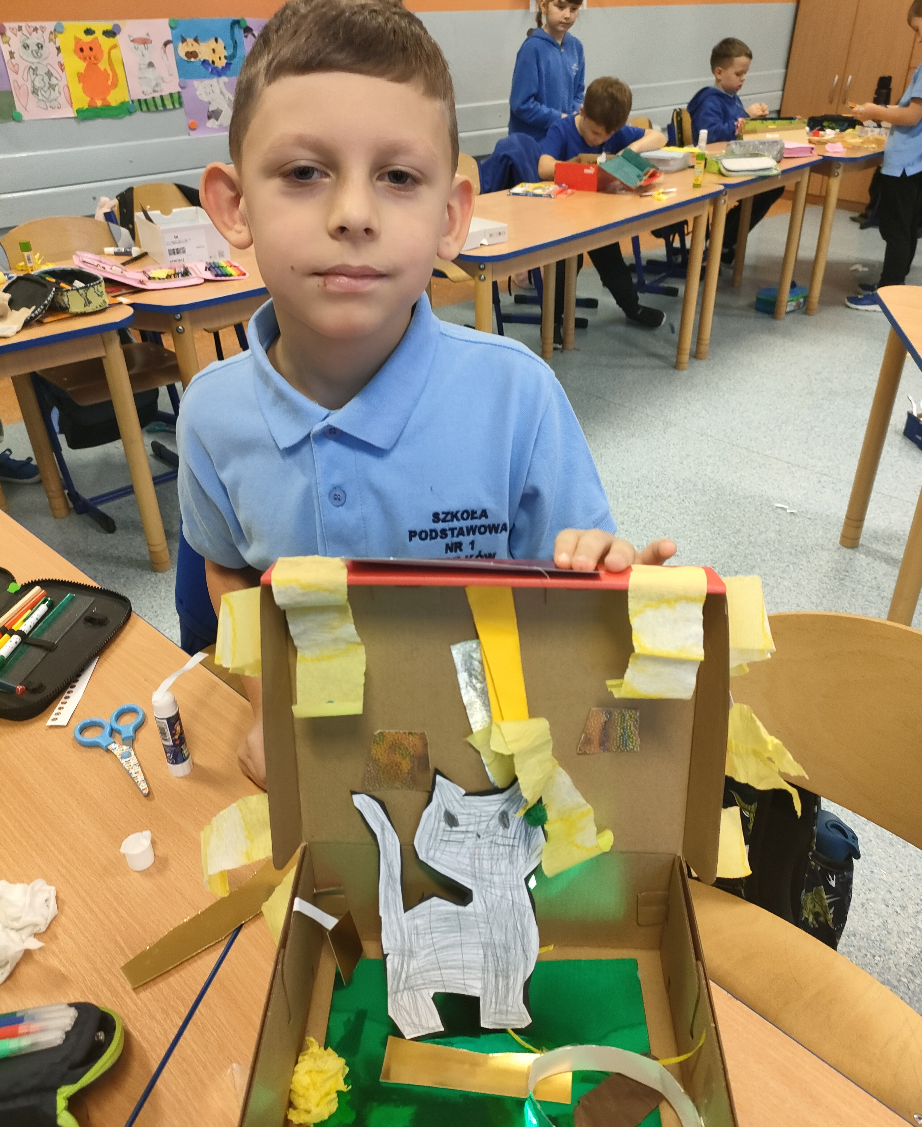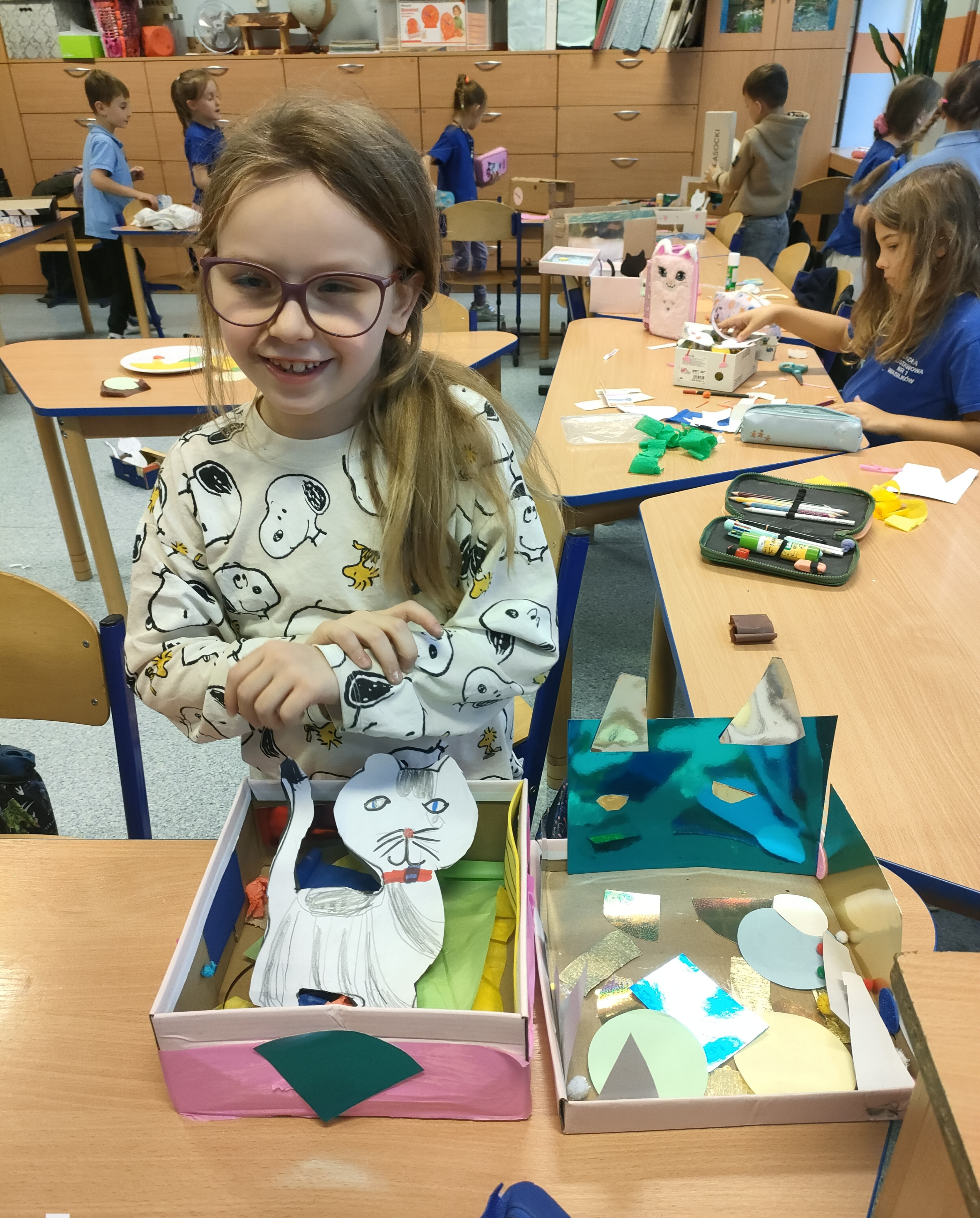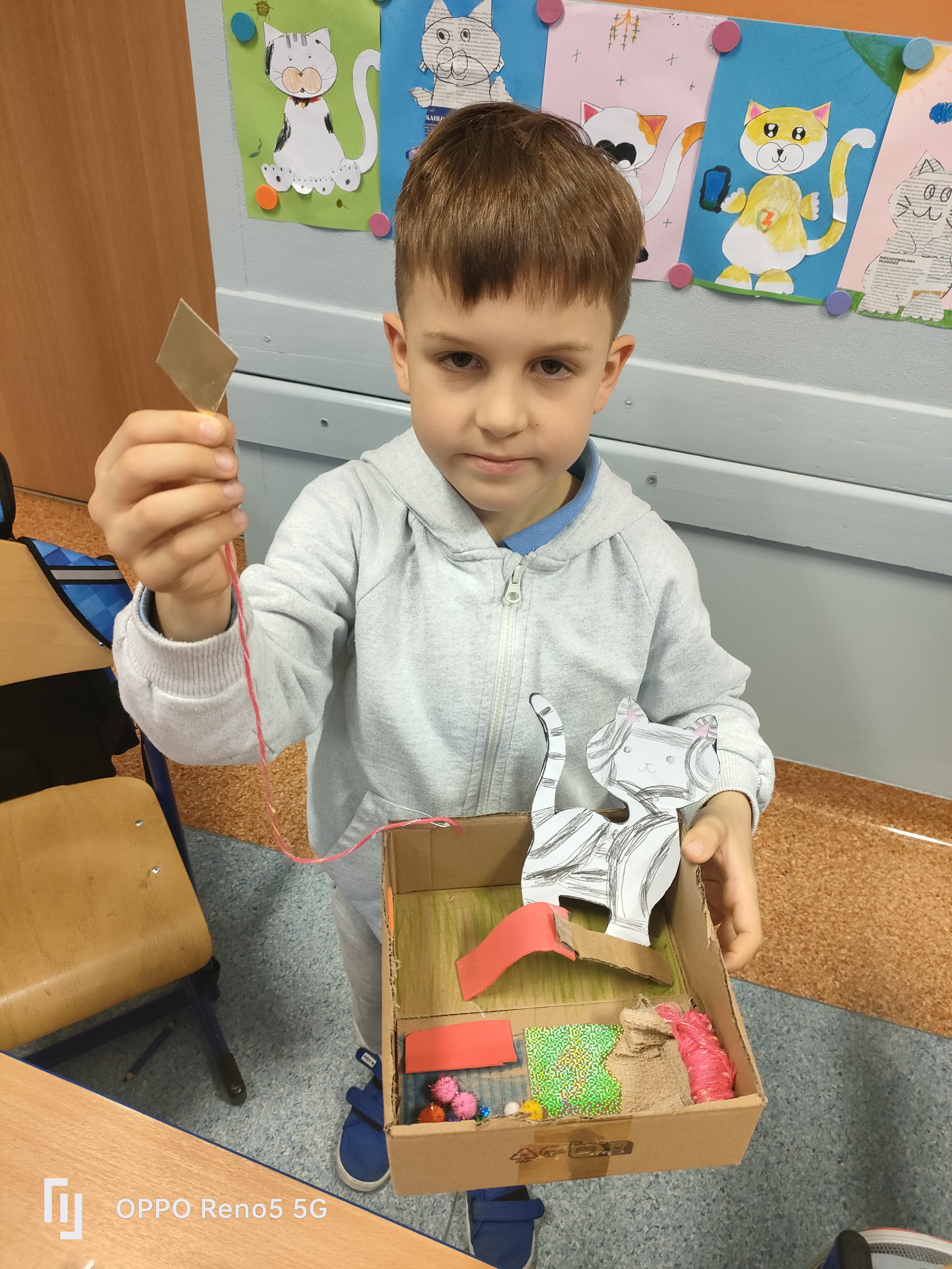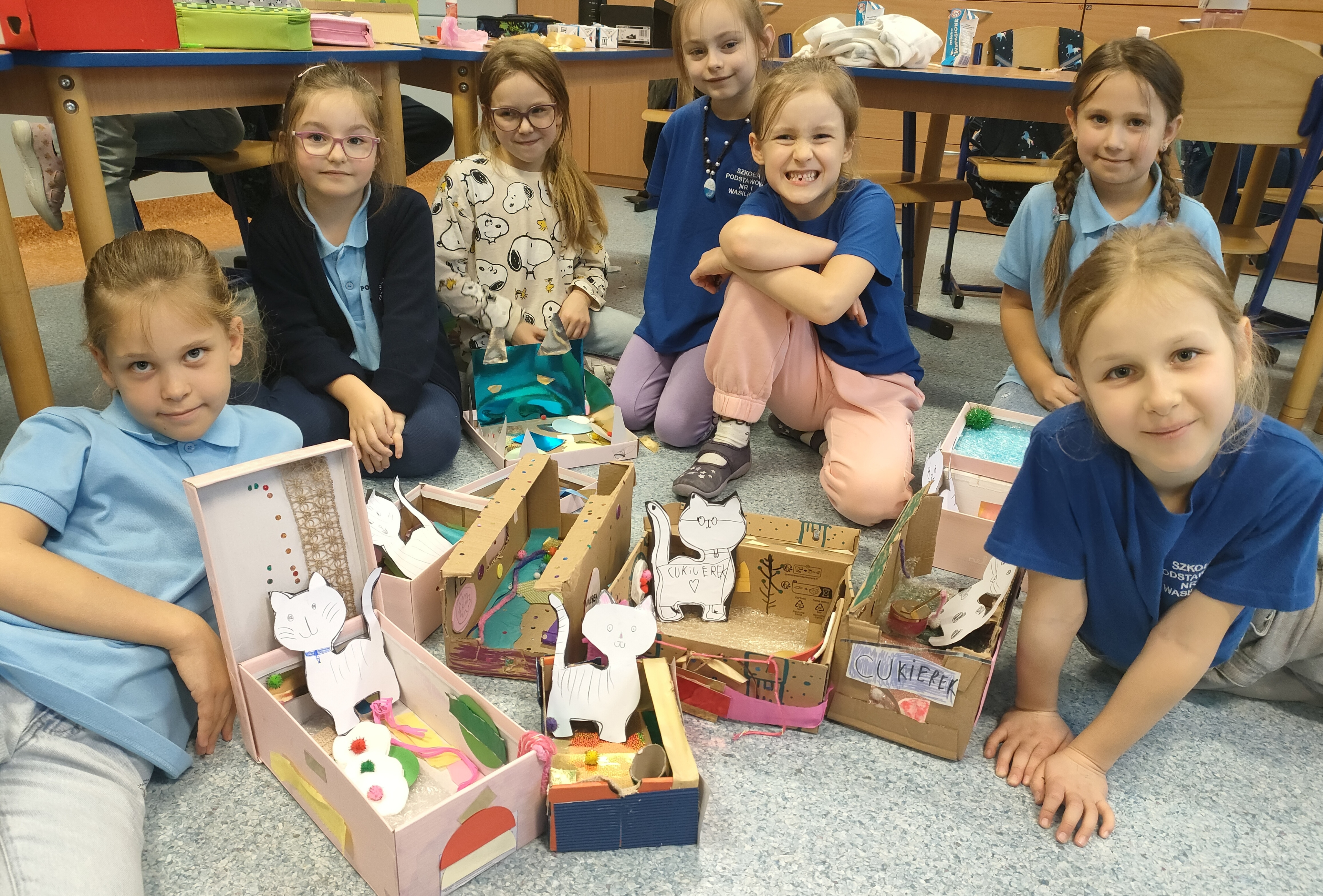 W ostatni dzień zajęć na uczniów czekało wyjątkowe zadanie — każdy samodzielnie stworzył z kartonu domek dla Cukierka! Pomysłów było mnóstwo, a w sali panowała twórcza atmosfera, pełna śmiechu, radości i świetnej zabawy.