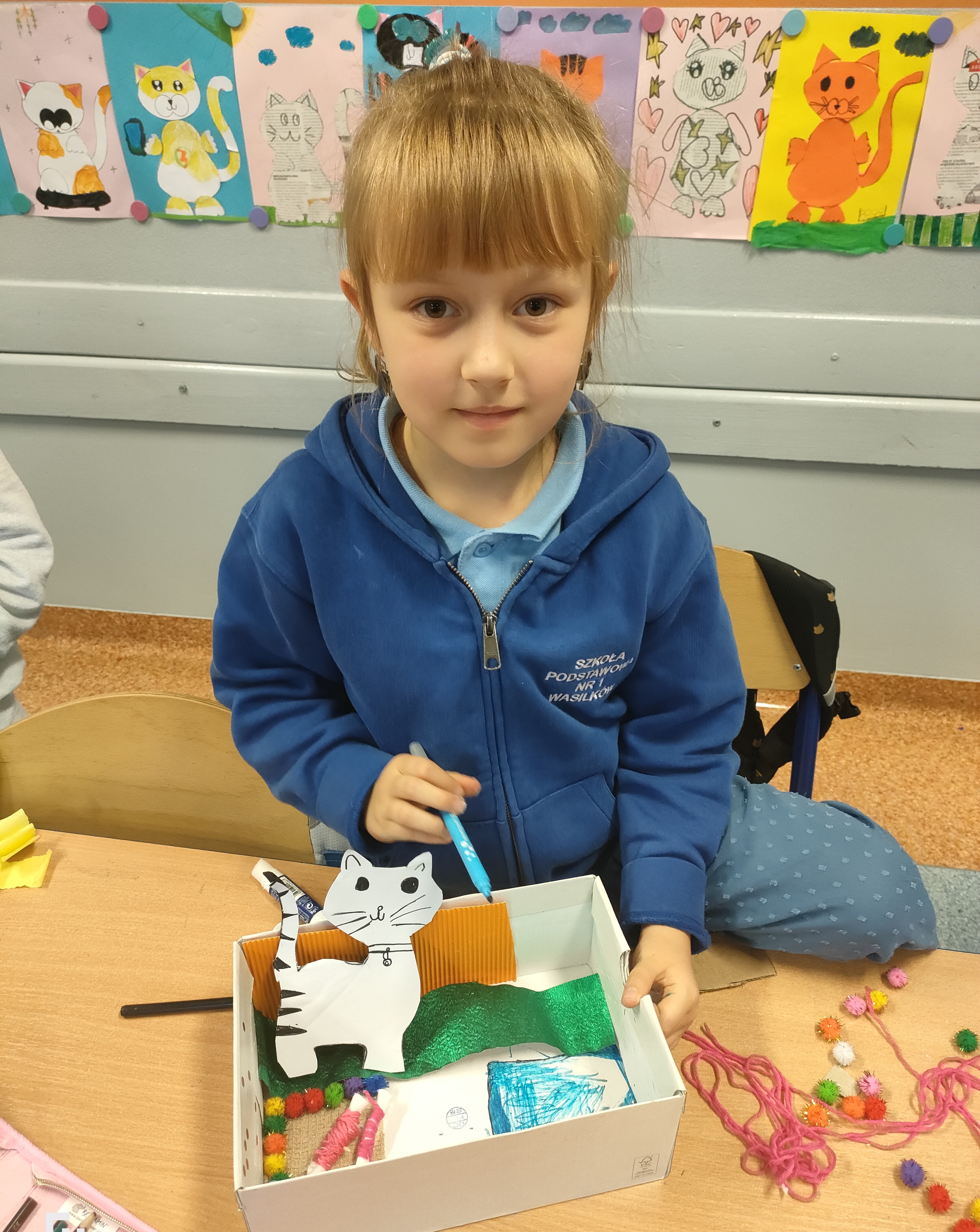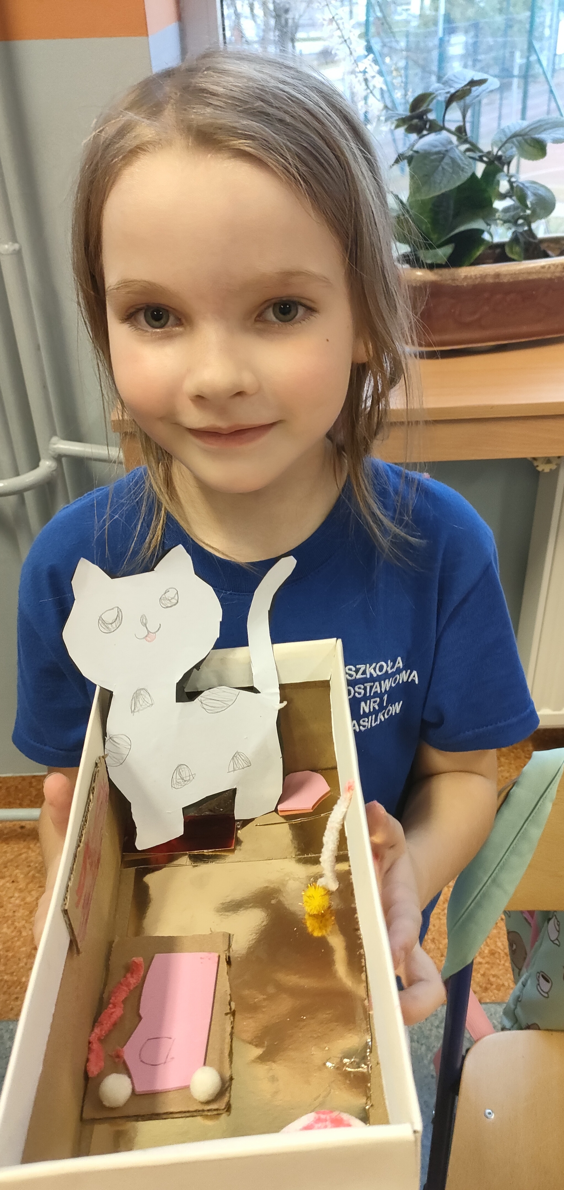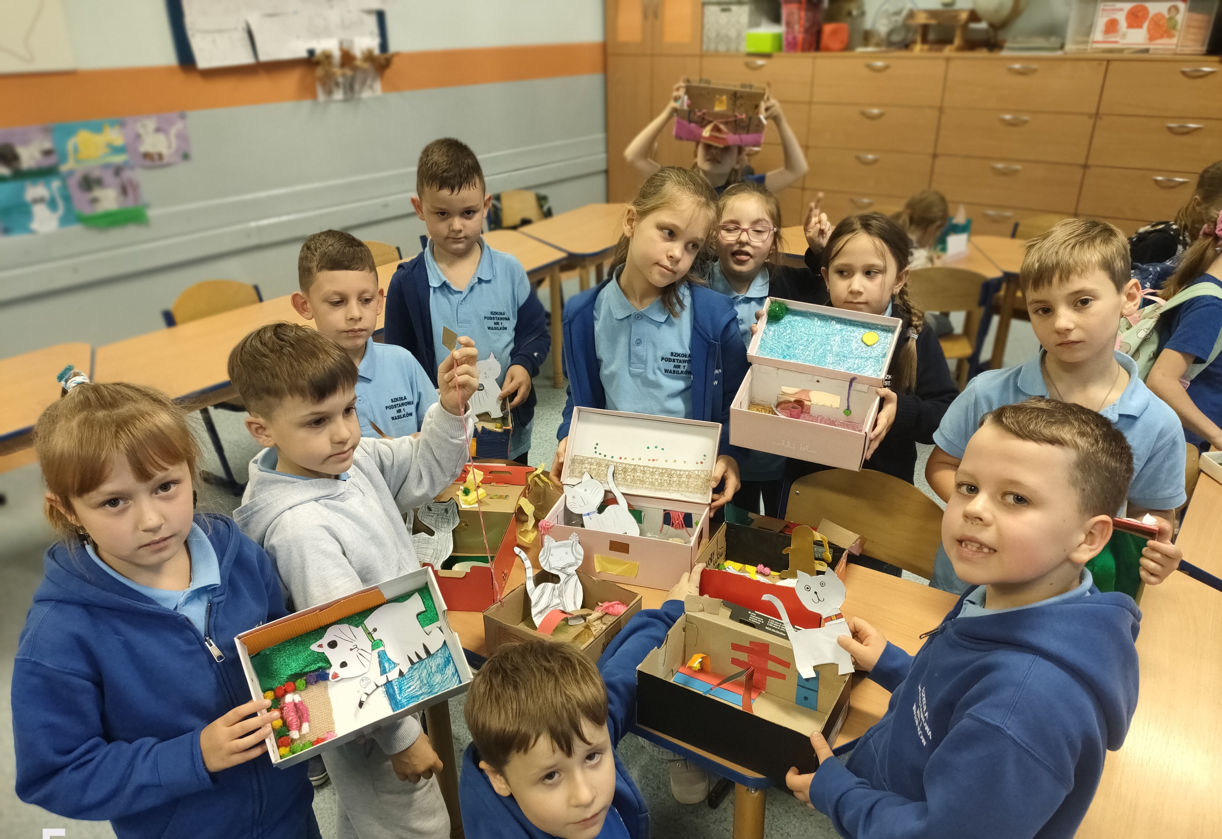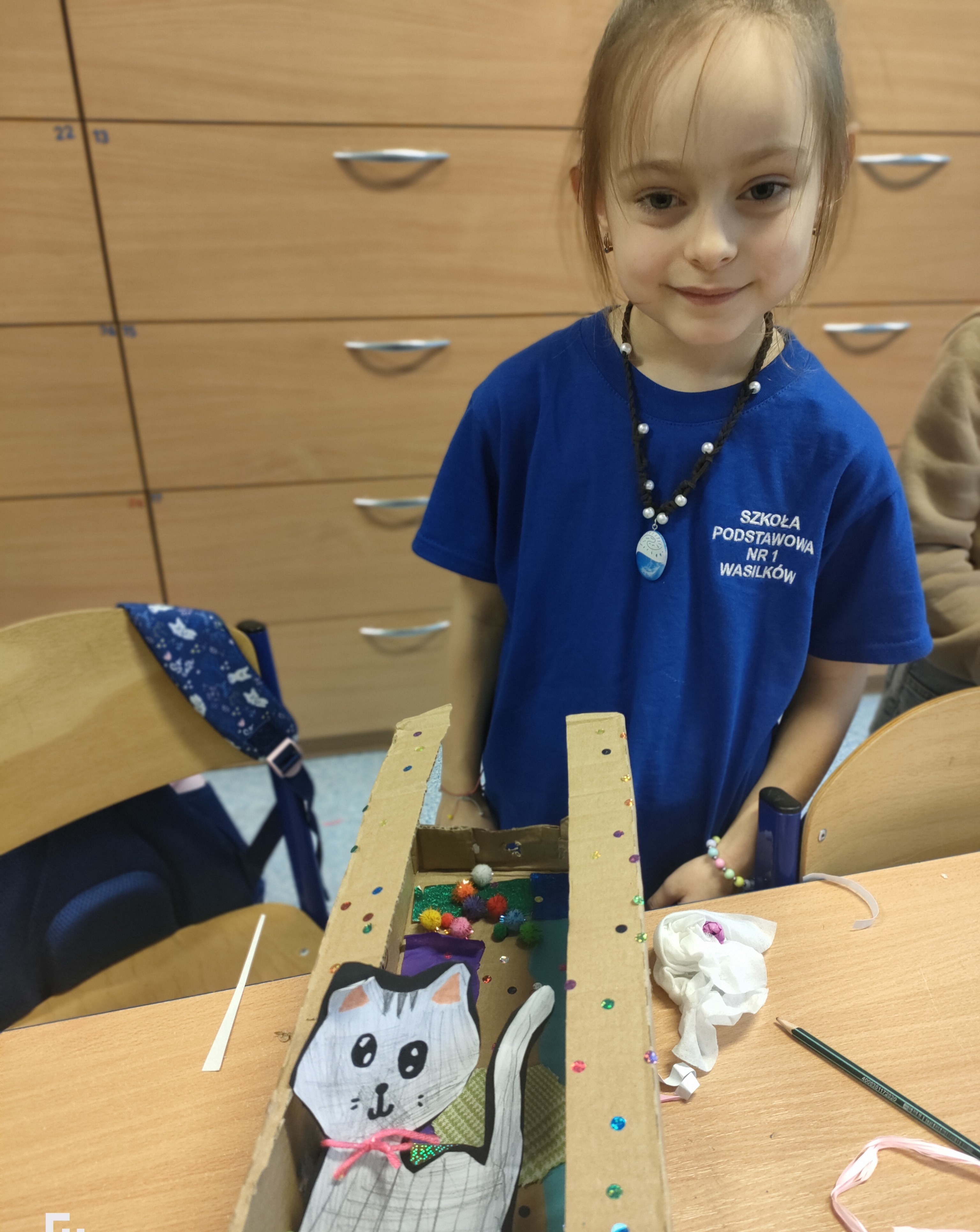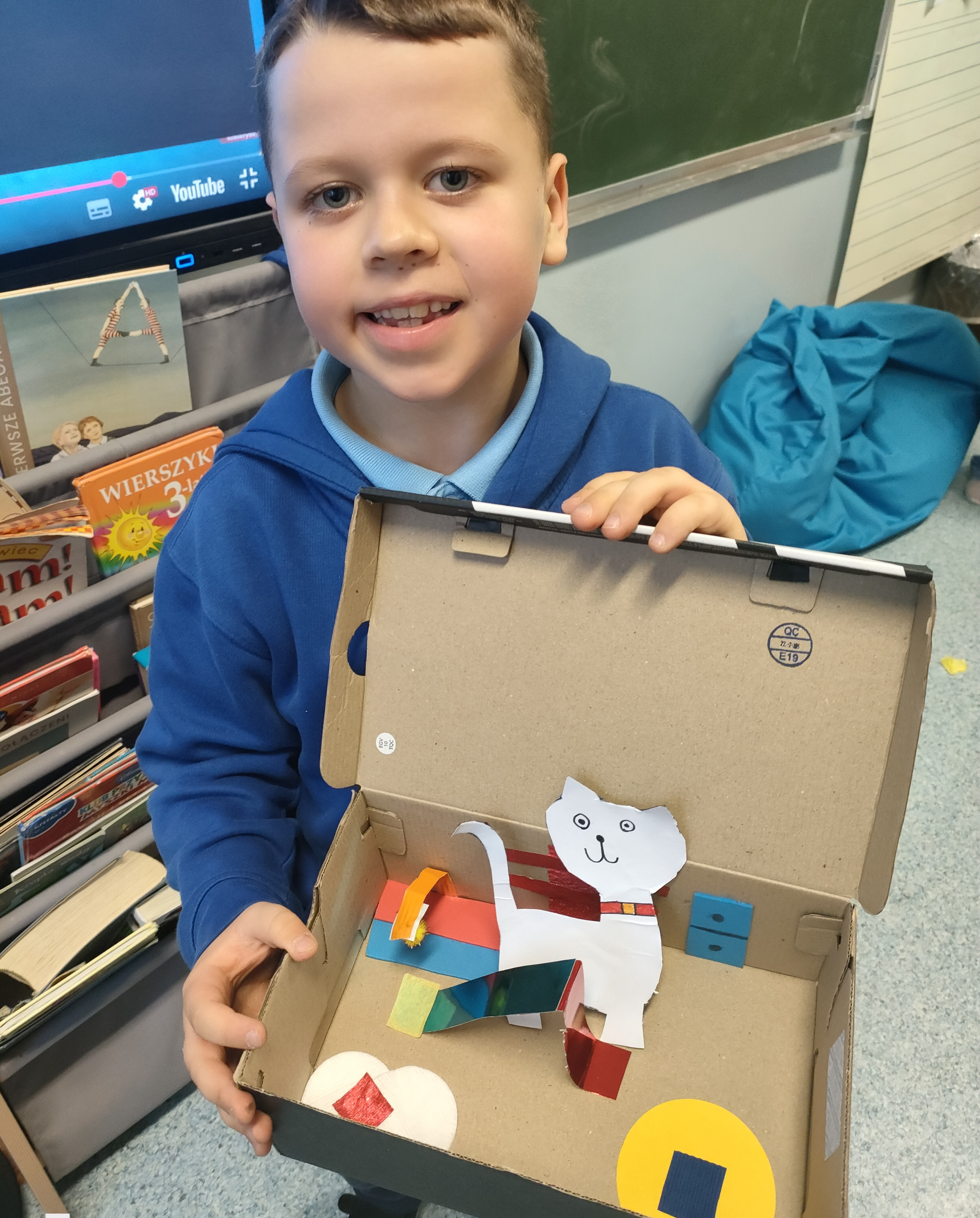 W ostatni dzień zajęć na uczniów czekało wyjątkowe zadanie — każdy samodzielnie stworzył z kartonu domek dla Cukierka! Pomysłów było mnóstwo, a w sali panowała twórcza atmosfera, pełna śmiechu, radości i świetnej zabawy.
