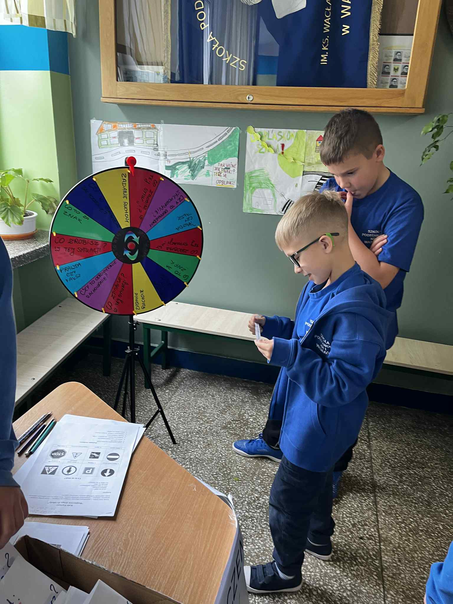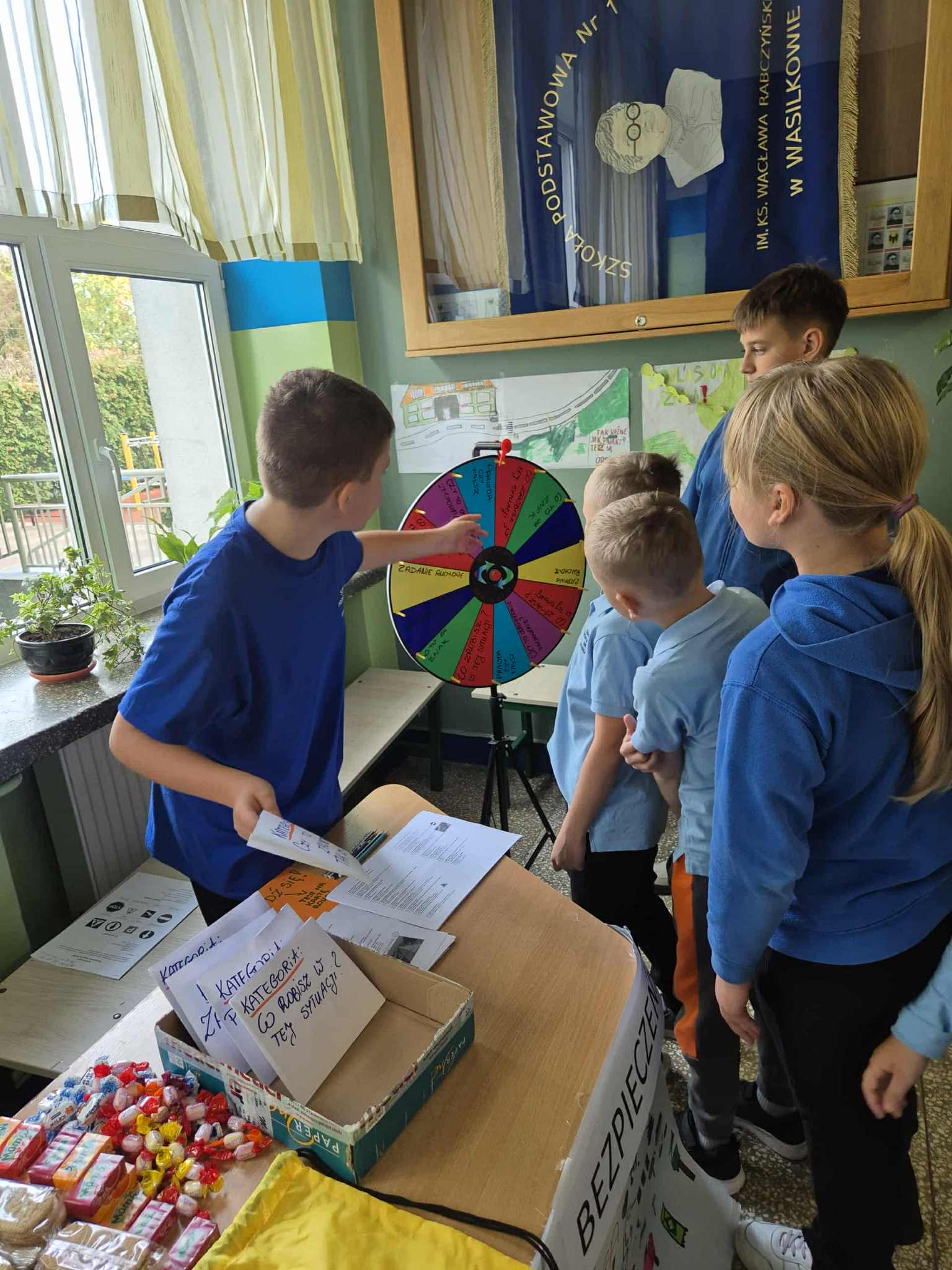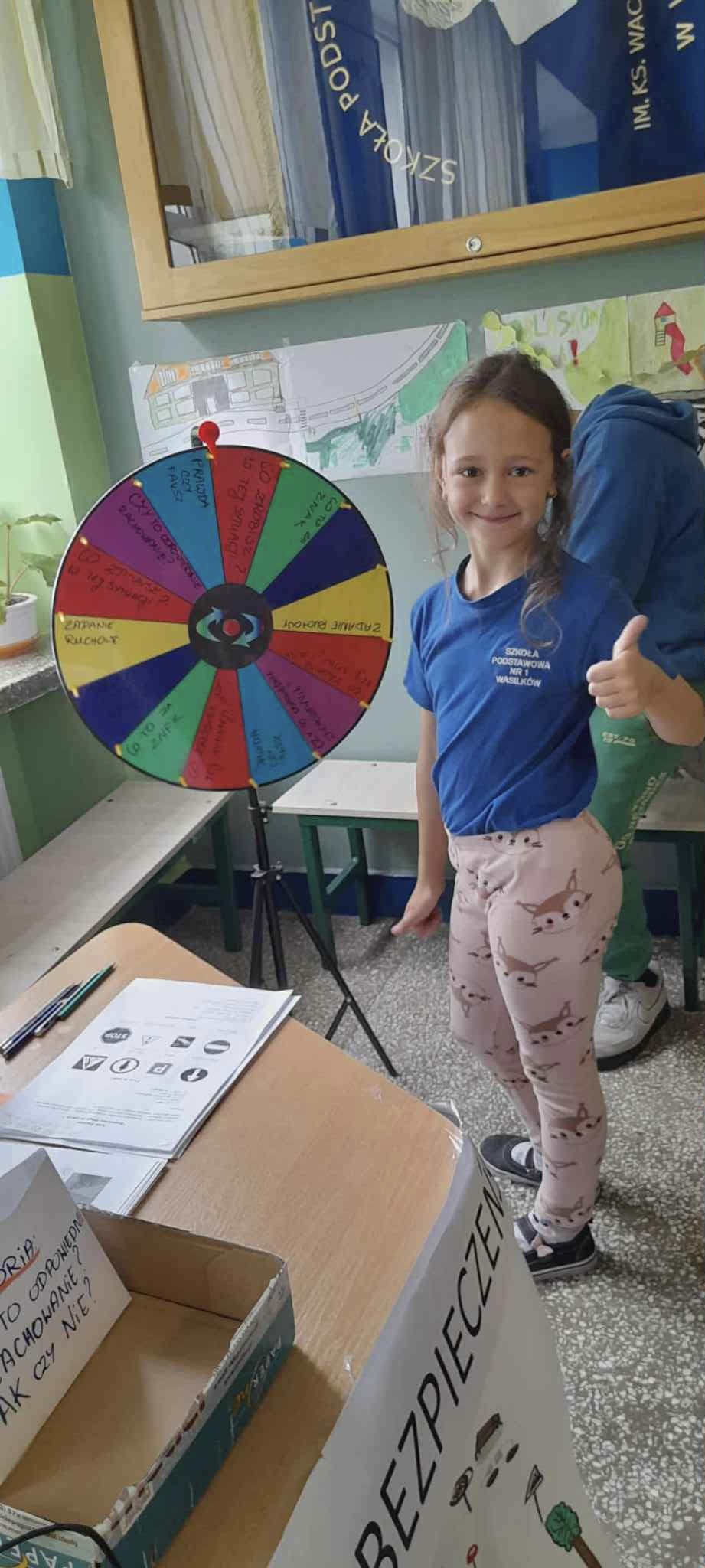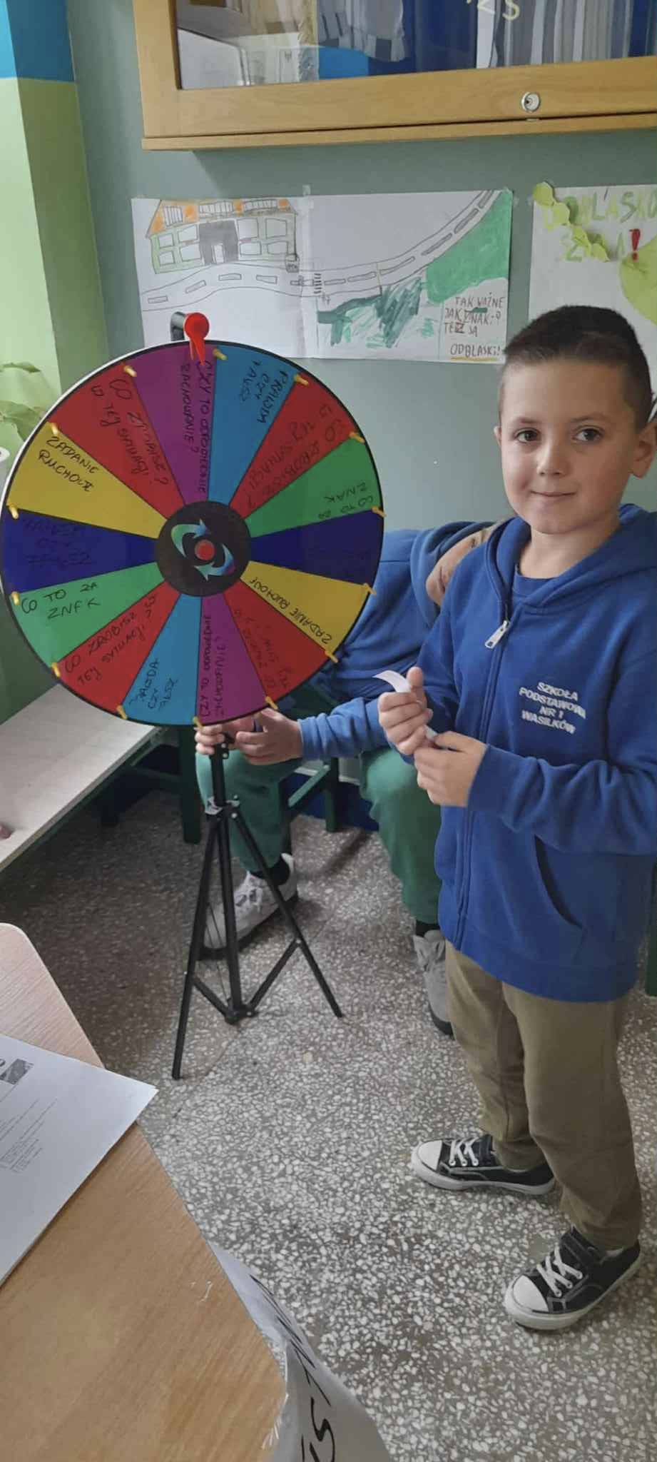 W ramach konkursu „Odblaskowa Szkoła” przygotowaliśmy specjalne stoisko, przy którym najmłodsi uczniowie mogli zakręcić kołem fortuny i sprawdzić swoją wiedzę na temat bezpieczeństwa w ruchu drogowym. Każde pytanie było świetną okazją, by przypomnieć sobie zasady bezpiecznego poruszania się po drodze, a także znaczenie noszenia elementów odblaskowych.
