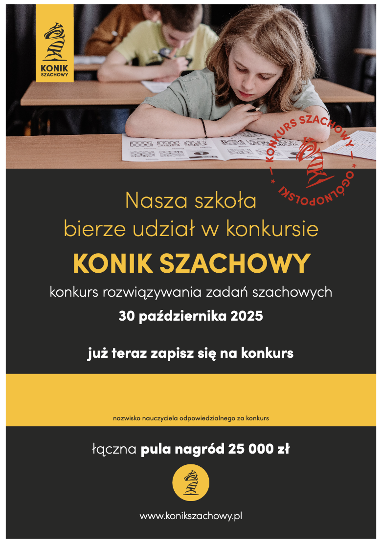 Z radością informujemy, że nasza szkoła bierze udział w Ogólnopolskim Konkursie Szachowym „Konik Szachowy”, który odbędzie się 30 października 2025 roku o godzinie 9:00 w naszej szkole. To wspaniała okazja dla uczniów do rozwijania umiejętności logicznego myślenia oraz rywalizacji z rówieśnikami z Polski oraz Niemiec, Francji, Hiszpanii i Włoch!