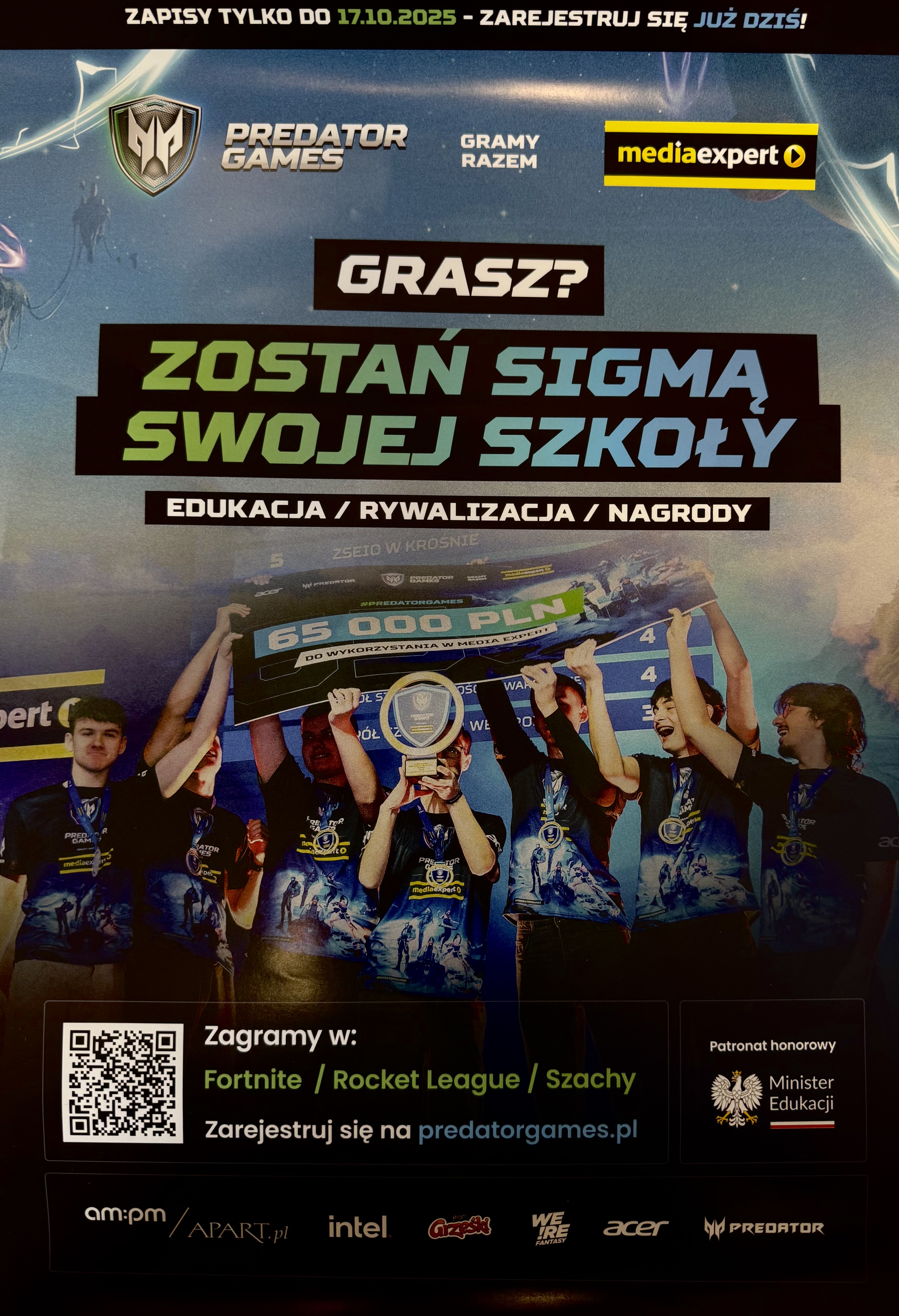 Zapraszamy wszystkich uczniów do udziału w Predator Games – ogólnopolskim turnieju esportowym, w którym rywalizują drużyny ze szkół z całego kraju. To doskonała okazja, aby sprawdzić swoje umiejętności, poczuć emocje rywalizacji i reprezentować naszą szkołę na arenie ogólnopolskiej!