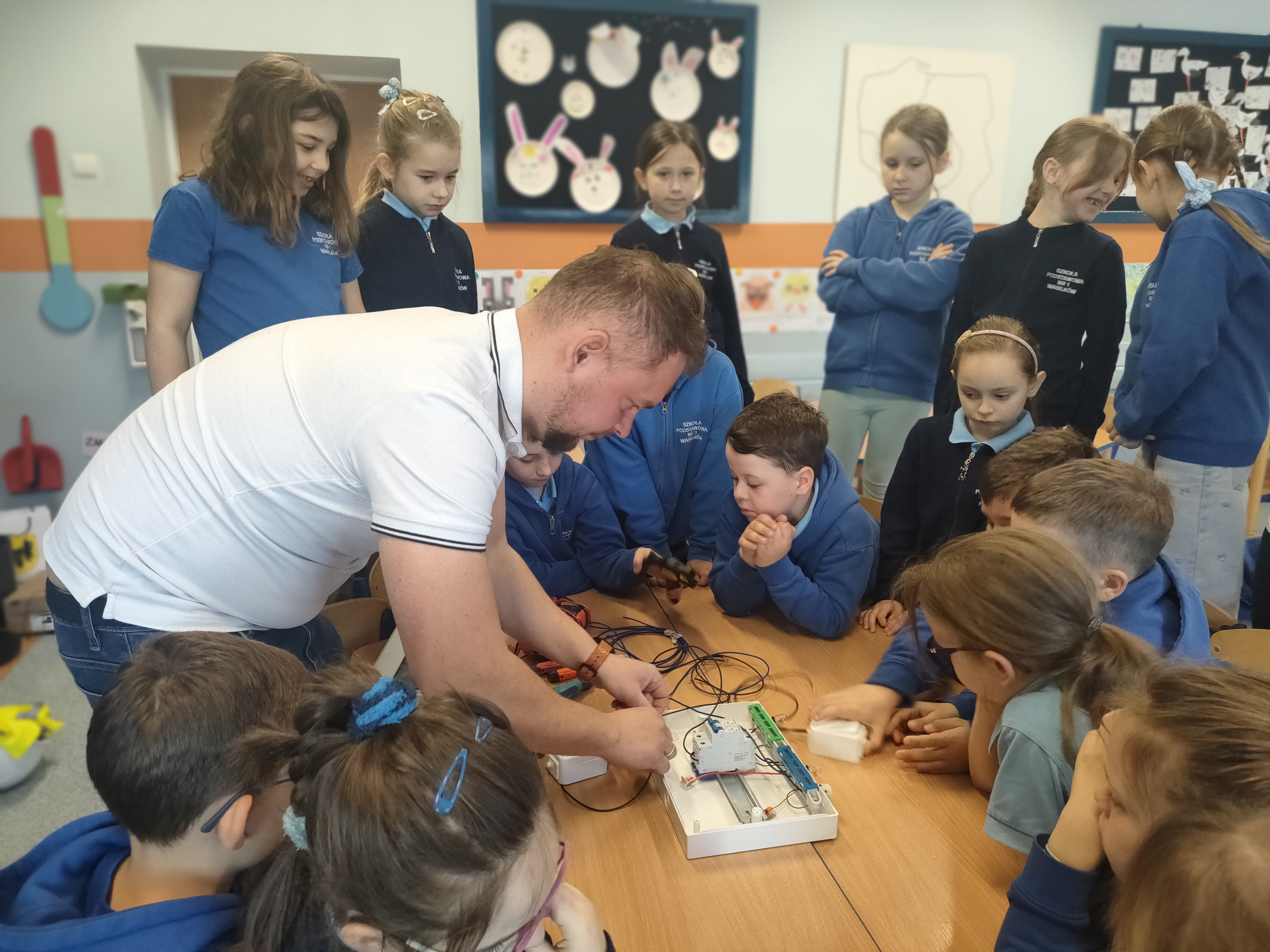 21 kwietnia w klasie 1b odbyło się spotkanie, podczas którego tata Kuby szczegółowo zaprezentował zawód, który wykonuje – elektryka. Opowiedział, na czym polega jego praca, gdzie pracuje oraz z jakimi zadaniami spotyka się na co dzień. Pokazał dzieciom różne narzędzia i urządzenia elektryczne, wyjaśnił, do czego służą oraz jak należy bezpiecznie z nich korzystać. Uczniowie z dużym zainteresowaniem słuchali, chętnie zadawali pytania i dzielili się swoimi spostrzeżeniami. Na zakończenie dzieci wzięły udział w ciekawej i angażującej grze związanej z tematyką zajęć, którą wspólnie przygotowali Kuba wraz z tatą.