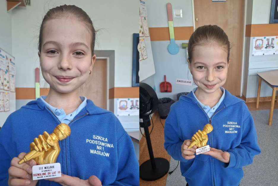 Z ogromną radością informujemy, że Klara Sałałajko, uczennica klasy 1A, dnia 22.04 zajęła III miejsce w Międzyszkolnym Konkursie Piosenki Dziecięcej „Dozwolone do lat 10”, organizowanym przez Szkołę Podstawową im. Króla Zygmunta Augusta.