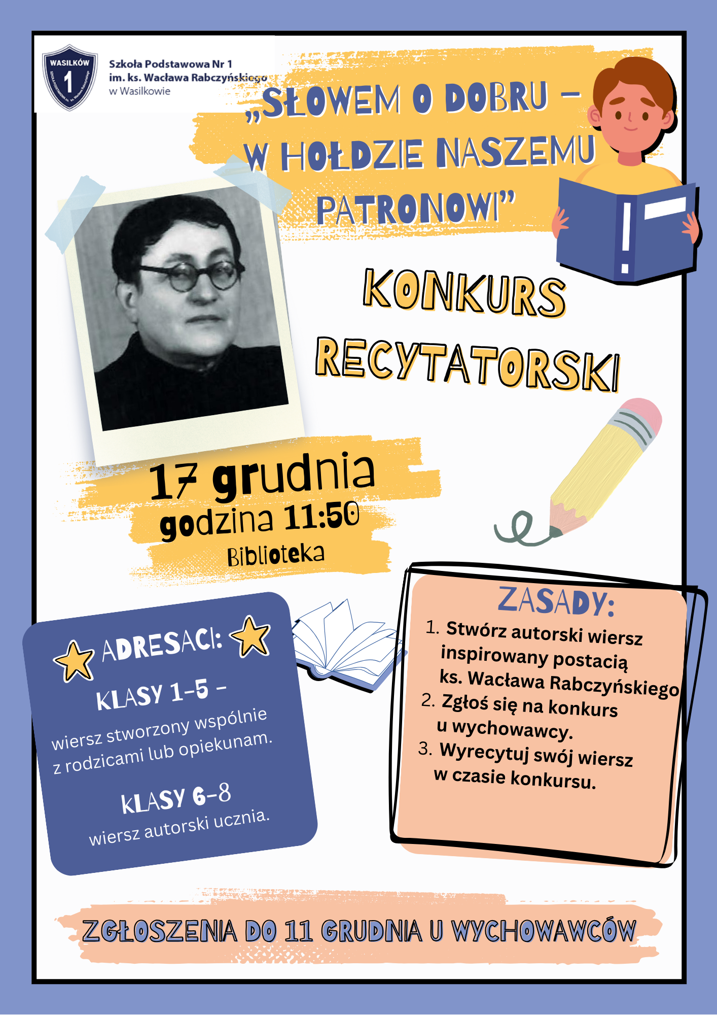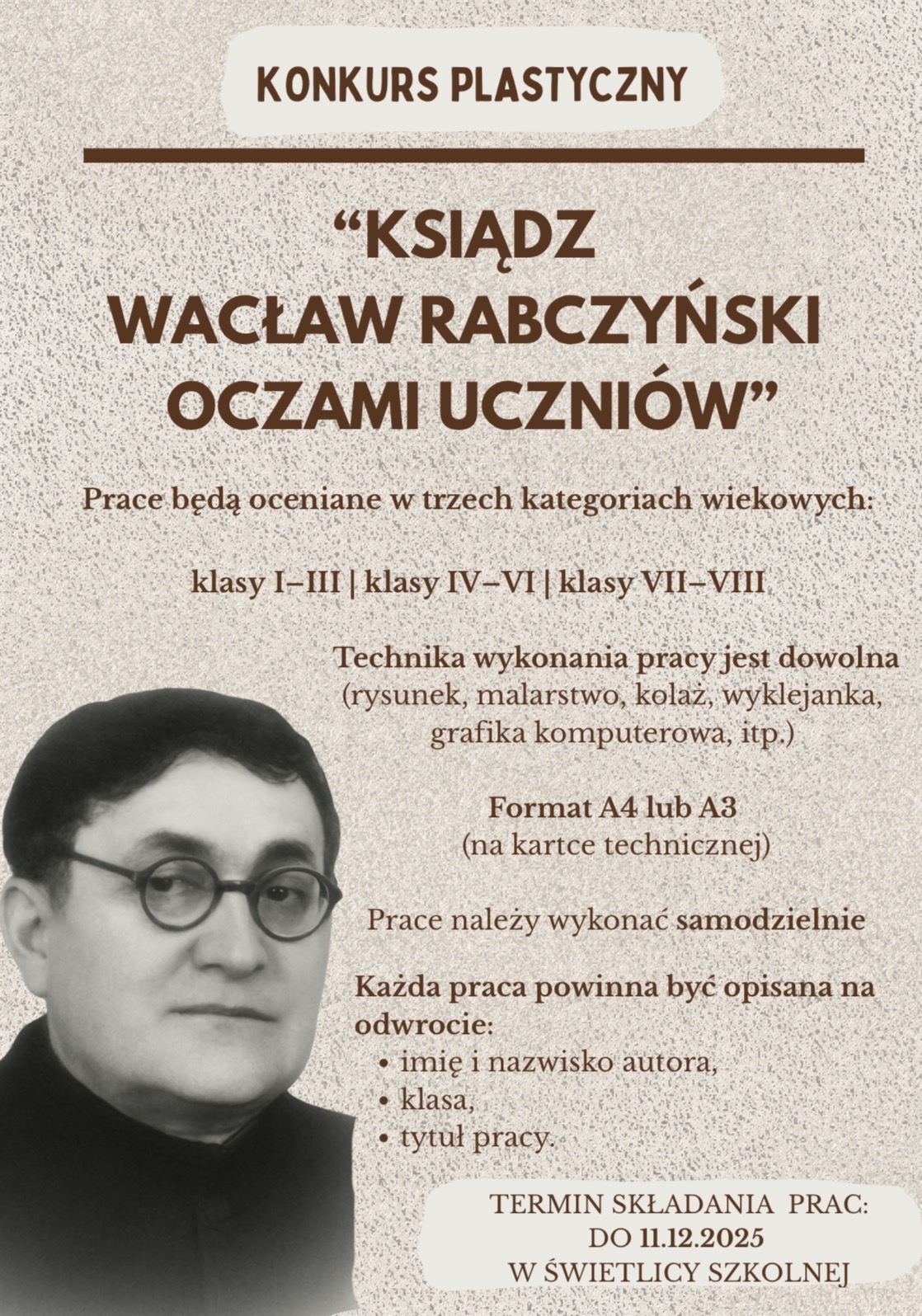 W dniach 15-19 grudnia zapraszamy całą społeczność szkolną na wyjątkowy Tydzień z Patronem — czas odkrywania życia, pasji i wartości ks. Wacława Raczyńskiego.