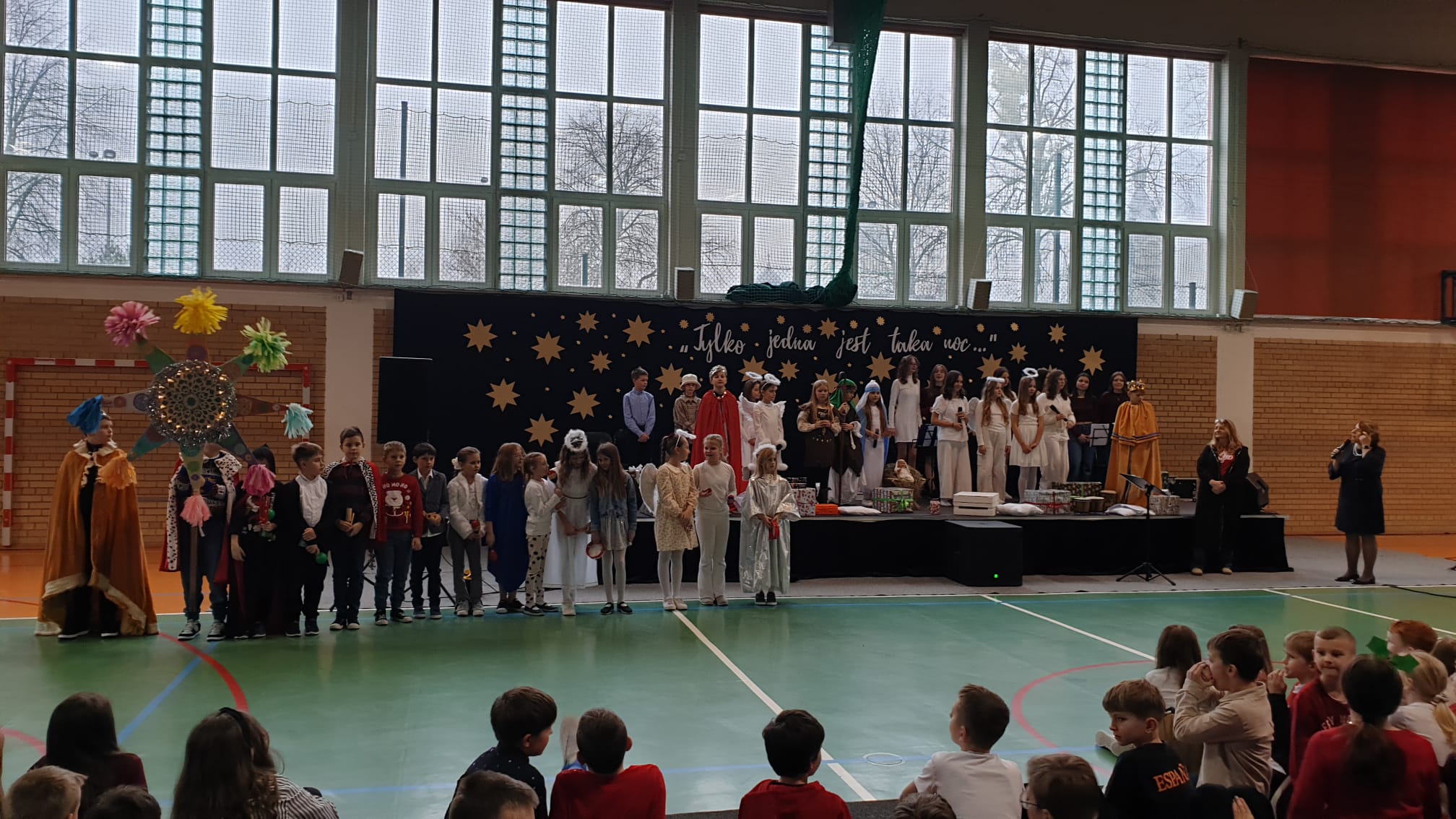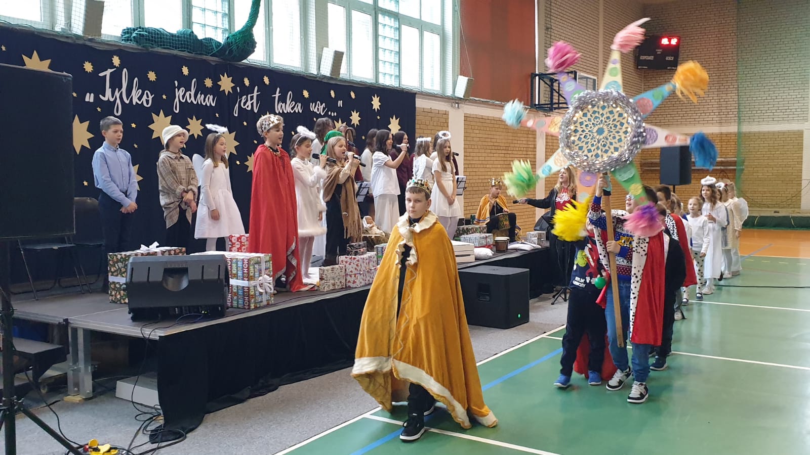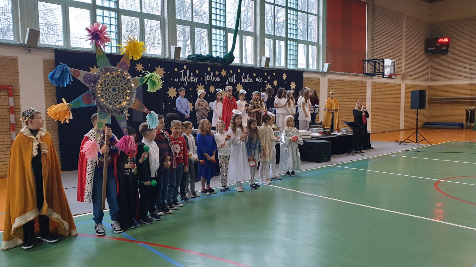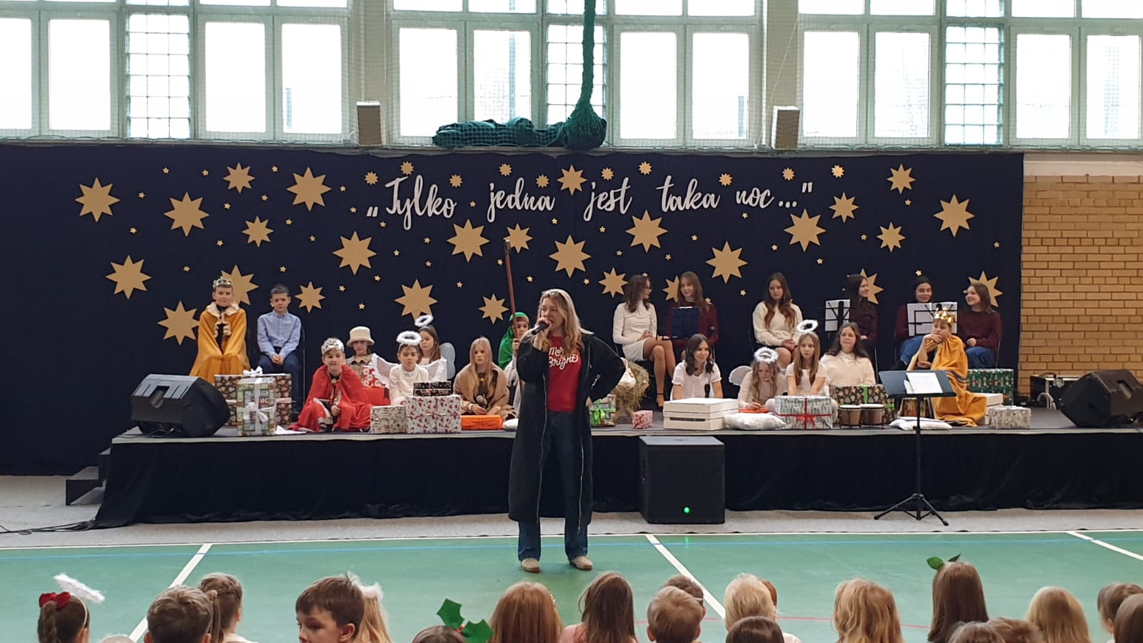 W tym przedświątecznym czasie uczniowie, nauczyciele oraz pracownicy administracji i obsługi naszej szkoły, uczestniczyli w pokazie świątecznego musicalu "Tylko jedna jest taka noc...". Na widowni nie zabrakło też bliskich naszych muzycznych aktorów. W ten spektakl, z wielkim zaangażowaniem, włączyli się widzowie - uczniowie wszystkich klas. Specjalną rolę miała klasa 3A, wraz z panią Kasią i panią Kingą. To właśnie ci uczniowie dzielnie towarzyszyli występującym, kolędując z gwiazdą i grając na instrumentach perkusyjnych. Muzyczni tegoroczni aktorzy to uczniowie z klasy 3A, 4A i 4B, 5B oraz z 7A i 7B.
