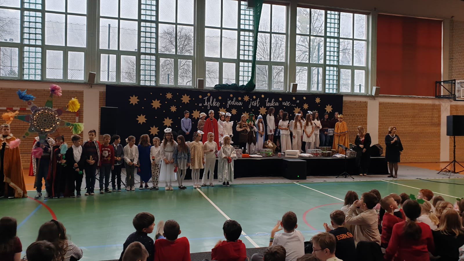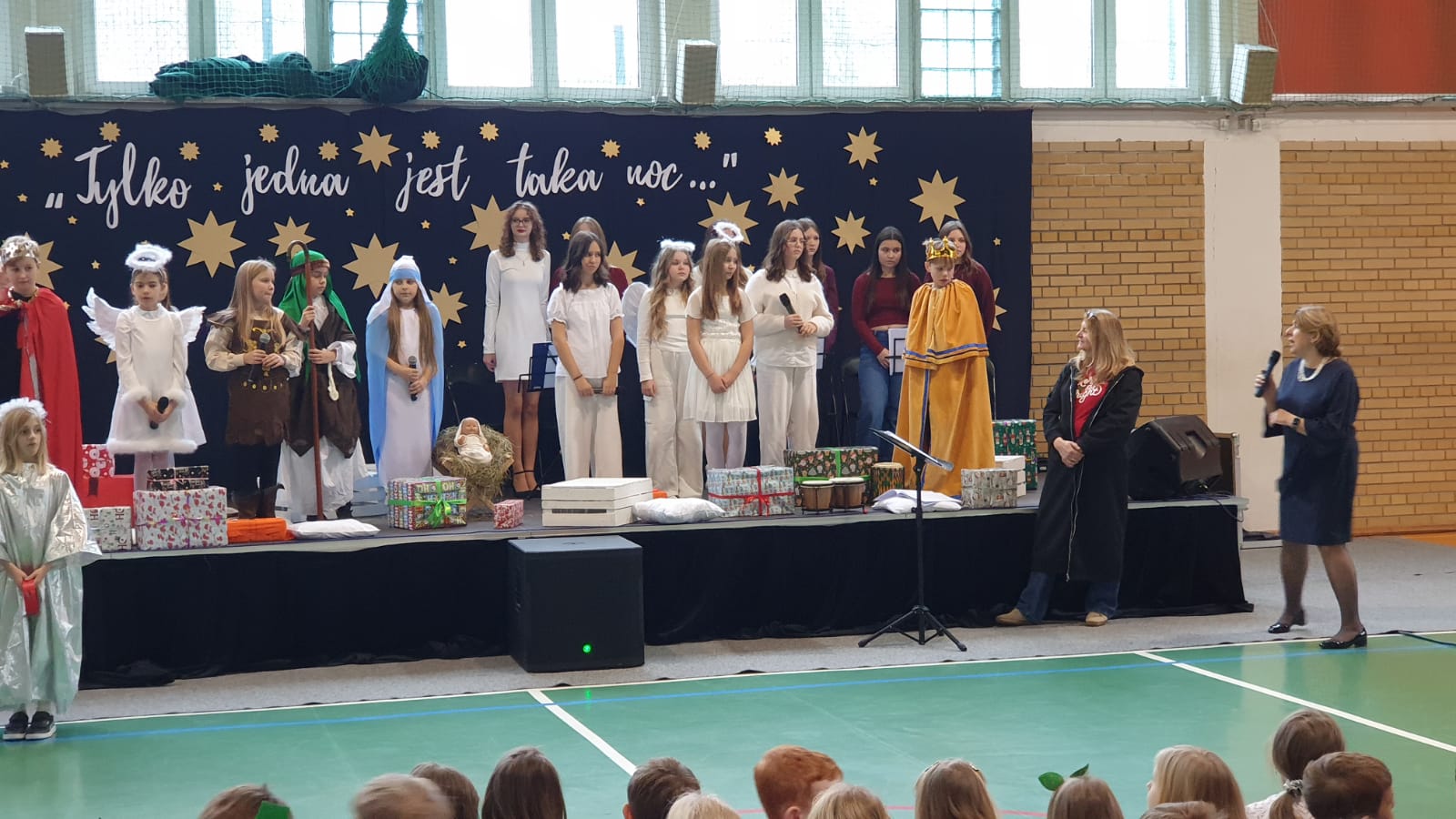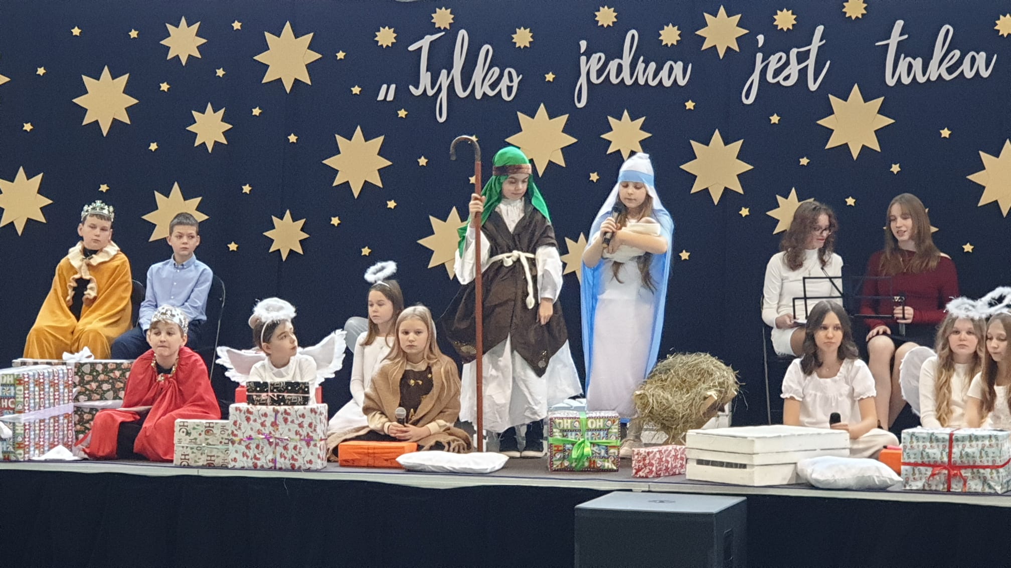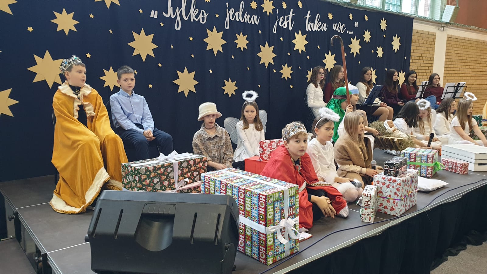 W tym przedświątecznym czasie uczniowie, nauczyciele oraz pracownicy administracji i obsługi naszej szkoły, uczestniczyli w pokazie świątecznego musicalu "Tylko jedna jest taka noc...". Na widowni nie zabrakło też bliskich naszych muzycznych aktorów. W ten spektakl, z wielkim zaangażowaniem, włączyli się widzowie - uczniowie wszystkich klas. Specjalną rolę miała klasa 3A, wraz z panią Kasią i panią Kingą. To właśnie ci uczniowie dzielnie towarzyszyli występującym, kolędując z gwiazdą i grając na instrumentach perkusyjnych. Muzyczni tegoroczni aktorzy to uczniowie z klasy 3A, 4A i 4B, 5B oraz z 7A i 7B.
