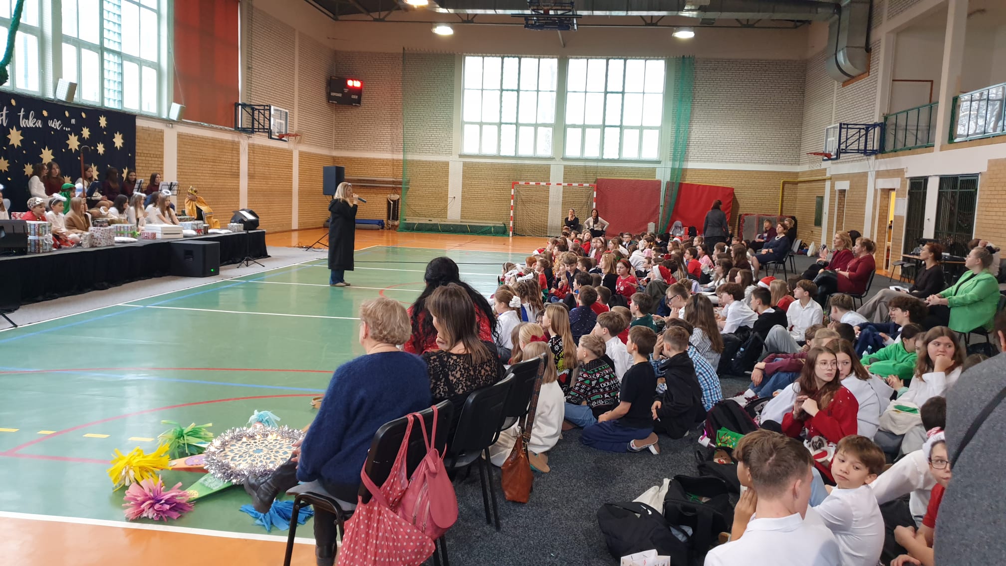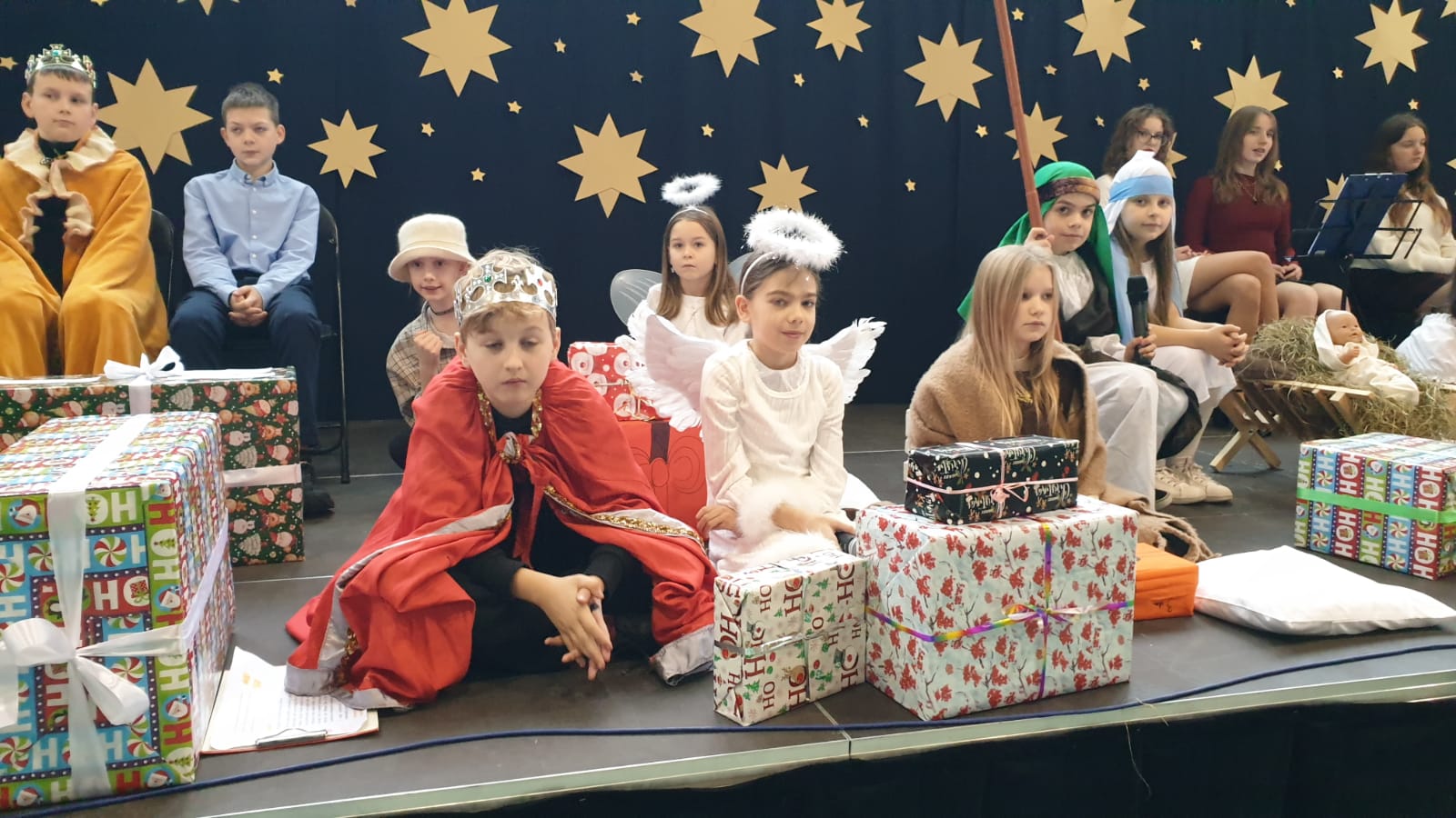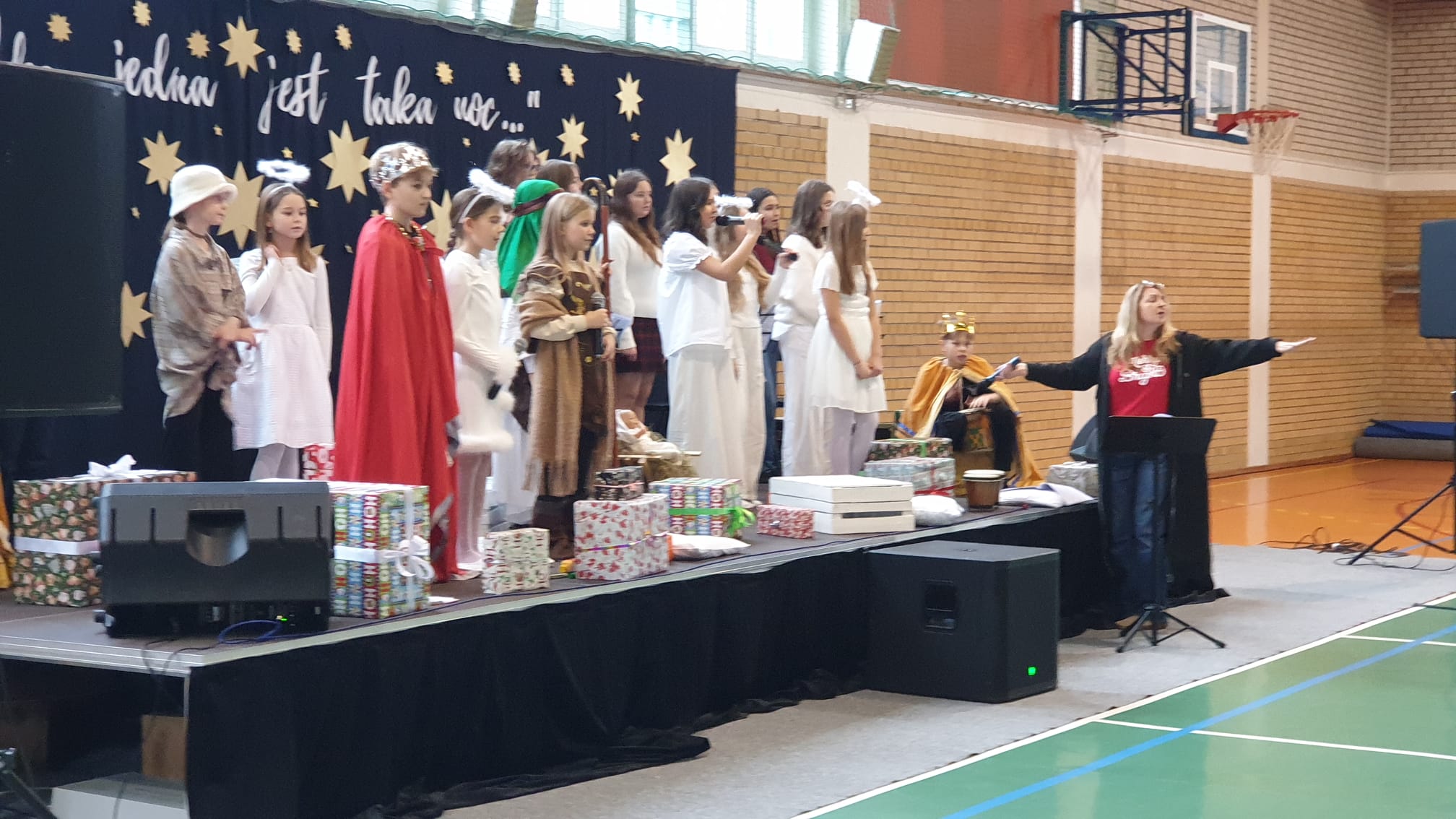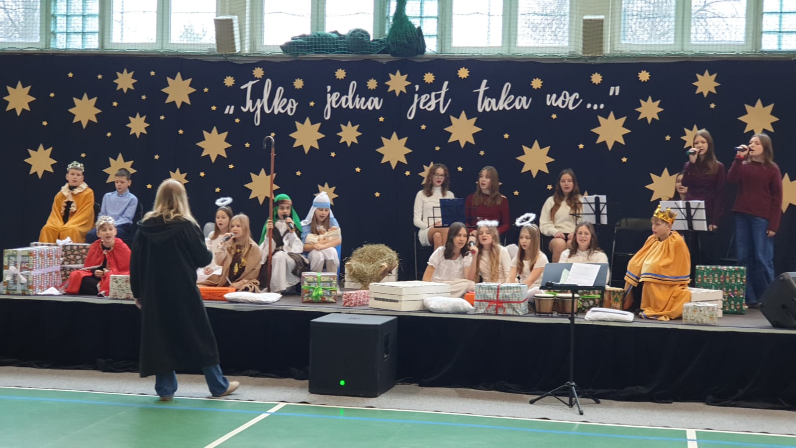 W tym przedświątecznym czasie uczniowie, nauczyciele oraz pracownicy administracji i obsługi naszej szkoły, uczestniczyli w pokazie świątecznego musicalu "Tylko jedna jest taka noc...". Na widowni nie zabrakło też bliskich naszych muzycznych aktorów. W ten spektakl, z wielkim zaangażowaniem, włączyli się widzowie - uczniowie wszystkich klas. Specjalną rolę miała klasa 3A, wraz z panią Kasią i panią Kingą. To właśnie ci uczniowie dzielnie towarzyszyli występującym, kolędując z gwiazdą i grając na instrumentach perkusyjnych. Muzyczni tegoroczni aktorzy to uczniowie z klasy 3A, 4A i 4B, 5B oraz z 7A i 7B.