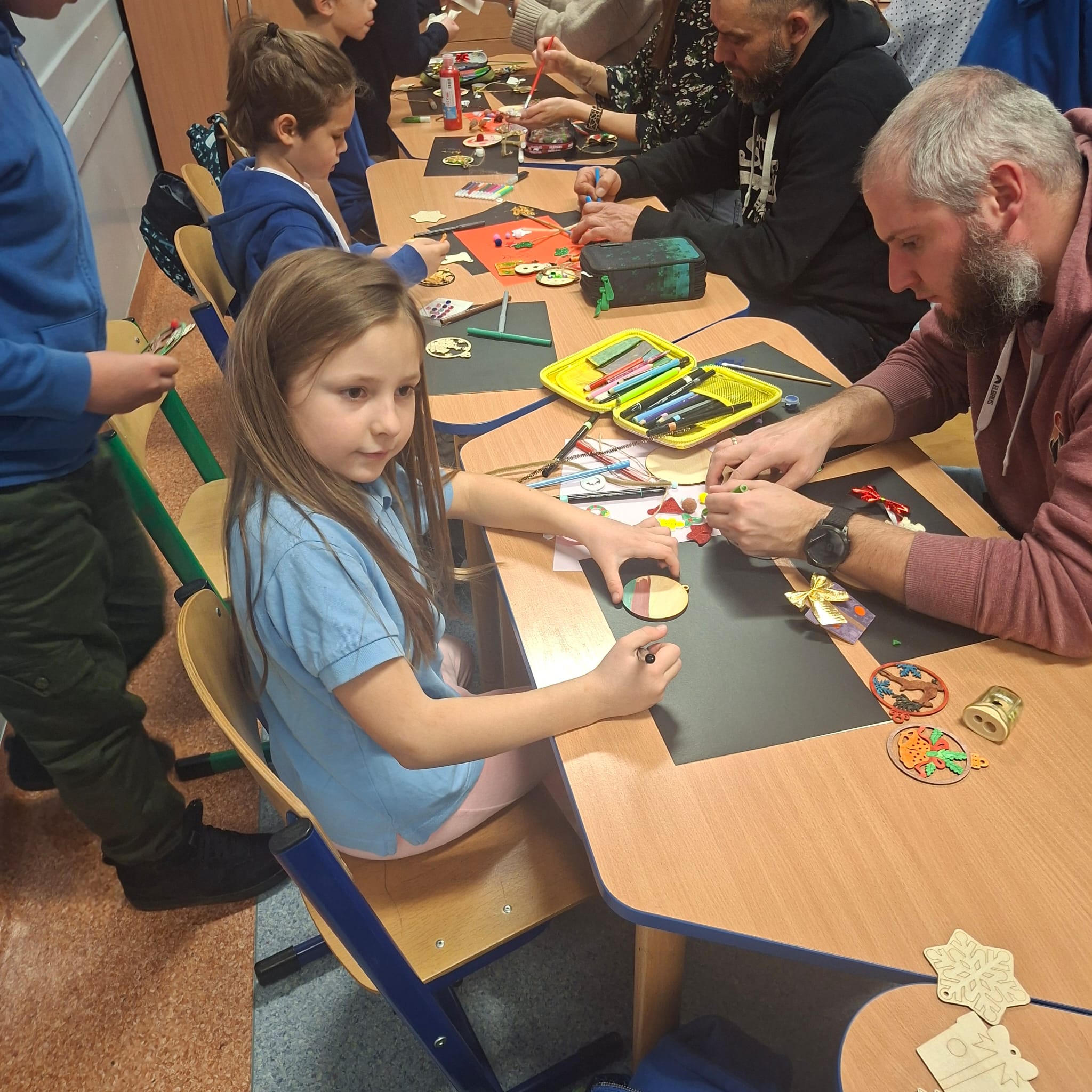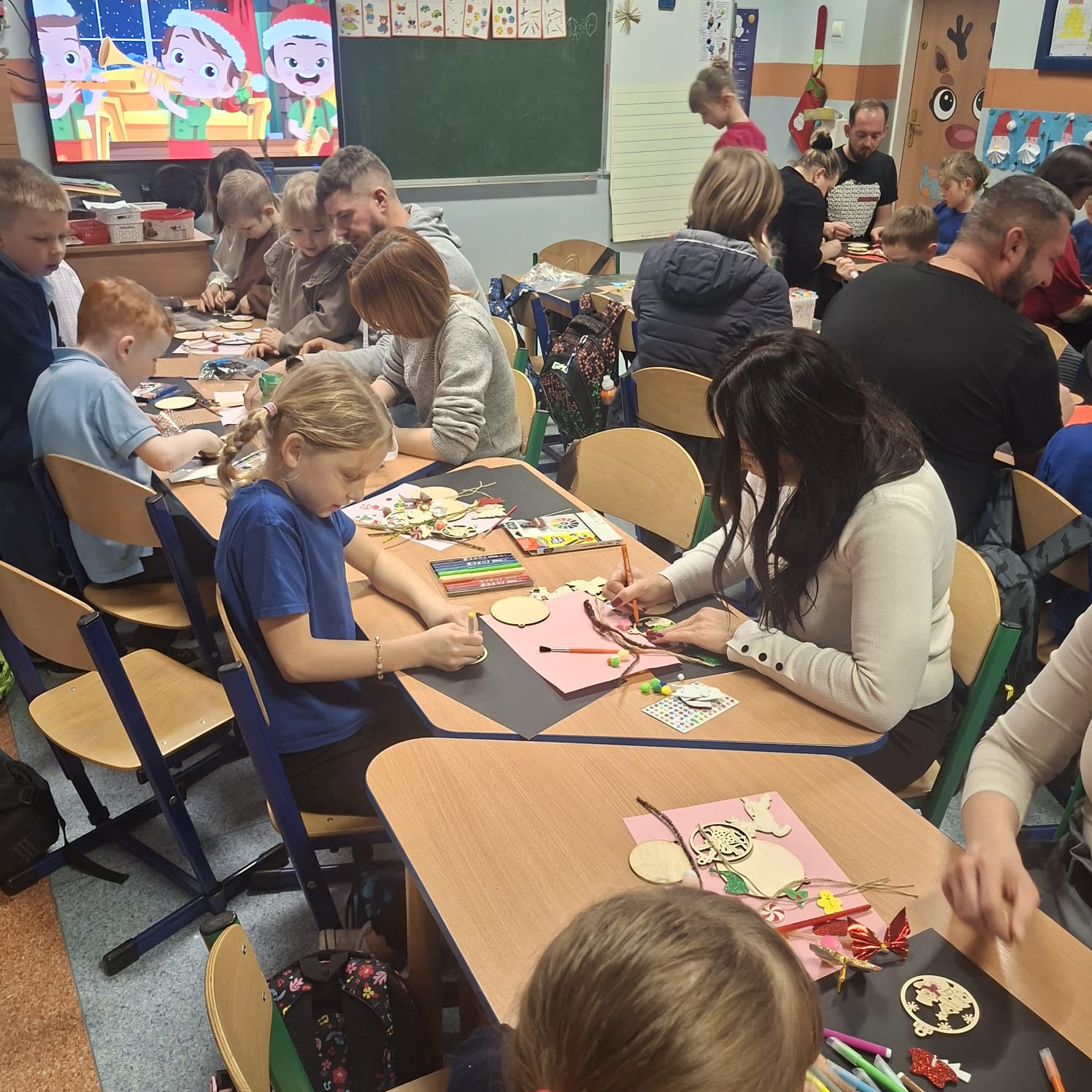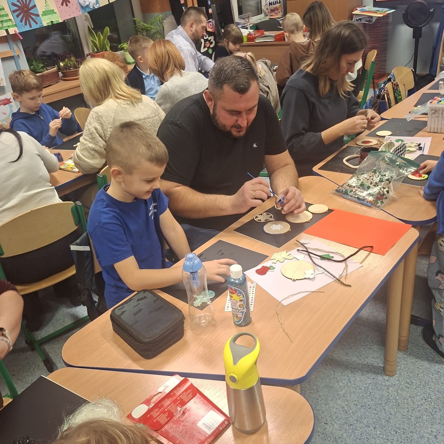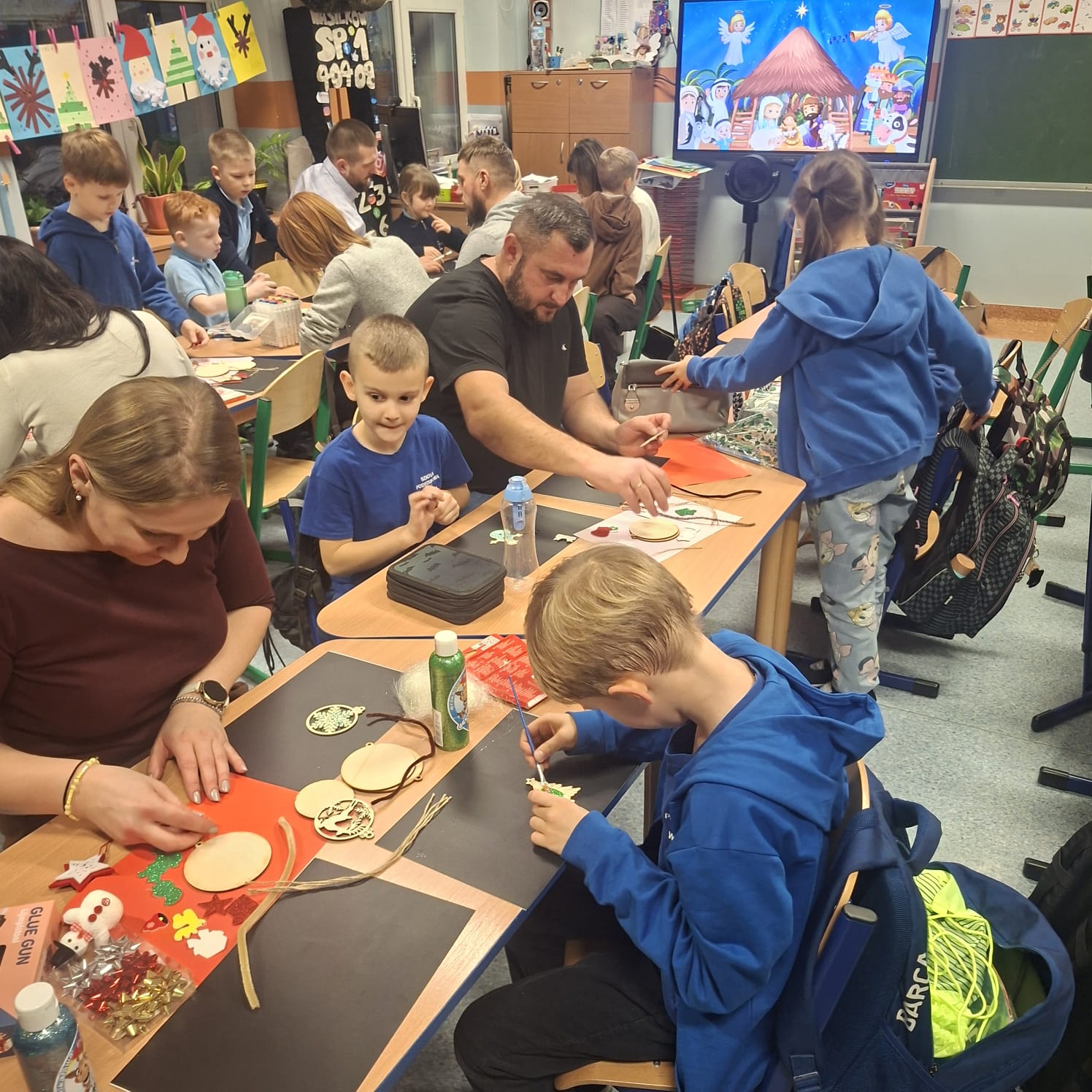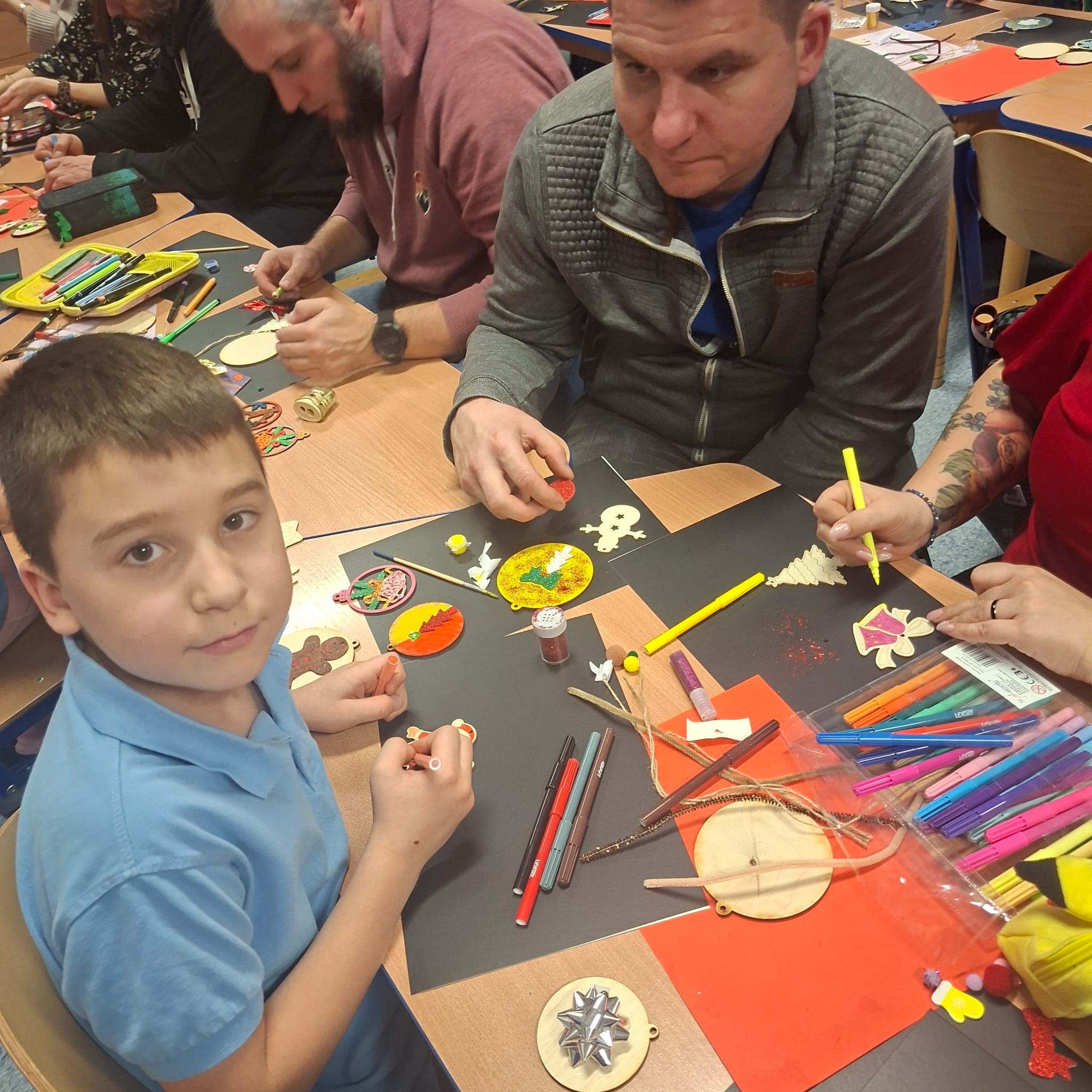 Uczniowie klasy 1a wraz z rodzicami spotkali się na wyjątkowych, pełnych świątecznej atmosfery warsztatach bożonarodzeniowych. Na stołach czekały przygotowane materiały: drewniane krążki, farby, brokaty, kolorowe sznurki oraz świąteczne dodatki.