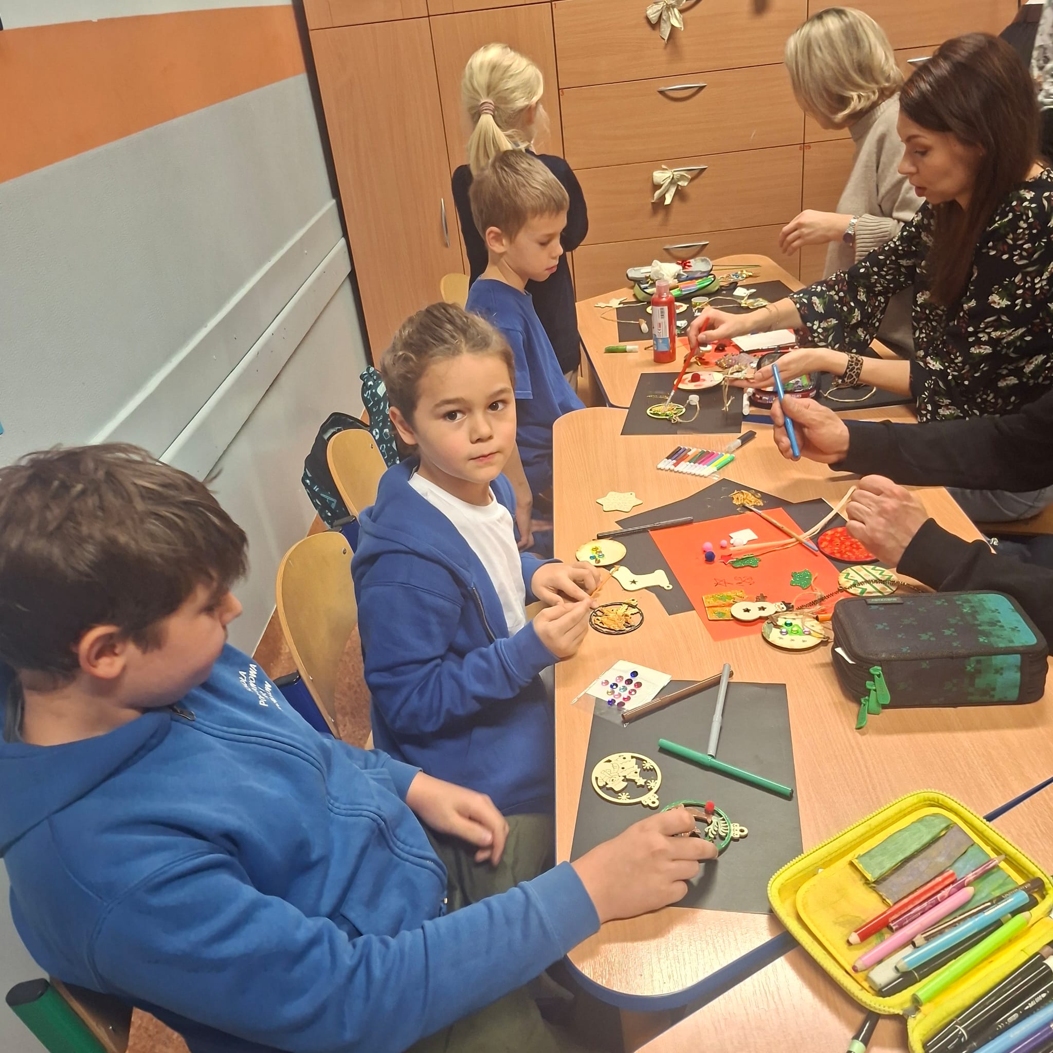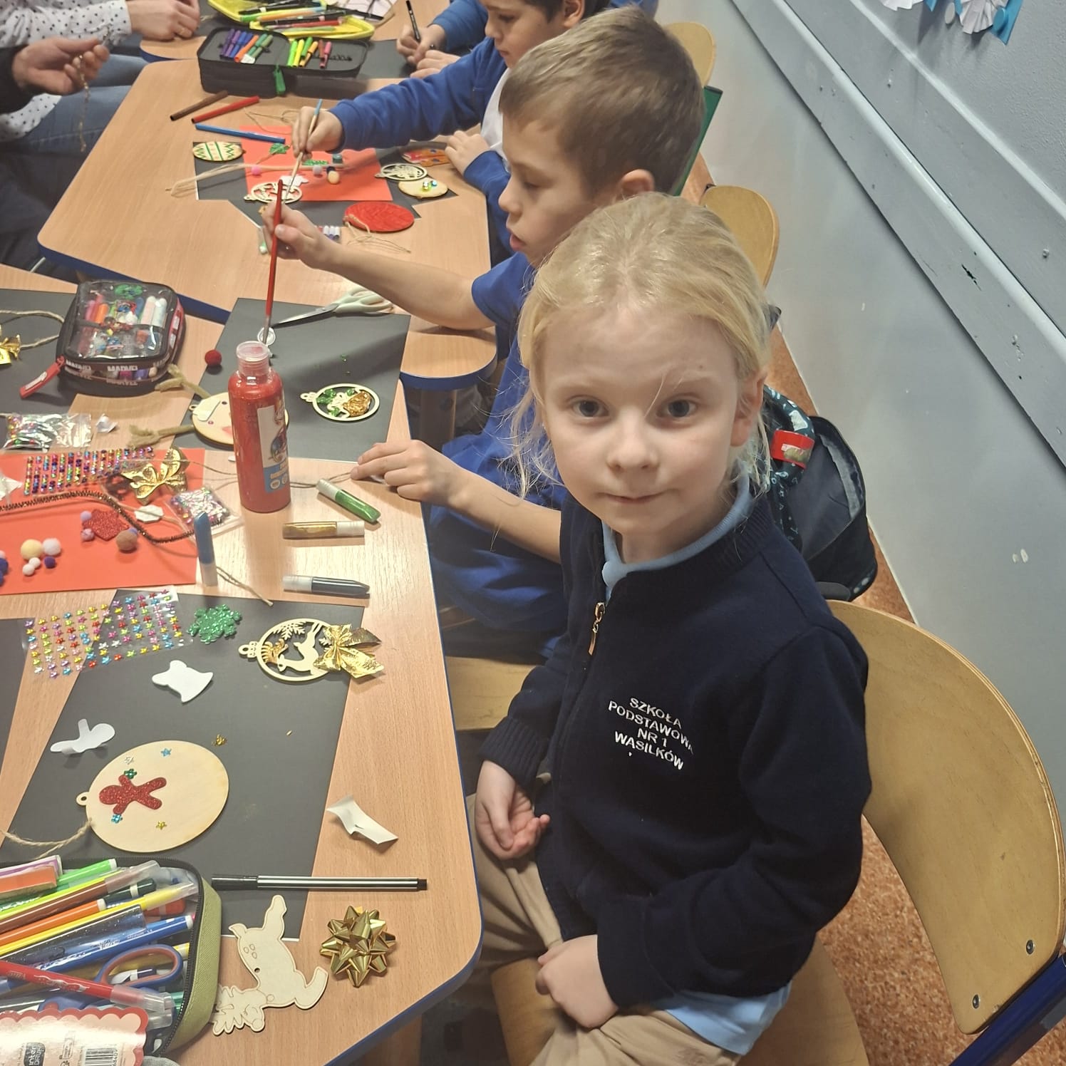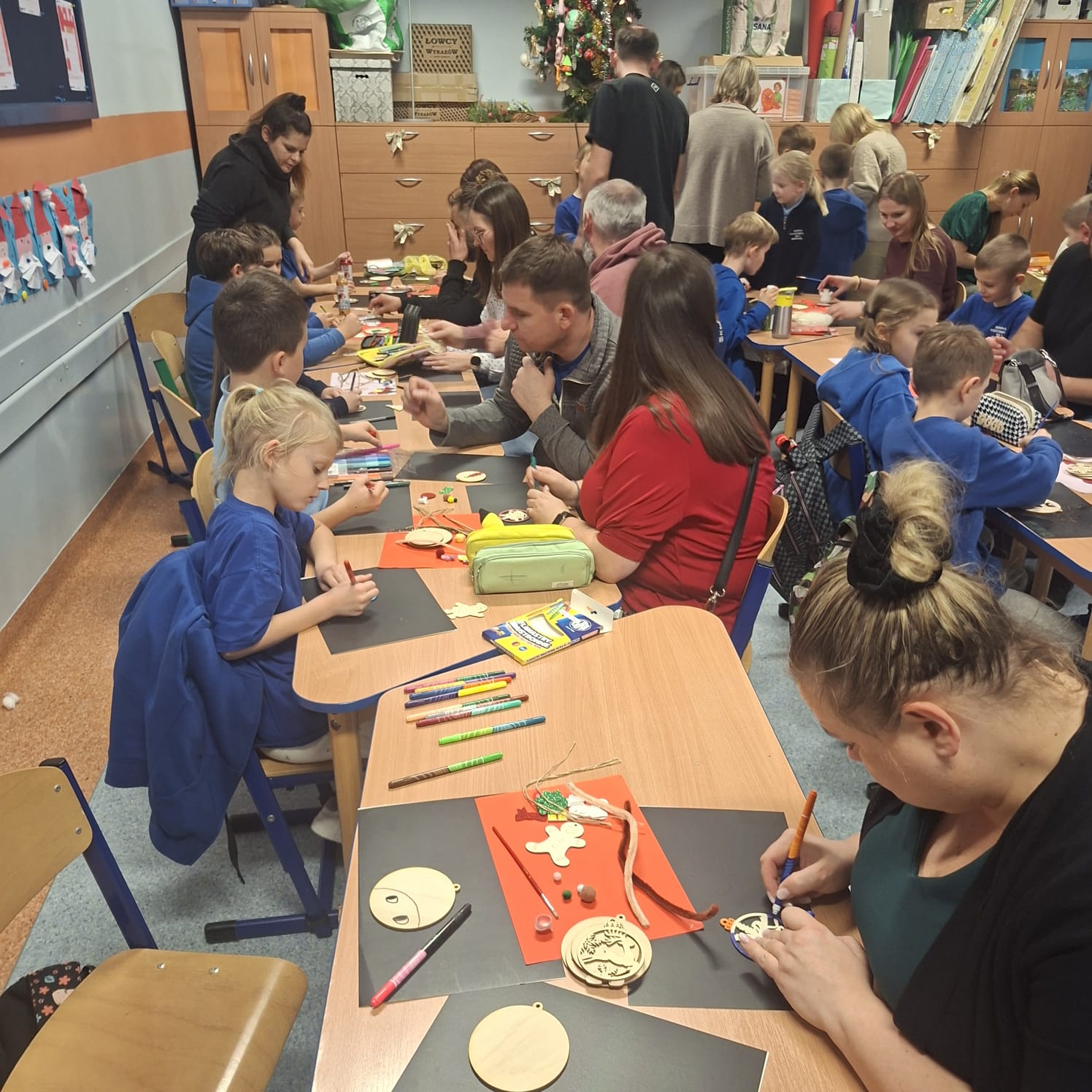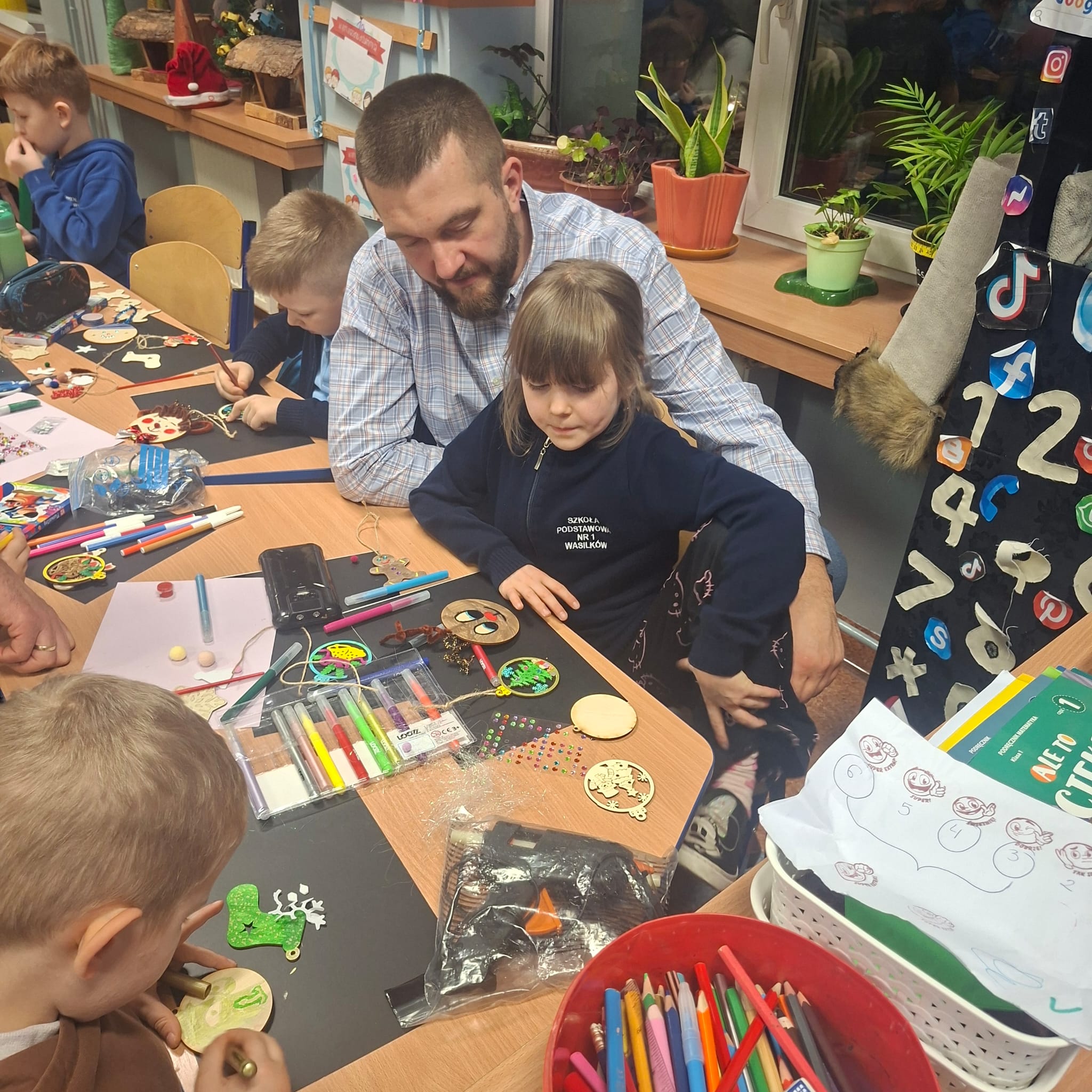 Uczniowie klasy 1a wraz z rodzicami spotkali się na wyjątkowych, pełnych świątecznej atmosfery warsztatach bożonarodzeniowych. Na stołach czekały przygotowane materiały: drewniane krążki, farby, brokaty, kolorowe sznurki oraz świąteczne dodatki.