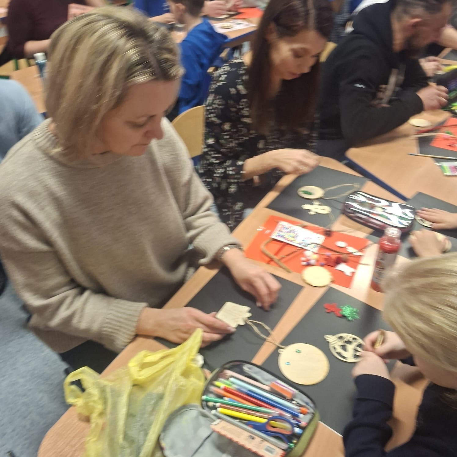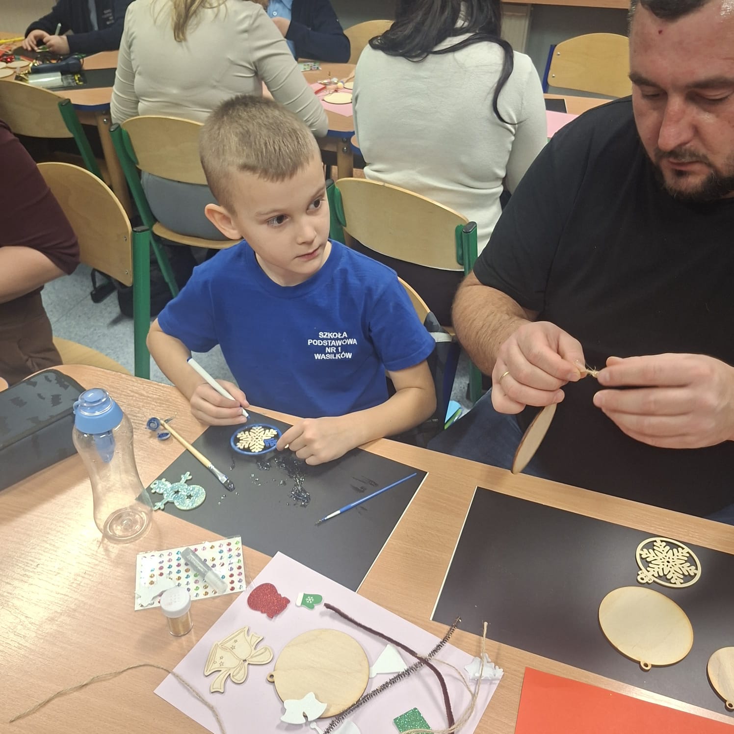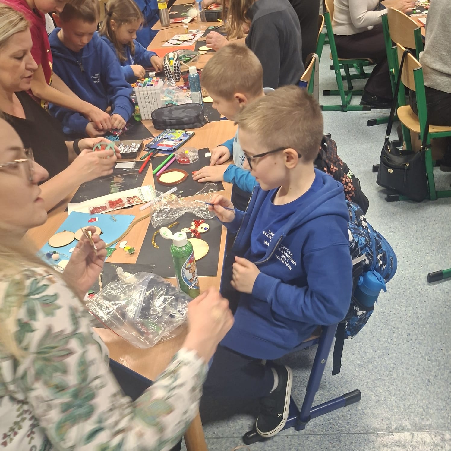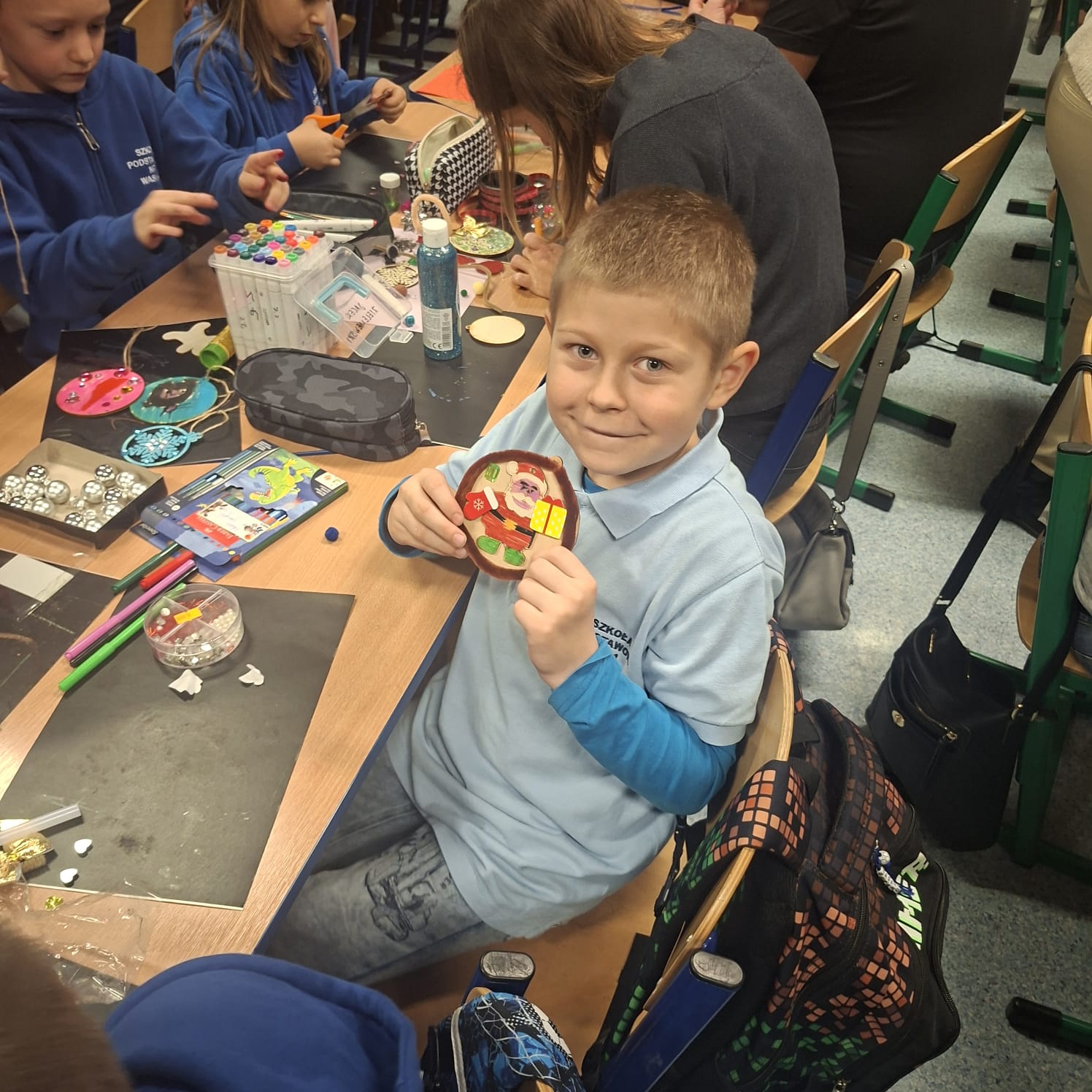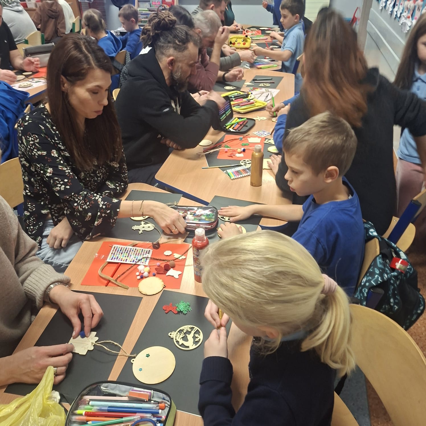 Uczniowie klasy 1a wraz z rodzicami spotkali się na wyjątkowych, pełnych świątecznej atmosfery warsztatach bożonarodzeniowych. Na stołach czekały przygotowane materiały: drewniane krążki, farby, brokaty, kolorowe sznurki oraz świąteczne dodatki.
