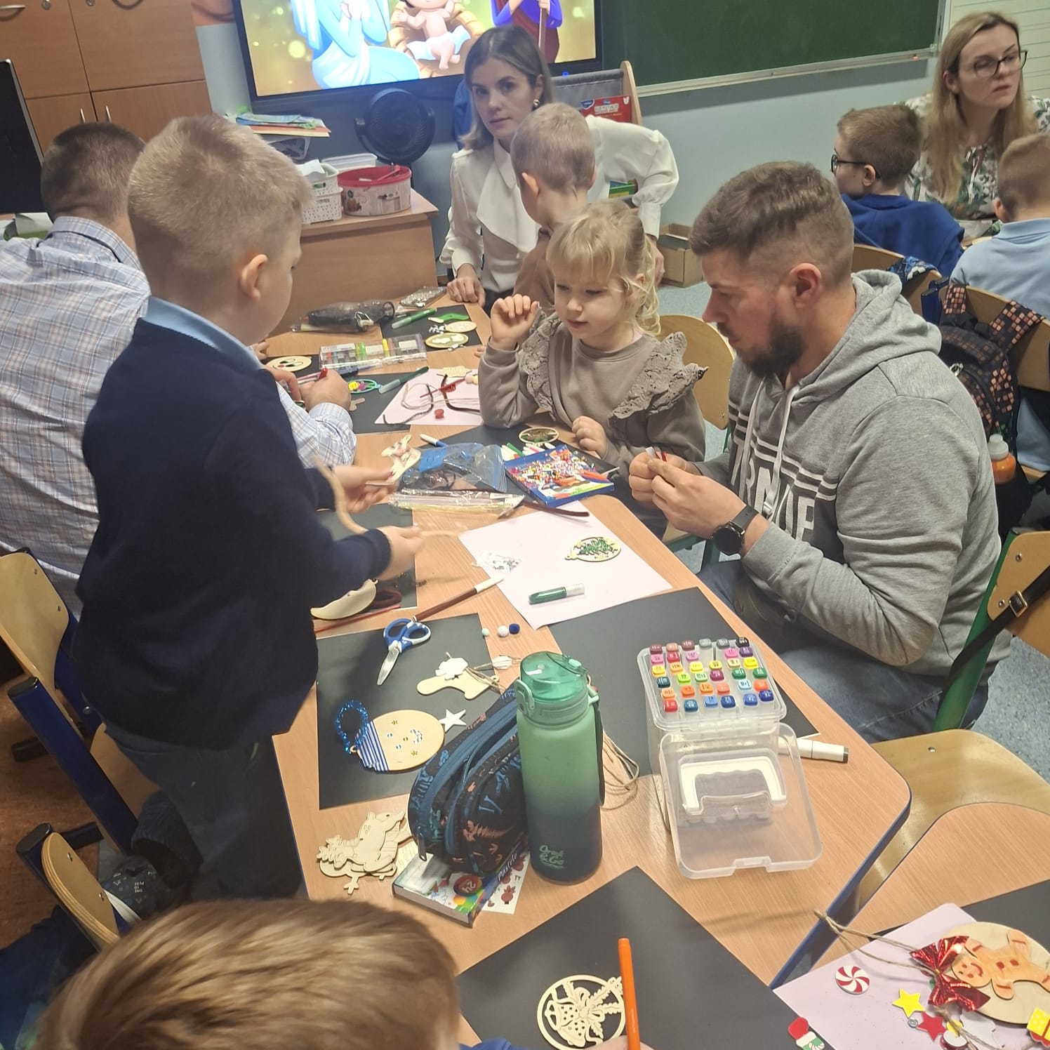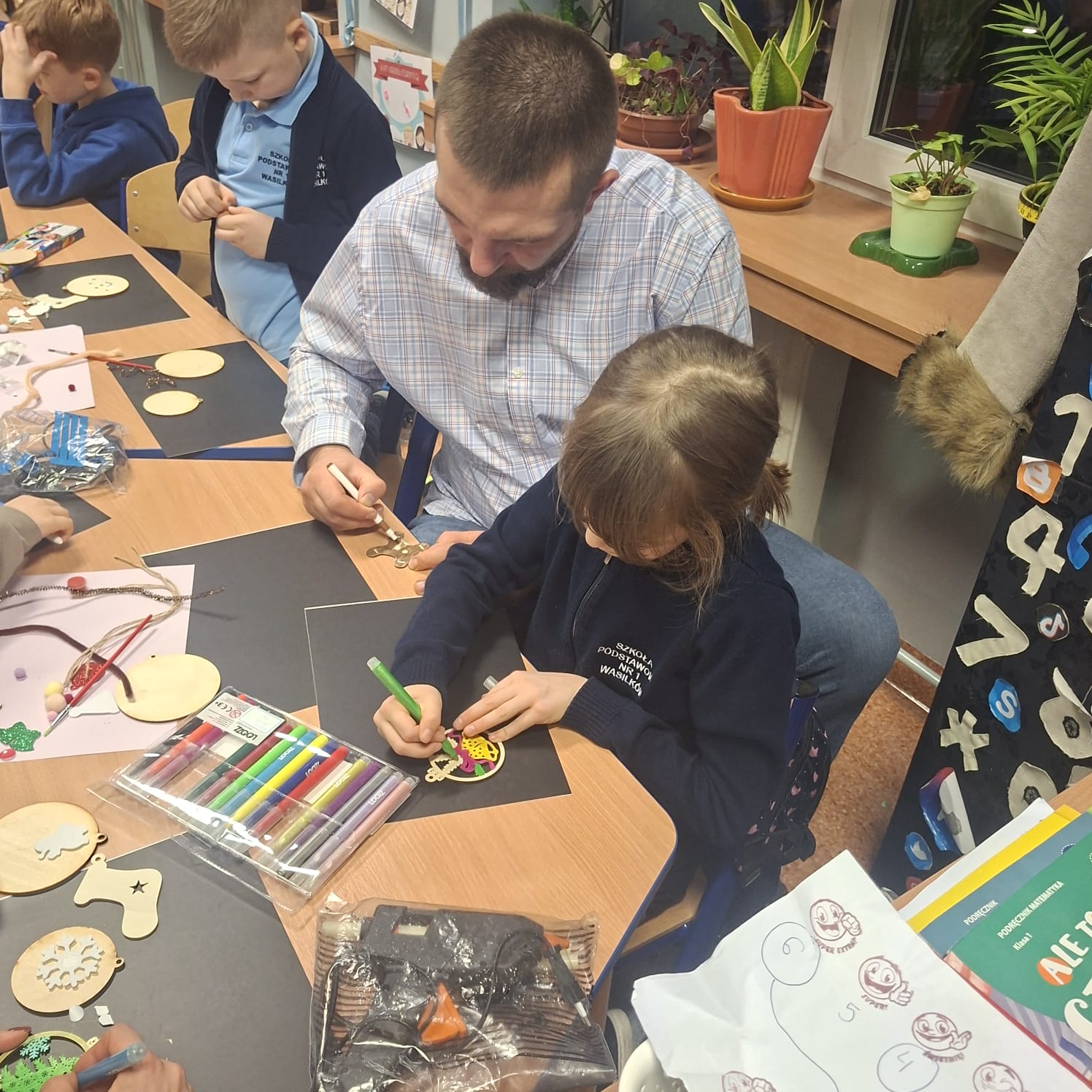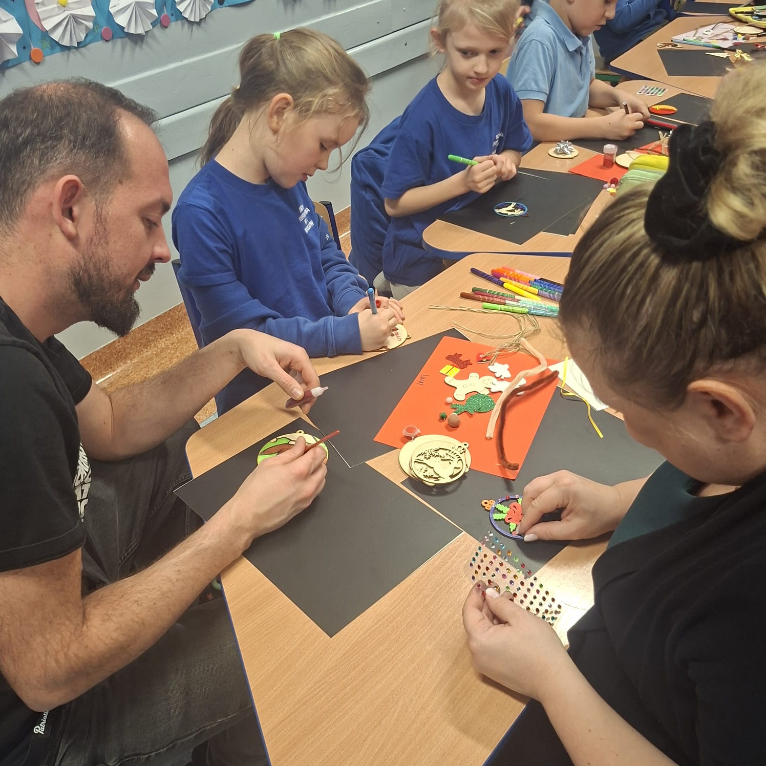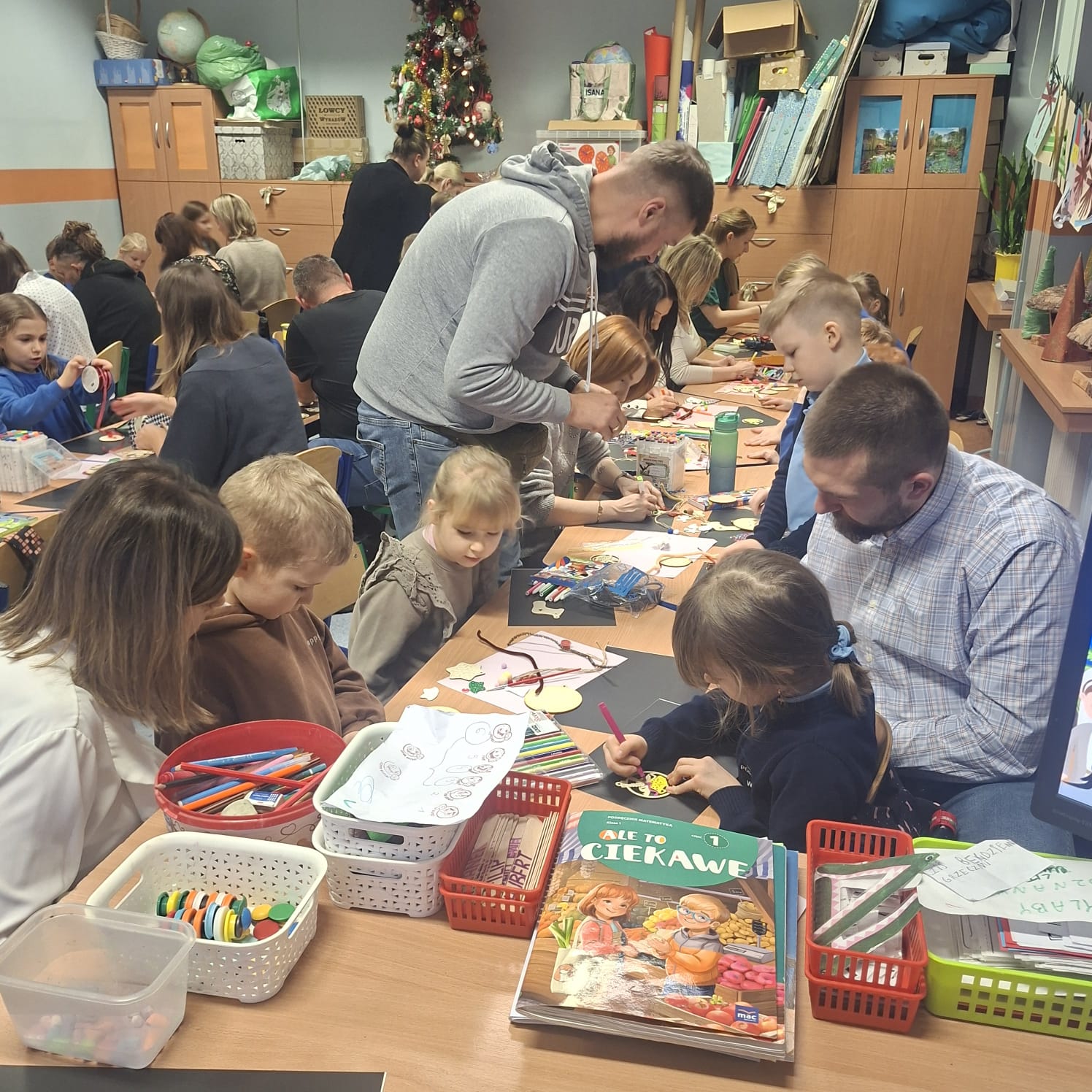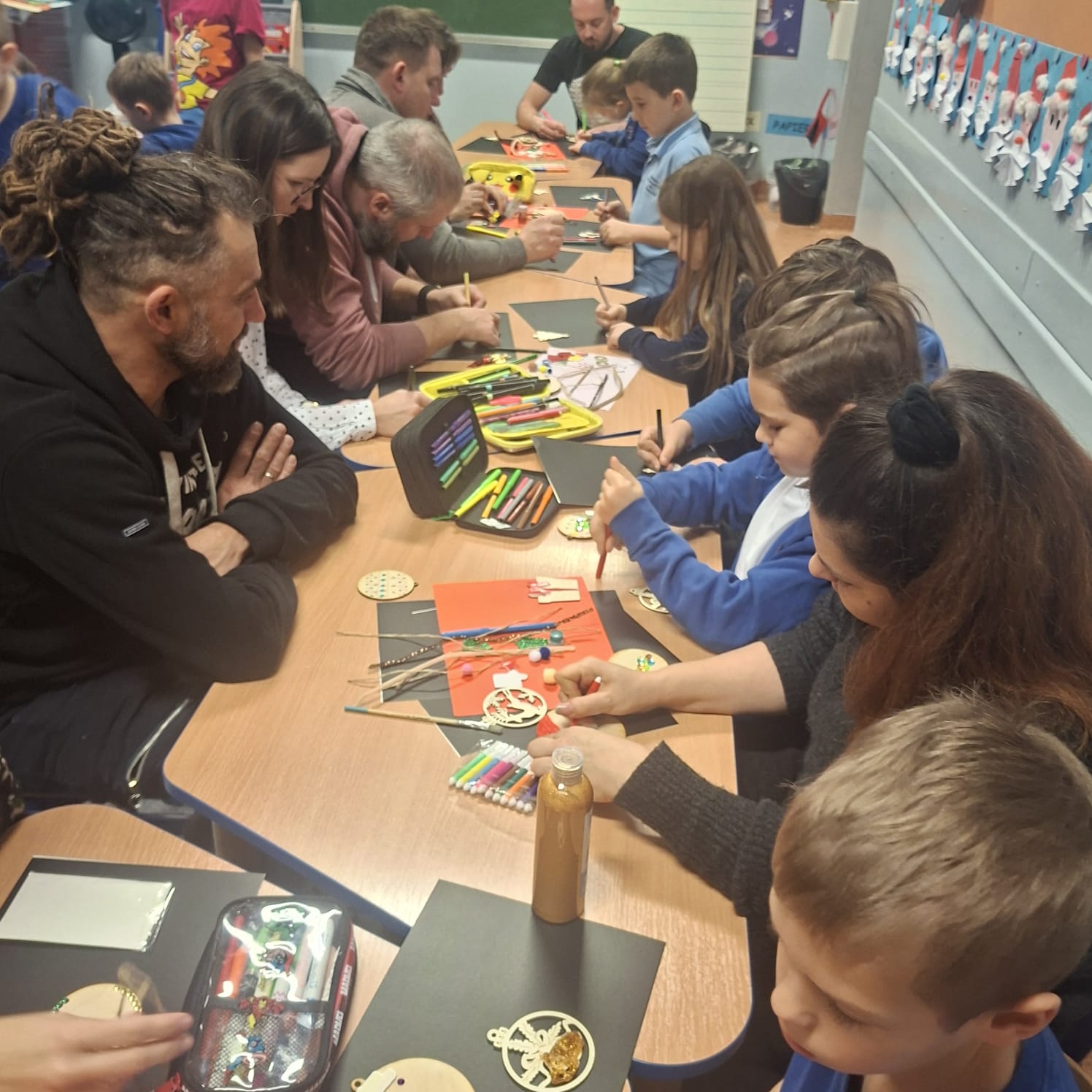 Uczniowie klasy 1a wraz z rodzicami spotkali się na wyjątkowych, pełnych świątecznej atmosfery warsztatach bożonarodzeniowych. Na stołach czekały przygotowane materiały: drewniane krążki, farby, brokaty, kolorowe sznurki oraz świąteczne dodatki.