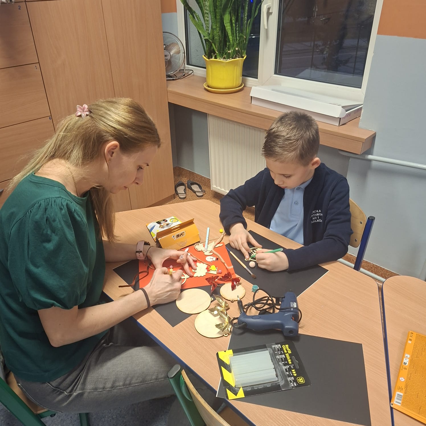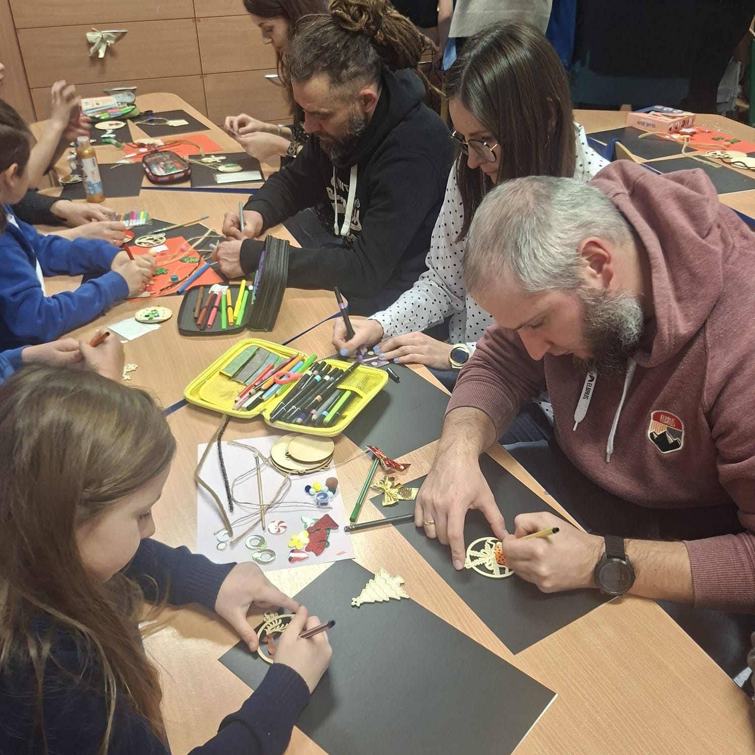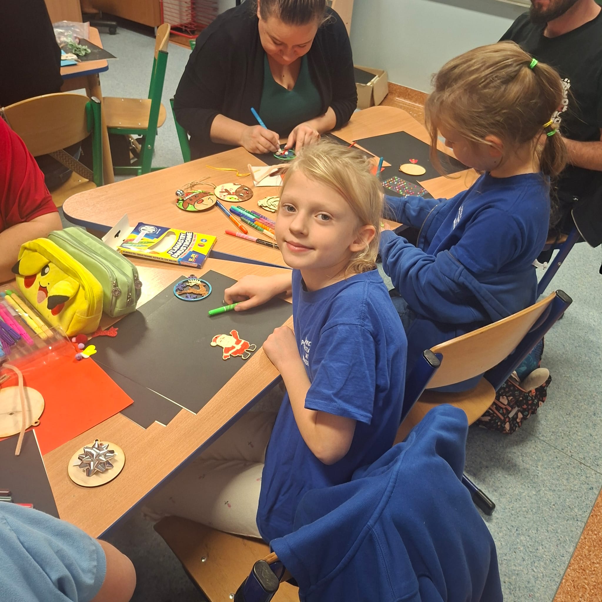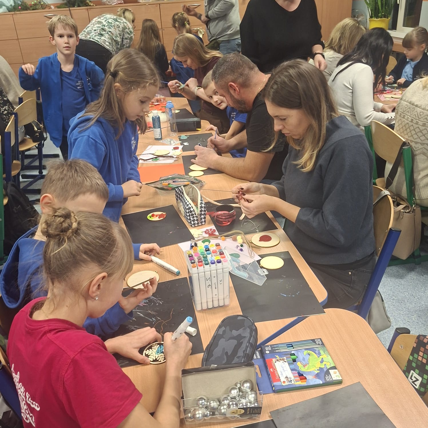 Uczniowie klasy 1a wraz z rodzicami spotkali się na wyjątkowych, pełnych świątecznej atmosfery warsztatach bożonarodzeniowych. Na stołach czekały przygotowane materiały: drewniane krążki, farby, brokaty, kolorowe sznurki oraz świąteczne dodatki.