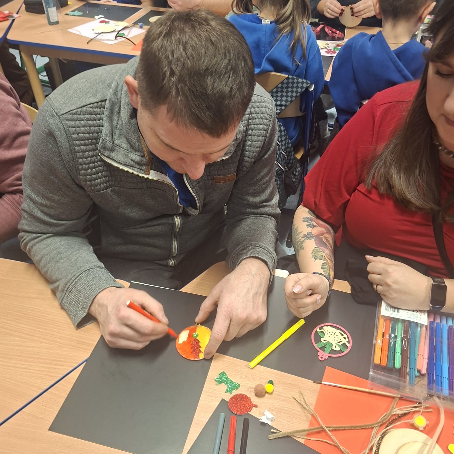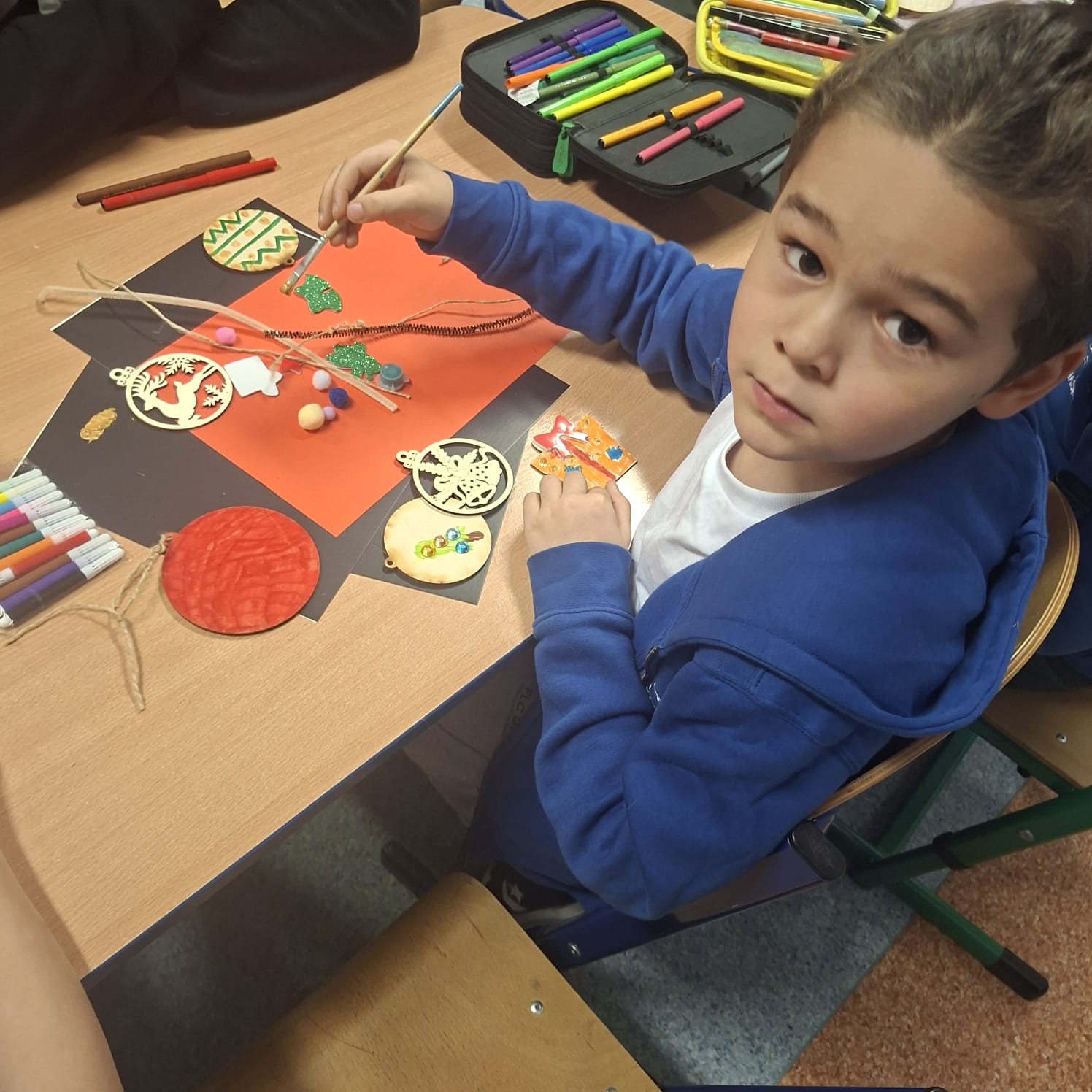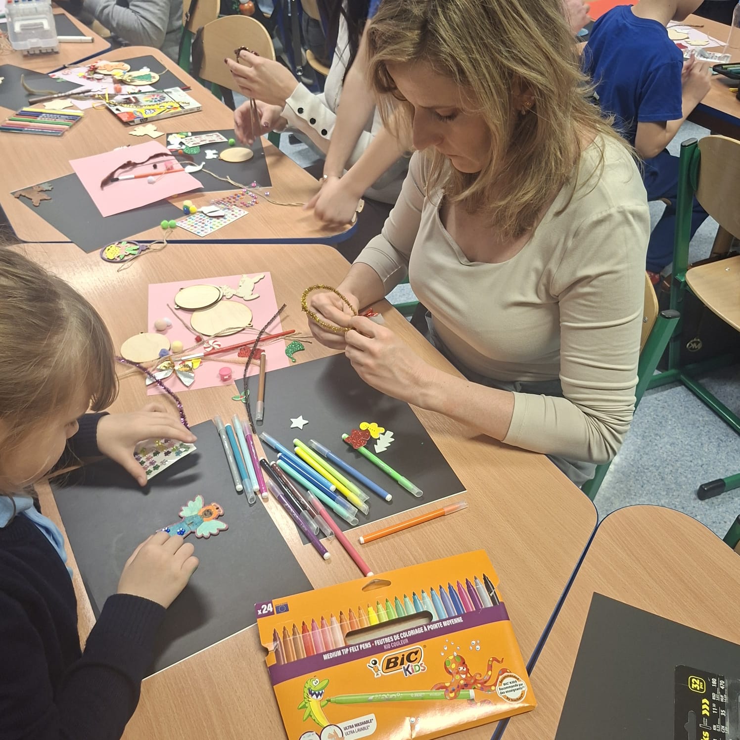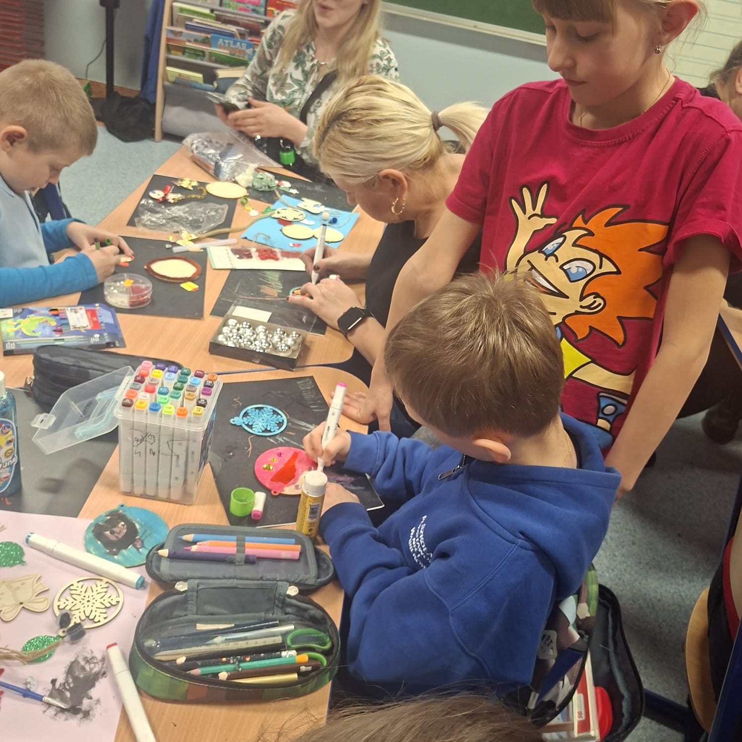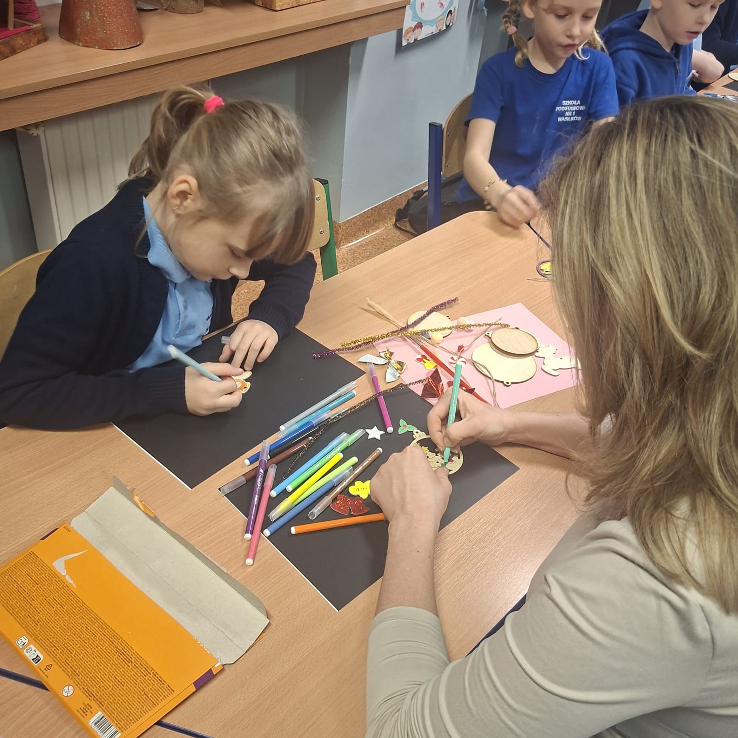 Uczniowie klasy 1a wraz z rodzicami spotkali się na wyjątkowych, pełnych świątecznej atmosfery warsztatach bożonarodzeniowych. Na stołach czekały przygotowane materiały: drewniane krążki, farby, brokaty, kolorowe sznurki oraz świąteczne dodatki.