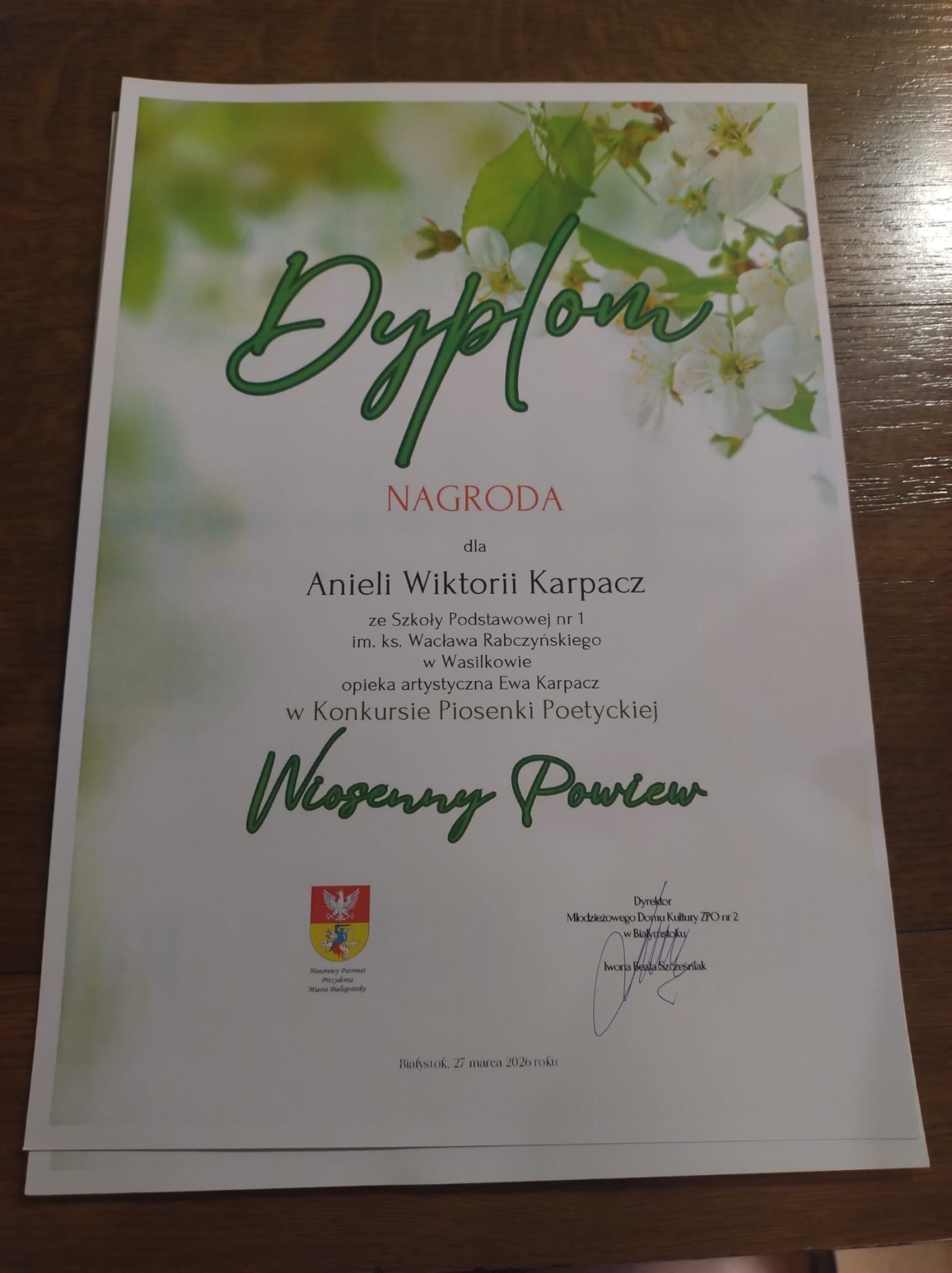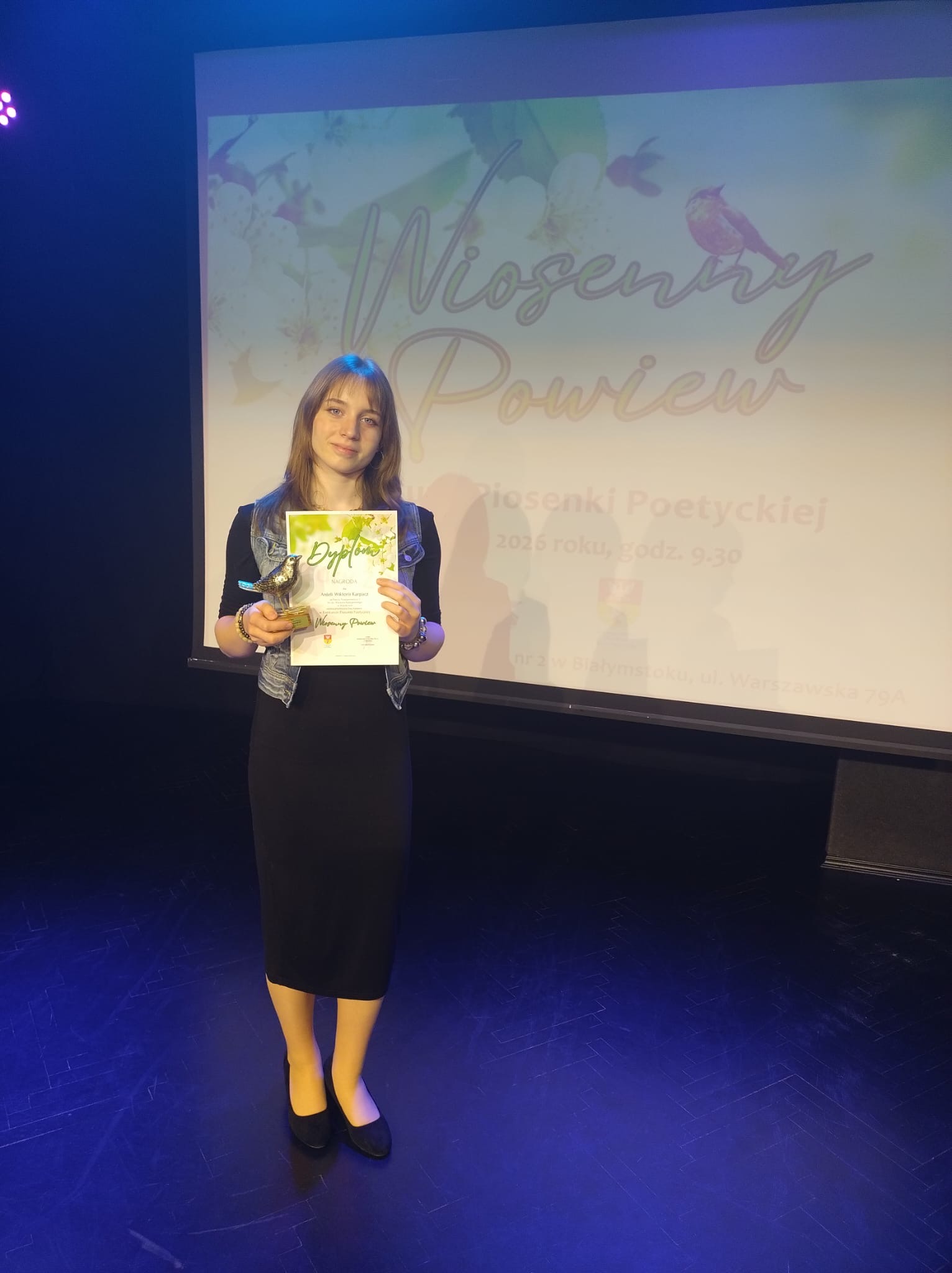 W miniony piątek uczniowie naszej szkoły brali udział w Wojewódzkim Konkursie Wokalnym "Wiosenny Powiew" organizowanym przez Młodzieżowy Dom Kultury w Białymstoku. Tym razem Aniela Karpacz - swoją interpretacją piosenki "Oczy tej Małej" - wyśpiewała nagrodę, a nasi Milusińscy z klasy czwartej - Apolonia Zabłocka i Szymon Trochimczyk, dostali zasłużone brawa za przesubtelny wykon i pierwszą próbę śpiewu w dwugłosie.