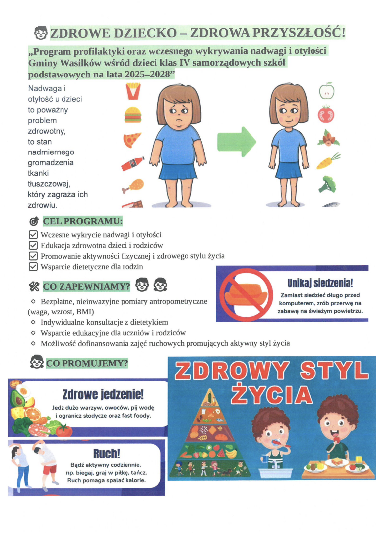 Zdrowie dzieci to jedna z najwyższych wartości dla każdego społeczeństwa. Niestety coraz częstszym problemem zdrowotnym wśród najmłodszych staje się nadwaga i otyłość. Ich przyczyny są złożone – obejmują zarówno czynniki genetyczne, jak i środowiskowe, w tym niewłaściwe nawyki żywieniowe oraz brak aktywności fizycznej. Zjawisko to ma charakter narastający, a Polska znajduje się w niechlubnej czołówce krajów europejskich pod względem tempa przyrostu masy ciała u dzieci. W odpowiedzi na ten alarmujący trend, Gmina Wasilków wdraża „Program profilaktyki oraz wczesnego wykrywania nadwagi i otyłości Gminy Wasilków wśród dzieci klas IV samorządowych szkół podstawowych na lata 2025-2028”.