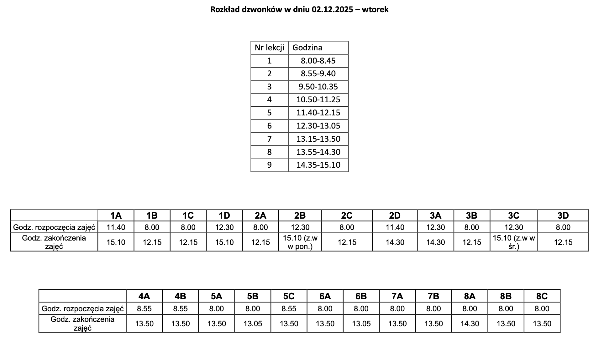 Zmiana rozkładu dzwonków - 2 grudnia 2025